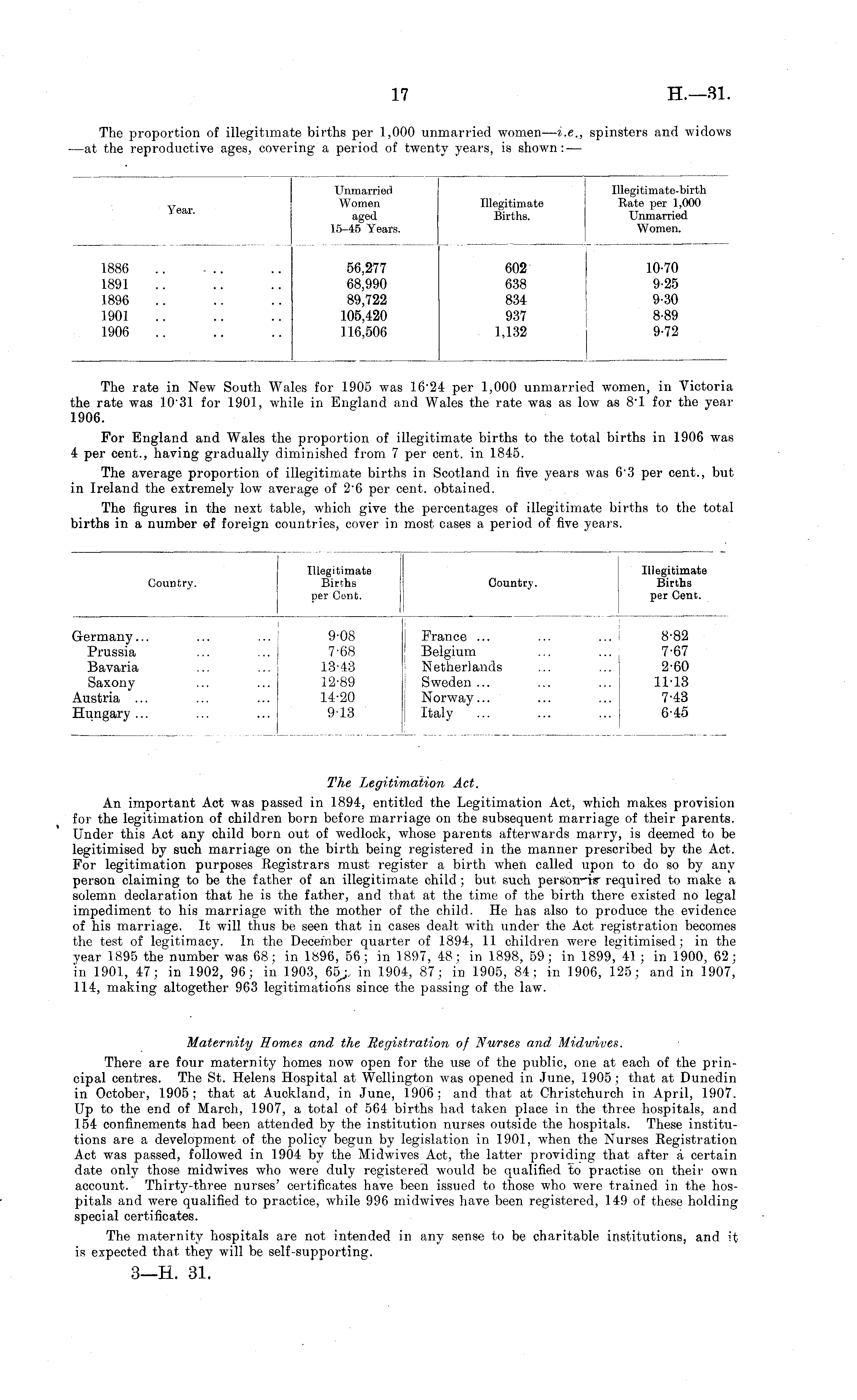 The Legitimation Act. An important Act was passed in 1894, entitled the Legitimation Act, which makes provision for the legitimation of children born before marriage on the subsequent marriage of their parents. Under this Act any child born out of wedlock, whose parents afterwards marry, is deemed to be legitimised by such marriage on the birth being registered in the manner prescribed by the Act. For legitimation purposes Registrars must register a birth when called upon to do so by any person claiming to be the father of an illegitimate child; but such person is required to make a solemn declaration that he is the father, and that at the time of the birth there existed no legal impediment to his marriage with the mother of the child. He has also to produce the evidence of his marriage. It will thus be seen that in cases dealt with under the Act registration becomes the test of legitimacy. In the December quarter of 1894, 11 children were legitimised; in the year 1895 the number was 68; in 1896, 56; in 1897, 48; in 1898, 59; in 1899, 41; in 1900, 62; in 1901, 47; in 1902, 96; in 1903, 65j. in 1904, 87; in 1905, 84; in 1906, 125; and in 1907, 114, making altogether 963 legitimations since the passing of the law. Maternity Homes and the Registration of Nurses and Midwives. There are four maternity homes now open for the use of the public, one at each of the principal centres. The St. Helens Hospital at Wellington was opened in June, 1905 ; that at Dunedin in October, 1905; that at Auckland, in June, 1906; and that at Christchurch in April, 1907. Up to the end of March, 1907, a total of 564 births had taken place in the three hospitals, and 154 confinements had been attended by the institution nurses outside the hospitals. These institutions are a development of the policy begun by legislation in 1901, when the Nurses Registration Act was passed, followed in 1904 by the Midwives Act, the latter providing that after a certain date only those midwives who were duly registered would be qualified to practise on their own account. Thirty-three nurses' certificates have been issued to those who were trained in the hospitals and were qualified to practice, while 996 midwives have been registered, 149 of these holding special certificates. The maternity hospitals are not intended in any sense to be charitable institutions, and it is expected that they will be self-supporting.