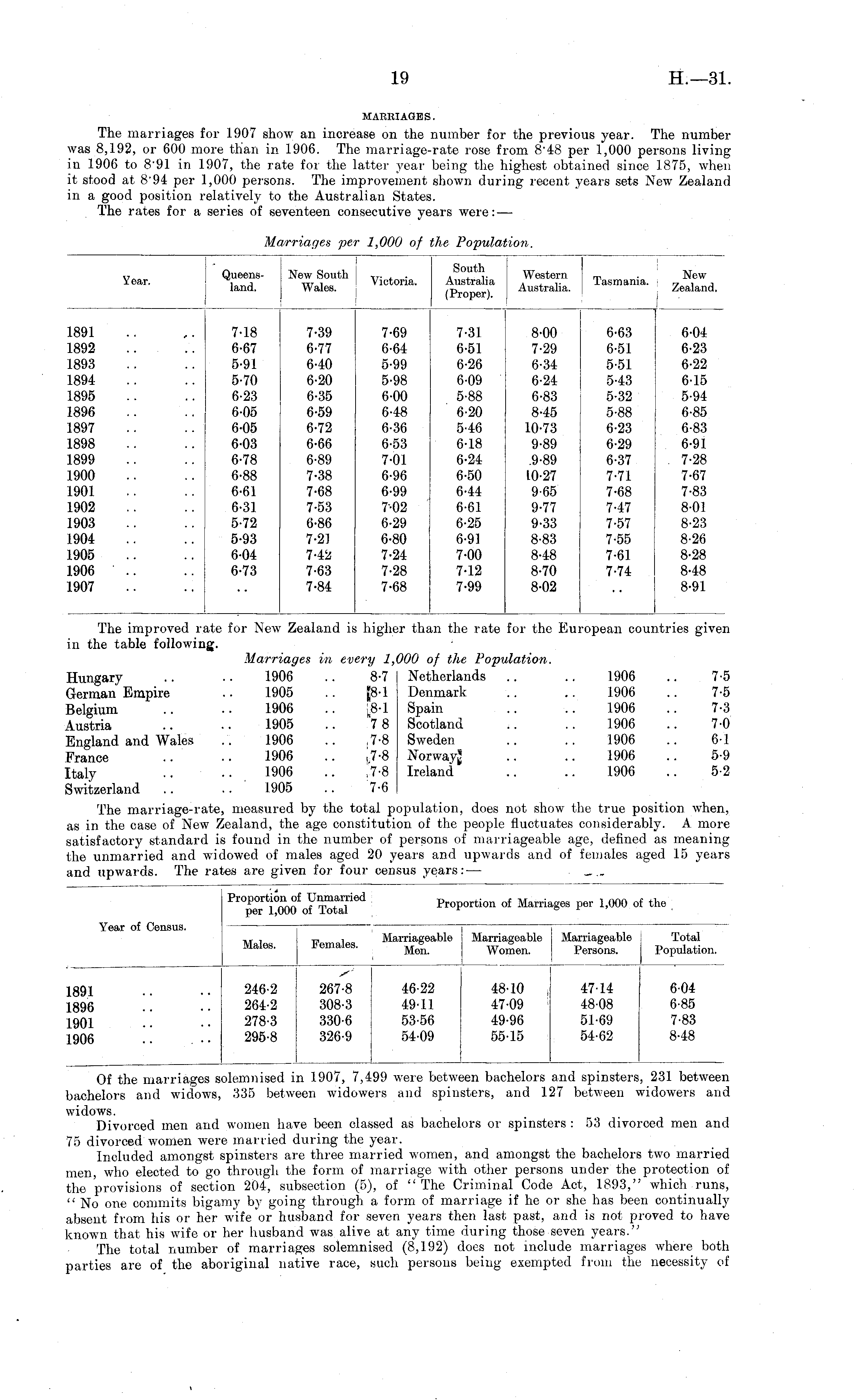 MARRIAGES. The marriages for 1907 show an increase on the number for the previous year. The number was 8,192, or 600 more than in 1906. The marriage-rate rose from B'4B per 1,000 persons living in 1906 to B'9l in 1907, the rate for the latter year being the highest obtained since 1875, when it stood at 894 per 1,000 persons. The improvement shown during recent years sets New Zealand in a good position relatively to the Australian States. The rates for a series of seventeen consecutive years were: —