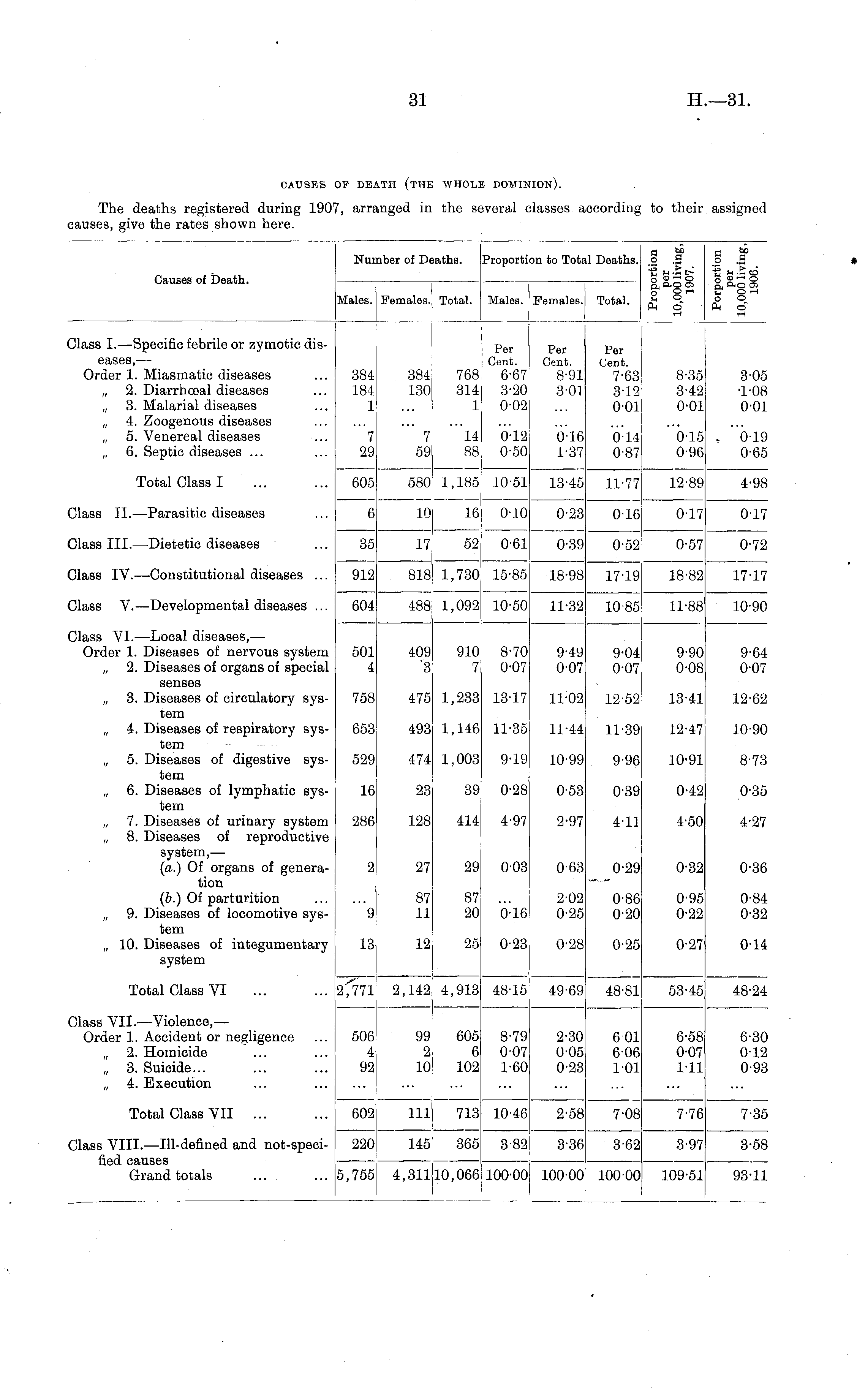 CAUSES OF DEATH (THE WHOLE DOMINION). The deaths registered during 1907, arranged in the several classes according to their assigned causes, give the rates shown here.