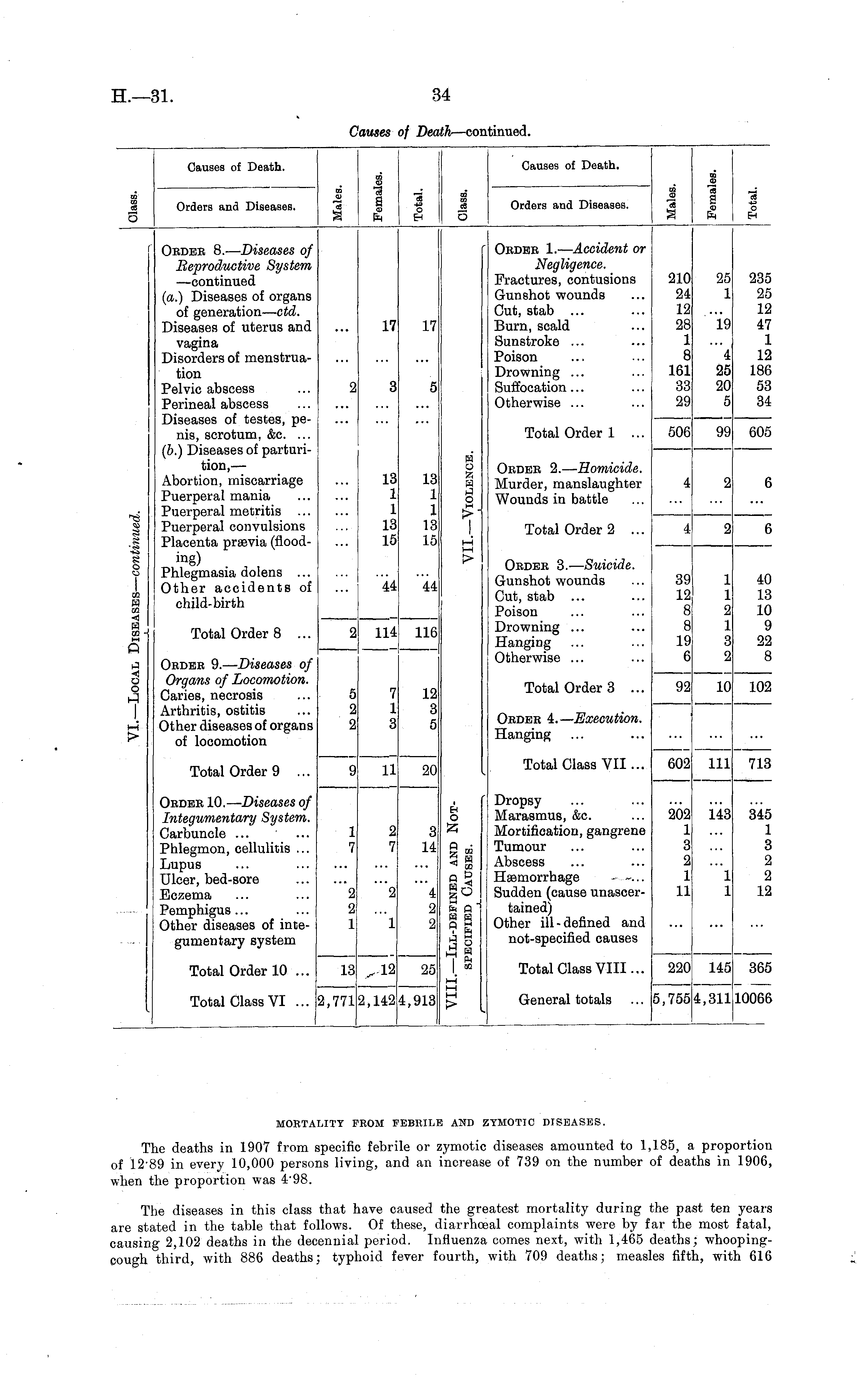 Causes of Death. i I 1 Causes of Death. ID 0J m a I i Orders and Diseases. i o Orders and Diseases. 1 o H Order 8. — Diseases of Reproductive System —continued (a.) Diseases of organs of generation— ctd. Diseases of uterus and vagina Disorders of menstruation Pelvic abscess Perineal abscess Diseases of testes, penis, scrotum, &c. ... (b.) Diseases of parturition, — Abortion, miscarriage Puerperal mania Puerperal metritis ... Puerperal convulsions Placenta preevia (flooding) Phlegmasia dolens ... Other accidents of child-birth 17 17 Order 1.— Accident or Negligence. Fractures, contusions Gunshot wounds Cut, stab ... Burn, scald Sunstroke ... Poison Drowning ... Suffocation... Otherwise ... 210 24 12 28 1 8 161 33 29 25 1 19 235 25 12 47 1 12 186 53 34 2 3 5 4 25 20 5 Total Order 1 ... 506 99 605 13 1 1 13 15 13 1 1 13 15 H O 'A a a 2 h-i H t> Order 2. — Homicide. Murder, manslaughter Wounds in battle 4 2 6 li a *** a 8 oo H CO to I-H "44 44 Total Order 2 ... Order 3.— Suicide. Gunshot wounds Cut, stab ... Poison Drowning ... Hanging ... Otherwise ... 4 39 12 8 8 19 6 2 1 1 6 40 13 10 9 22 8 Total Order 8 ... 2 114 116 1 3 2 o Ordek 9. — Diseases of Organs of Locomotion. Caries, necrosis Arthritis, ostitis Other diseases of organs of locomotion 5 2 2 7 1 3 12 3 5 Total Order 3 ... 92 10 102 Order 4.— Execution. Hanging Total Order 9 ... Total Class VII... 602 111 713 9 11 20 Order 10.— Diseases of Integumentary System. Carbuncle ... Phlegmon, cellulitis ... Lupus Ulcer, bed-sore Eczema Pemphigus ... Other diseases of integumentary system 1 7 2 7 3 14 O 53 li P E Q p p I I. m hH I—I M > Dropsy Marasmus, &c. Mortification, gangrene Tumour Abscess Hemorrhage Sudden (cause unascertained) Other ill - defined and not-specified causes 202 1 3 2 1 11 143 1 1 345 1 3 2 2 12 2 2 1 '"2 1 4 2 2 Total Order 10 ... 13 .-12 25 Total Class VIII... 220 145 365 Total Class VI ... 2,771 2,142 4,913 General totals 5,755 4,311 10066