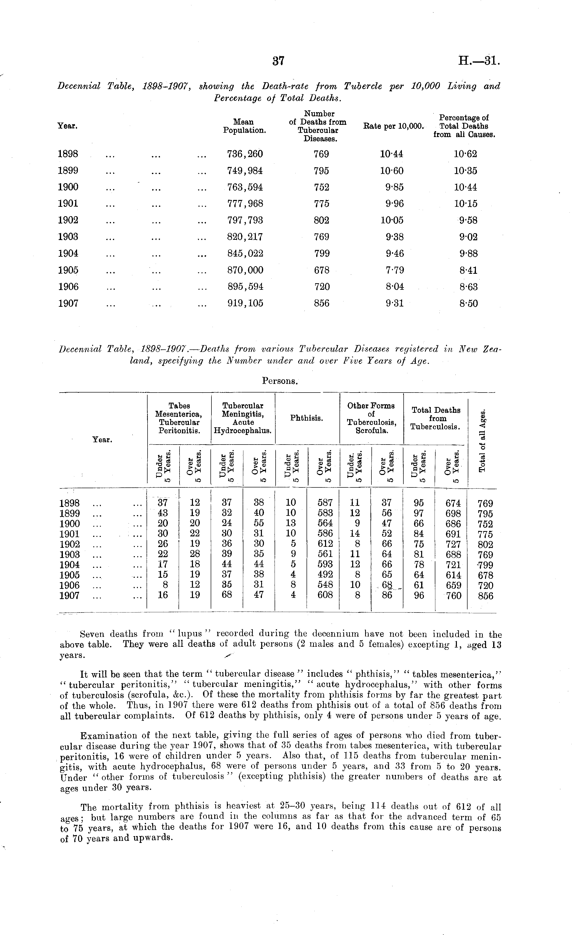 Seven deaths from " lupus " recorded during the decennium have not been included in the above table. They were all deaths of adult persons (2 males and 5 females) excepting 1, aged 13 years. It will be seen that the term " tubercular disease " includes " phthisis," " tables mesenterica," "tubercular peritonitis," "tubercular meningitis," "acute hydrocephalus," with other forms of tuberculosis (scrofula, &c). Of these the mortality from phthisis forms by far the greatest part of the whole. Thus, in 1907 there were 612 deaths from phthisis out of a total of 856 deaths from all tubercular complaints. Of 612 deaths by phthisis, only 4 were of persons under 5 years of age. Examination of the next table, giving the full series of ages of persons who died from tubercular disease during the year 1907, shows that of 35 deaths from tabes mesenterica, with tubercular peritonitis, 16 were of children under 5 years. Also that, of 115 deaths from tubercular meningitis, with acute hydrocephalus, 68 were of persons under 5 years, and 33 from 5 to 20 years. Under "other forms of tuberculosis" (excepting phthisis) the greater numbers of deaths are at ages under 30 years. The mortality from phthisis is heaviest at 25-30 years, being 114 deaths out of 612 of all ages; but large numbers are found in the columns as far as that for the advanced term of 65 to 75 years, at which the deaths for 1907 were 16, and 10 deaths from this cause are of persons of 70 years and upwards.