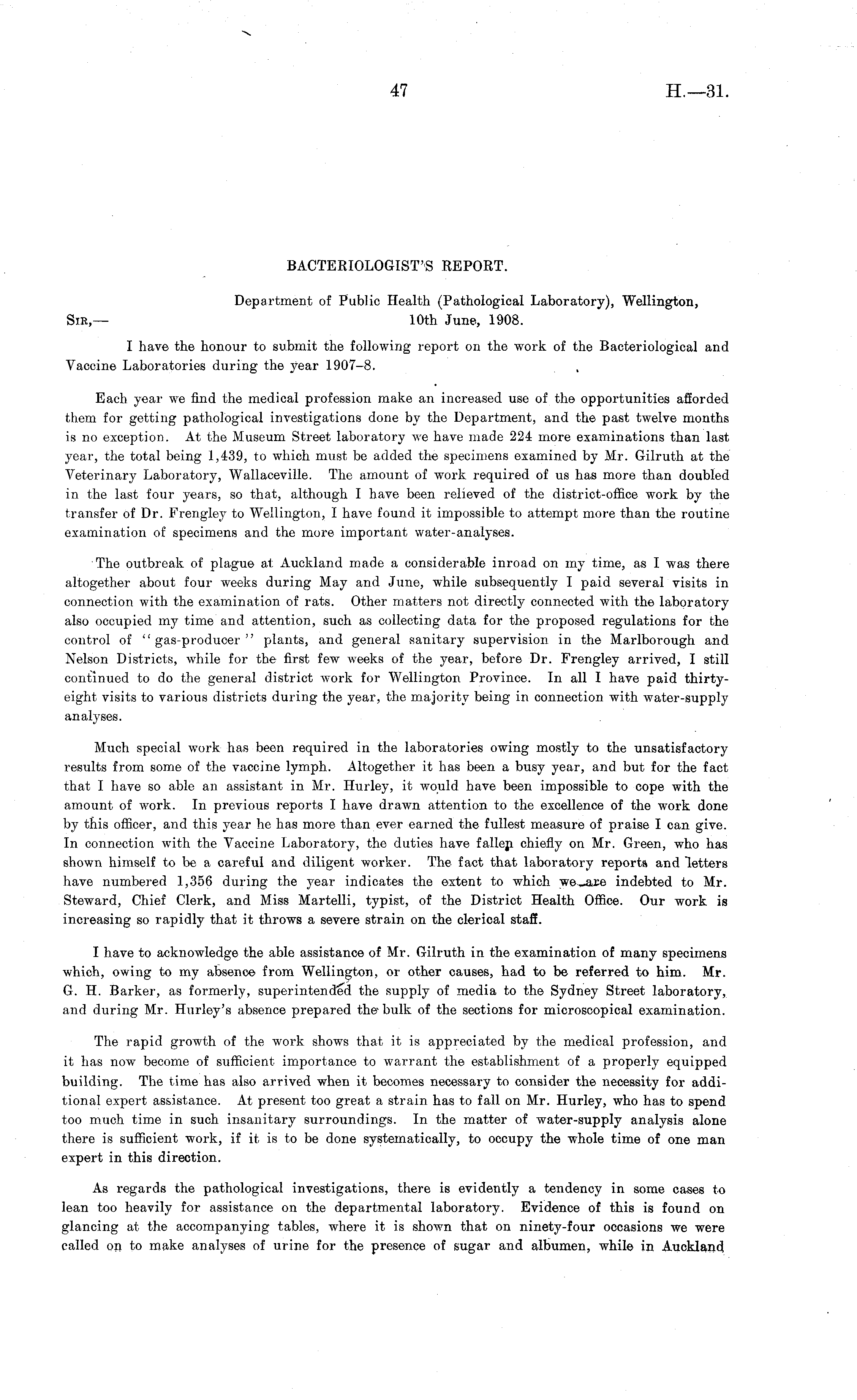 BACTERIOLOGIST'S REPORT. Department of Public Health (Pathological Laboratory), Wellington, Sir,— 10th June, 1908. I have the honour to submit the following report on the work of the Bacteriological and Vaccine Laboratories during the year 1907-8. Each year we find the medical profession make an increased use of the opportunities afforded them for getting pathological investigations done by the Department, and the past twelve months is no exception. At the Museum Street laboratory we have made 224 more examinations than last year, the total being 1,439, to which must be added the specimens examined by Mr. Gilruth at the Veterinary Laboratory, Wallaceville. The amount of work required of us has more than doubled in the last four years, so that, although I have been relieved of the district-office work by the transfer of Dr. Frengley to Wellington, I have found it impossible to attempt more than the routine examination of specimens and the more important water-analyses. The outbreak of plague at Auckland made a considerable inroad on my time, as I was there altogether about four weeks during May and June, while subsequently I paid several visits in connection with the examination of rats. Other matters not directly connected with the laboratory also occupied my time and attention, such as collecting data for the proposed regulations for the control of "gas-producer" plants, and general sanitary supervision in the Marlborough and Nelson Districts, while for the first few weeks of the year, before Dr. Frengley arrived, I still continued to do the general district work for Wellington Province. In all I have paid thirtyeight visits to various districts during the year, the majority being in connection with water-supply analyses. Much special work has been required in the laboratories owing mostly to the unsatisfactory results from some of the vaccine lymph. Altogether it has been a busy year, and but for the fact that I have so able an assistant in Mr. Hurley, it would have been impossible to cope with the amount of work. In previous reports I have drawn attention to the excellence of the work done by this officer, and this year he has more than ever earned the fullest measure of praise I can give. In connection with the Vaccine Laboratory, the duties have fallen chiefly on Mr. Green, who has shown himself to be a careful and diligent worker. The fact that laboratory reports and letters have numbered 1,356 during the year indicates the extent to which we are indebted to Mr. Steward, Chief Clerk, and Miss Martelli, typist, of the District Health Office. Our work is increasing so rapidly that it throws a severe strain on the clerical staff. I have to acknowledge the able assistance of Mr. Gilruth in the examination of many specimens which, owing to my absence from Wellington, or other causes, had to be referred to him. Mr. G. H. Barker, as formerly, superintended the supply of media to the Sydney Street laboratory, and during Mr. Hurley's absence prepared the bulk of the sections for microscopical examination. The rapid growth of the work shows that it is appreciated by the medical profession, and it has now become of sufficient importance to warrant the establishment of a properly equipped building. The time has also arrived when it becomes necessary to consider the necessity for additional expert assistance. At present too great a strain has to fall on Mr. Hurley, who has to spend too much time in such insanitary surroundings. In the matter of water-supply analysis alone there is sufficient work, if it is to be done systematically, to occupy the whole time of one man expert in this direction. As regards the pathological investigations, there is evidently a tendency in some cases to lean too heavily for assistance on the departmental laboratory. Evidence of this is found on glancing at the accompanying tables, where it is shown that on ninety-four occasions we were called on to make analyses of urine for the presence of sugar and albumen, while in Auckland