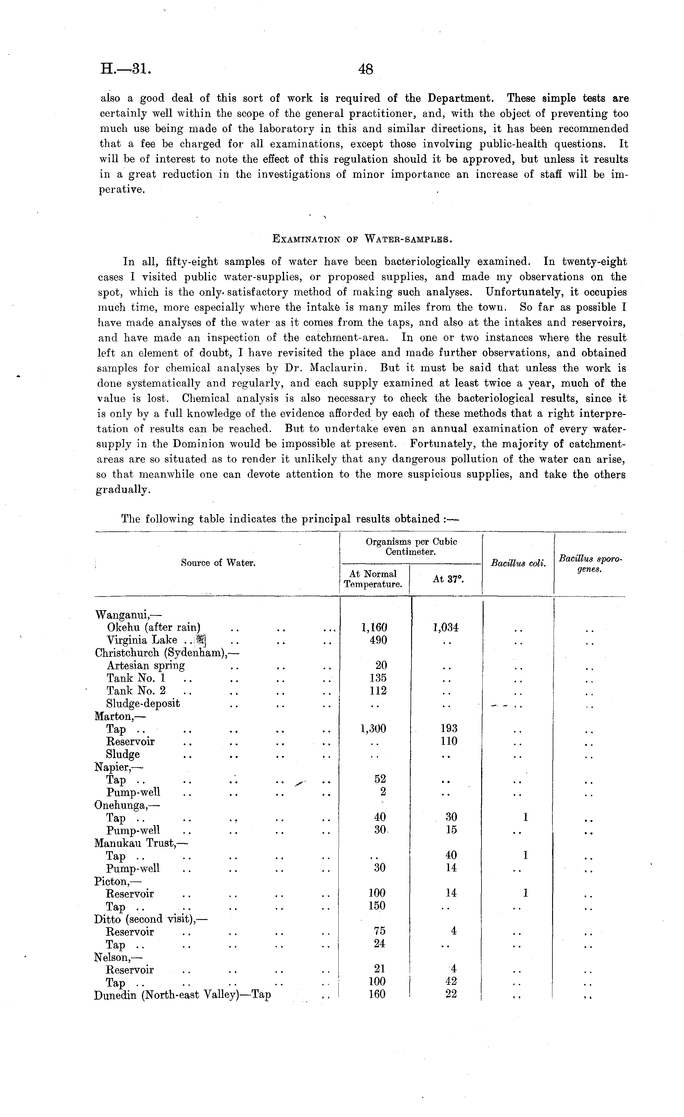 also a good deal of this sort of work is required of the Department. These simple tests are certainly well within the scope of the general practitioner, and, with the object of preventing too much use being made of the laboratory in this and similar directions, it has been recommended that a fee be charged for all examinations, except those involving public-health questions. It will be of interest to note the effect of this regulation should it be approved, but unless it results in a great reduction in the investigations of minor importance an increase of staff will be imperative. Examination of Water-samples. In all, fifty-eight samples of water have been bacteriologically examined. In twenty-eight cases I visited public water-supplies, or proposed supplies, and made my observations on the spot, which is the only, satisfactory method of making such analyses. Unfortunately, it occupies much time, more especially where the intake is many miles from the town. So far as possible I have made analyses of the water as it comes from the taps, and also at the intakes and reservoirs, and have made an inspection of the catchment-area. In one or two instances where the result left an element of doubt, I have revisited the place and made further observations, and obtained samples for chemical analyses by Dr. Maclauri.n. But it must be said that unless the work is done systematically and regularly, and each supply examined at least twice a year, much of the value is lost. Chemical analysis is also necessary to check the bacteriological results, since it is only by a full knowledge of the evidence afforded by each of these methods that a right interpretation of results can be reached. But to undertake even an annual examination of every watersupply in the Dominion would be impossible at present. Fortunately, the majority of catchmentareas are so situated as to render it unlikely that any dangerous pollution of the water can arise, so that meanwhile one can devote attention to the more suspicious supplies, and take the others gradually.