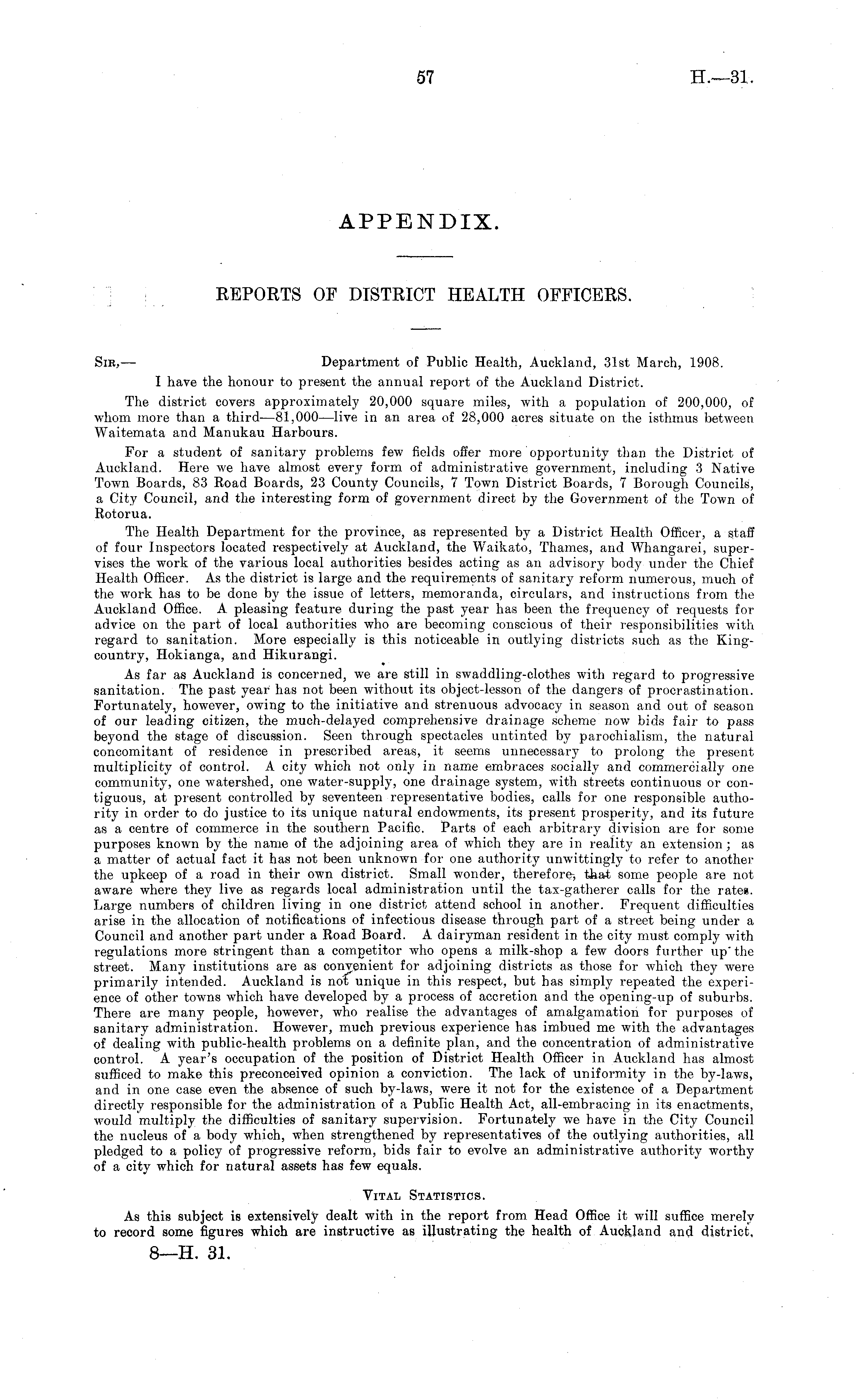 APPENDIX. REPORTS OF DISTRICT HEALTH OFFICERS. Sir, — Department of Public Health, Auckland, 31st March, 1908. I have the honour to present the annual report of the Auckland District. The district covers approximately 20,000 square miles, with a population of 200,000, of whom more than a third —81,000 —live in an area of 28,000 acres situate on the isthmus between Waitemata and Manukau Harbours. For a student of sanitary problems few fields offer more opportunity than the District of Auckland. Here we have almost every form of administrative government, including 3 Native Town Boards, 83 Road Boards, 23 County Councils, 7 Town District Boards, 7 Borough Councils, a City Council, and the interesting form of government direct by the Government of the Town of Rotorua. The Health Department for the province, as represented by a District Health Officer, a staff of four Inspectors located respectively at Auckland, the Waikato, Thames, and Whangarei, supervises the work of the various local authorities besides acting as an advisory body under the Chief Health Officer. As the district is large and the requirements of sanitary 7 reform numerous, much of the work has to be done by the issue of letters, memoranda, circulars, and instructions from the Auckland Office. A pleasing feature during the past year has been the frequency of requests for advice on the part of local authorities who are becoming conscious of their responsibilities with regard to sanitation. More especially is this noticeable in outlying districts such as the Kingcountry, Hokianga, and Hikurangi. As far as Auckland is concerned, we are still in swaddling-clothes with regard to progressive sanitation. The past year has not been without its object-lesson of the dangers of procrastination. Fortunately, however, owing to the initiative and strenuous advocacy in season and out of season of our leading citizen, the much-delayed comprehensive drainage scheme now bids fair to pass beyond the stage of discussion. Seen through spectacles untinted by parochialism, the natural concomitant of residence in prescribed areas, it seems unnecessary to prolong the present multiplicity of control. A city which not only in name embraces socially and commercially one community, one watershed, one water-supply, one drainage system, with streets continuous or contiguous, at present controlled by seventeen representative bodies, calls for one responsible authority in order to do justice to its unique natural endowments, its present prosperity, and its future as a centre of commerce in the southern Pacific. Parts of each arbitrary division are for some purposes known by the name of the adjoining area of which they are in reality an extension; as a matter of actual fact it has not been unknown for one authority unwittingly to refer to another the upkeep of a road in their own district. Small wonder, therefore, that some people are not aware where they live as regards local administration until the tax-gatherer calls for the rate*. Large numbers of children living in one district attend school in another. Frequent difficulties arise in the allocation of notifications of infectious disease through part of a street being under a Council and another part under a Road Board. A dairyman resident in the city must comply with regulations more stringent than a competitor who opens a milk-shop a few doors further up" the street. Many institutions are as convenient for adjoining districts as those for which they were primarily intended. Auckland is not unique in this respect, but has simply repeated the experience of other towns which have developed by a process of accretion and the opening-up of suburbs. There are many people, however, who realise the advantages of amalgamation for purposes of sanitary administration. However, much previous experience has imbued me with the advantages of dealing with public-health problems on a definite plan, and the concentration of administrative control. A year's occupation of the position of District Health Officer in Auckland has almost sufficed to make this preconceived opinion a conviction. The lack of uniformity in the by-laws, and in one case even the absence of such by-laws, were it not for the existence of a Department directly responsible for the administration of a Public Health Act, all-embracing in its enactments, would multiply the difficulties of sanitary supervision. Fortunately we have in the City Council the nucleus of a body which, when strengthened by representatives of the outlying authorities, all pledged to a policy of progressive reform, bids fair to evolve an administrative authority worthy of a city which for natural assets has few equals. Vital Statistics. As this subject is extensively dealt with in the report from Head Office it will suffice merely to record some figures which are instructive as illustrating the health of Auckland and district,