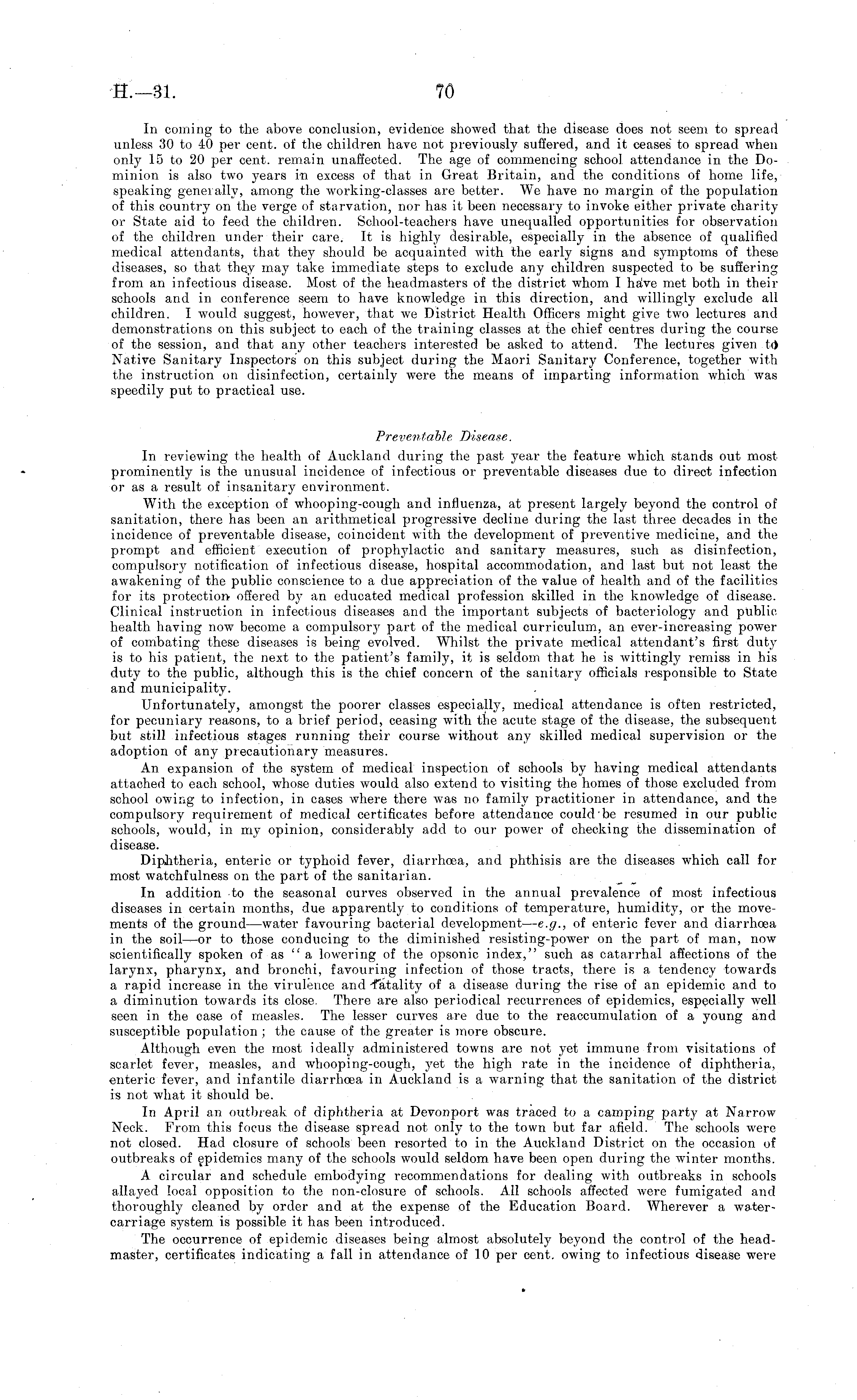 In coming to the above conclusion, evidence showed that the disease does not seem to spread unless 30 to 40 per cent, of the children have not previously suffered, and it ceases to spread when only 15 to 20 per cent, remain unaffected. The age of commencing school attendance in the Dominion is also two years in excess of that in Great Britain, and the conditions of home life, speaking generally, among the working-classes are better. We have no margin of the population of this country on the verge of starvation, nor has it been necessary to invoke either private charity or State aid to feed the children. School-teachers have unequalled opportunities for observation of the children under their care. It is highly desirable, especially in the absence of qualified medical attendants, that they should be acquainted with the early signs and symptoms of these diseases, so that they may take immediate steps to exclude any children suspected to be suffering from an infectious disease. Most of the headmasters of the district whom I have met both in their schools and in conference seem to have knowledge in this direction, and willingly exclude all children. I would suggest, however, that we District Health Officers might give two lectures and demonstrations on this subject to each of the training classes at the chief centres during the course of the session, and that any other teachers interested be asked to attend. The lectures given t(> Native Sanitary Inspectors on this subject during the Maori Sanitary Conference, together with the instruction on disinfection, certainly were the means of imparting information which was speedily put to practical use. Preventable Disease. In reviewing the health of Auckland during the past year the feature which stands out most prominently is the unusual incidence of infectious or preventable diseases due to direct infection or as a result of insanitary environment. With the exception of whooping-cough and influenza, at present largely beyond the control of sanitation, there has been an arithmetical progressive decline during the last three decades in the incidence of preventable disease, coincident with the development of preventive medicine, and the prompt and efficient execution of prophylactic and sanitary measures, such as disinfection, compulsory notification of infectious disease, hospital accommodation, and last but not least the awakening of the public conscience to a due appreciation of the value of health and of the facilities for its protection offered b}' an educated medical profession skilled in the knowledge of disease. Clinical instruction in infectious diseases and the important subjects of bacteriology and public health having now become a part of the medical curriculum, an ever-increasing power of combating these diseases is being evolved. Whilst the private medical attendant's first duty is to his patient, the next to the patient's family, it is seldom that he is wittingty remiss in his duty to the public, although this is the chief concern of the sanitary officials responsible to State and municipality. Unfortunately, amongst the poorer classes especially, medical attendance is often restricted, for pecuniary reasons, to a brief period, ceasing with the acute stage of the disease, the subsequent but still infectious stages running their course without any skilled medical supervision or the adoption of any precautionary measures. An expansion of the system of medical inspection of schools by having medical attendants attached to each school, whose duties would also extend to visiting the homes of those excluded from school owing to infection, in cases where there was no family practitioner in attendance, and the compulsory requirement of medical certificates before attendance could'be resumed in our public schools, would, in my opinion, considerably add to our power of checking the dissemination of disease. Diphtheria, enteric or typhoid fever, diarrhoea, and phthisis are the diseases which call for most watchfulness on the part of the sanitarian. In addition -to the seasonal curves observed in the annual prevalence of most infectious diseases in certain months, due apparently to conditions of temperature, humidity, or the movements of the ground—water favouring bacterial development— e.g., of enteric fever and diarrhoea in the soil —or to those conducing to the diminished resisting-power on the part of man, now scientifically spoken of as " a lowering of the opsonic index," such as catarrhal affections of the larynx, pharynx, and bronchi, favouring infection of those tracts, there is a tendency towards a rapid increase in the virulence and Natality of a disease during the rise of an epidemic and to a diminution towards its close, There are also periodical recurrences of epidemics, especially well seen in the case of measles. The lesser curves arc due to the reaccumulation of a young and susceptible population ; the cause of the greater is more obscure. Although even the most ideally administered towns are not yet immune from visitations of scarlet fever, measles, and whooping-cough, yet the high rate in the incidence of diphtheria, enteric fever, and infantile diarrhoea in Auckland is a warning that the sanitation of the district is not what it should be. In April an outbreak of diphtheria at Devonport was traced to a camping party at Narrow Neck. From this focus the disease spread not only to the town but far afield. The schools were not closed. Had closure of schools been resorted to in the Auckland District on the occasion of outbreaks of epidemics many of the schools would seldom have been open during the winter months. A circular and schedule embodying recommendations for dealing with outbreaks in schools allayed local opposition to the non-closure of schools. All schools affected were fumigated and thoroughly cleaned by order and at the expense of the Education Board. Wherever a watercarriage system is possible it has been introduc