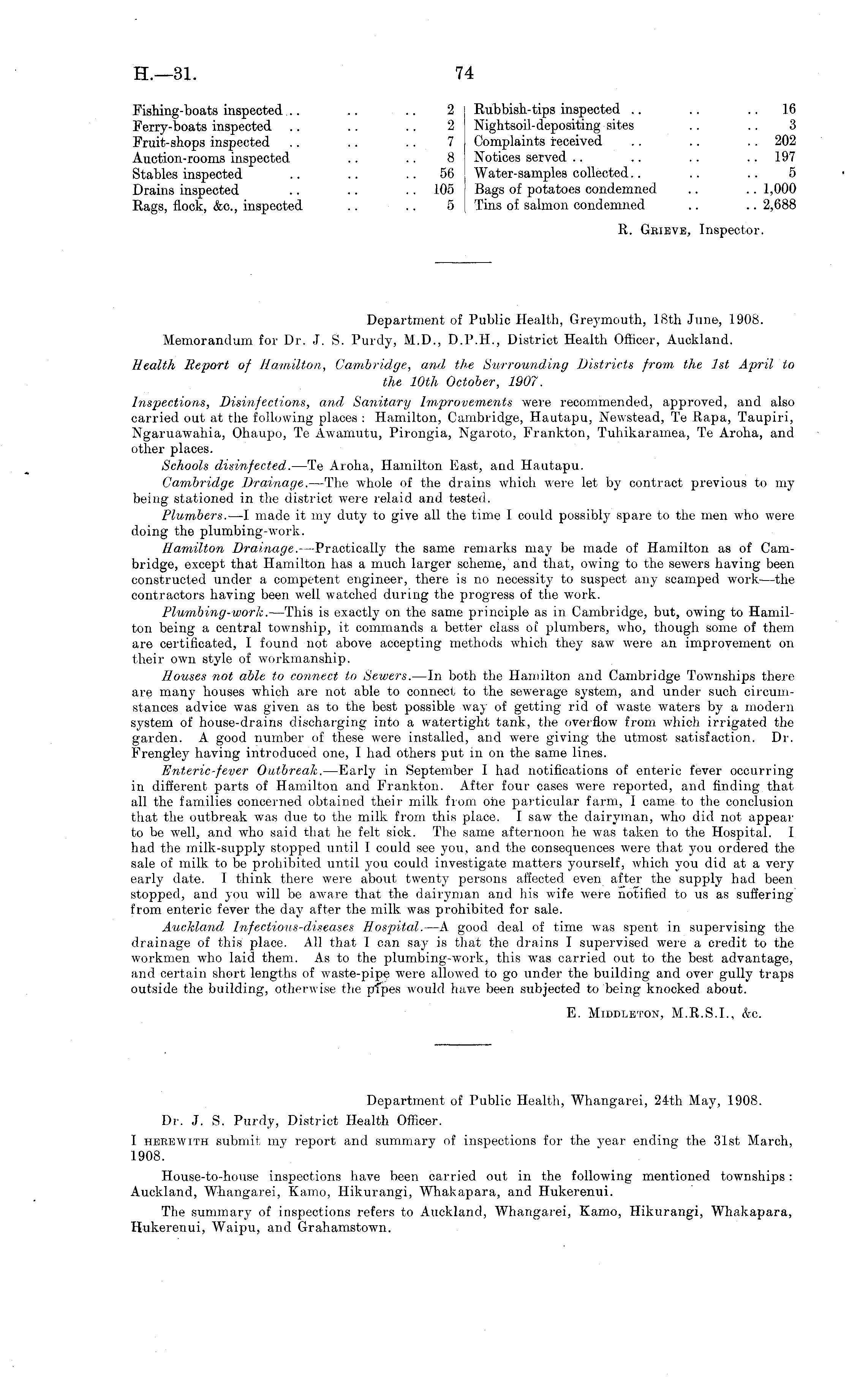 Fishing-boats inspected .. .. .. 2 Rubbish-tips inspected .. .. ..16 Ferry-boats inspected .. .. .. 2 Nightsoil-depositing sites .. .. 3 Fruit-shops inspected .. .. .. 7 Complaints received .. .. .. 202 Auction-rooms inspected .. .. 8 Notices served .. .. .. .. 197 Stables inspected .. .. ..56 Water-samples collected.. .. .. 5 Drains inspected .. .. .. 105 j Bags of potatoes condemned .. .. 1,000 Rags, flock, &c, inspected .. .. 5 [ Tins of salmon condemned .. .. 2,688 R. Grieve, Inspector. Department of Public Health, Grej'mouth, 18th June, 1908. Memorandum for Dr. J. S. Purdy, M.D., D.P.H., District Health Officer, Auckland. Health Report of Hamilton, Cambridge, and the Surrounding Districts from the Ist April to the 10th October, 1907. Inspections, Disinfections, and Sanitary Improvements were recommended, approved, and also carried out at the following places : Hamilton, Cambridge, Hautapu, Newstead, Te Rapa, Taupiri, Ngaruawahia, Ohaupo, Te Awamutu, Pirongia, Ngaroto, Frankton, Tuhikaramea, Te Aroha, and other places. Schools disinfected. —Te Aroha, Hamilton East, and Hautapu. Cambridge Drainage. —The whole of the drains which were let by contract previous to my being stationed in the district were relaid and tested. Plumbers. —I made it my duty to give all the time I could possibly spare to the men who were doing the plumbing-work. Hamilton Drainage. —Practically the same remarks may be made of Hamilton as of Cambridge, except that Hamilton has a much larger scheme, and that, owing to the sewers having been constructed under a competent engineer, there is no necessity to suspect any scamped work—the contractors having been well watched during the progress of the work. Plumb ing-work. —This is exactly on the same principle as in Cambridge, but, owing to Hamilton being a central township, it commands a better class of plumbers, who, though some of them are certificated, I found not above accepting methods which they saw were an improvement on their own style of workmanship. Houses not able to connect to Sewers. —ln both the Hamilton and Cambridge Townships there are many houses which are not able to connect to the sewerage system, and under such circumstances advice was given as to the best possible way of getting rid of waste waters by a modern system of house-drains discharging into a watertight tank, the overflow from which irrigated the garden. A good number of these were installed, and were giving the utmost satisfaction. Dr. Frengley having introduced one, I had others put in on the same lines. Enteric-fever Outbreak. —Early in September I had notifications of enteric fever occurring in different parts of Hamilton and Frankton. After four cases were reported, and finding that all the families concerned obtained their milk from one particular farm, I came to the conclusion that the outbreak was due to the milk from this place. I saw the dairyman, who did not appear to be well, and who said that he felt sick. The same afternoon he was taken to the Hospital. I had the milk-supply stopped until I could see you, and the consequences were that you ordered the sale of milk to be prohibited until you could investigate matters yourself, which you did at a very early date. I think there were about twenty persons affected even after the supply had been stopped, and you will be aware that the dairyman and his wife were notified to us as suffering from enteric fever the day after the milk was prohibited for sale. Auckland Infectious-diseases Hospital. —A good deal of time was spent in supervising the drainage of this place. All that I can say is that the drains I supervised were a credit to the workmen who laid them. As to the plumbing-work, this was carried out to the best advantage, and certain short lengths of waste-pipe were allowed to go under the building and over gully traps outside the building, otherwise the pipes would have been subjected to being knocked about. E. Middleton, M.R.5.1., &c. Department of Public Health, Whangarei, 24th May, 1908. Dr. J. S. Purdy, District Health Officer. I herewith submit my report and summary of inspections for the year ending the 31st March, 1908. House-to-house inspections have been carried out in the following mentioned townships: Auckland, Whangarei, Kamo, Hikurangi, Whakapara, and Hukerenui. The summary of inspections refers to Auckland, Whangarei, Kamo, Hikurangi, Whakapara, Hukerenui, Waipu, and Grahamstown.