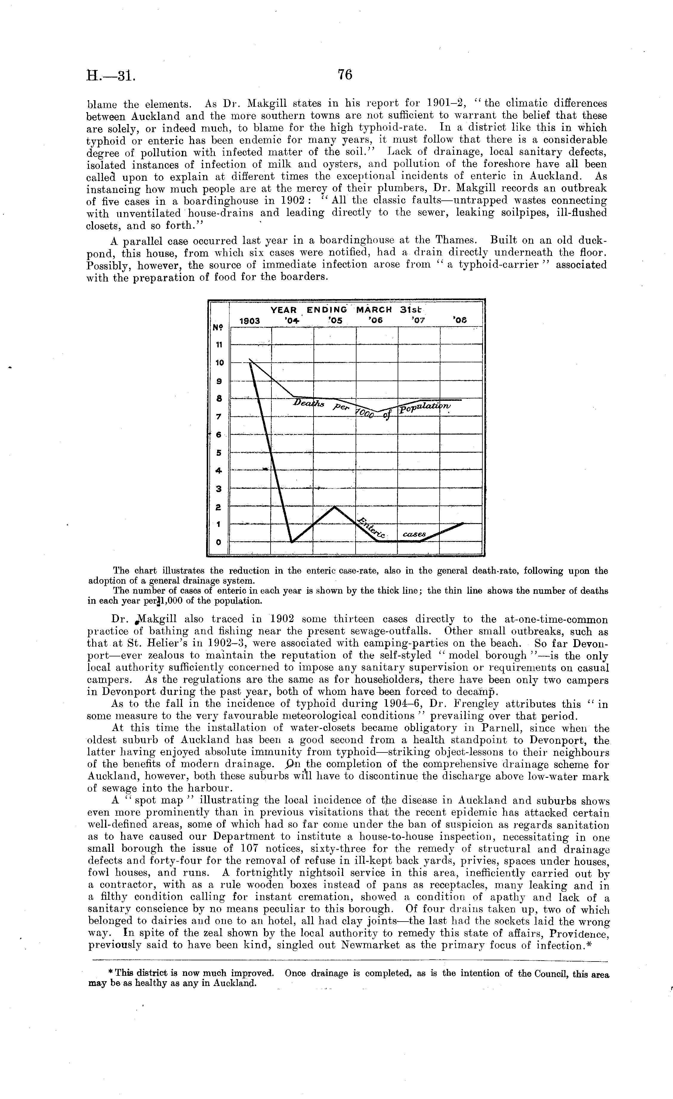 The chart illustrates the reduction in the enteric case-rate, also in the general death-rate, following upon the adoption of a general drainage system. The number of cases of enteric in each year is shown by the thick line; the thin line shows the number of deaths in each year per|l,ooo of the population. Dr. JVfakgill also traced in 1902 some thirteen cases directly to the at-one-time-common practice of bathing and fishing near the present sewage-outfalls. Other small outbreaks, such as that at St. Helier's in 1902-3, were associated with camping-parties on the beach. So far Devonport —ever zealous to maintain the reputation of the self-styled " model borough " —is the only local authority sufficiently concerned to impose any sanitary supervision or requirements on casual campers. As the regulations are the same as for householders, there have been only two campers in Devonport during the past year, both of whom have been forced to decamp. As to the fall in the incidence of typhoid during 1904-6, Dr. Frengley attributes this " in some measure to the very favourable meteorological conditions " prevailing over that period. At this time the installation of water-closets became obligatory in Parnell, since when the oldest suburb of Auckland has been a good second from a health standpoint to Devonport, the latter having enjoyed absolute immunity from typhoid —striking object-lessons to their neighbours of the benefits of modern drainage, fin the completion of the comprehensive drainage scheme for Auckland, however, both these suburbs will have to discontinue the discharge above low-water mark of sewage into the harbour. A " spot map " illustrating the local incidence of the disease in Auckland and suburbs shows even more prominently than in previous visitations that the recent epidemic has attacked certain well-defined areas, some of which had so far come under the ban of suspicion as regards sanitation as to have caused our Department to institute a house-to-house inspection, necessitating in one small borough the issue of 107 notices, sixty-three for the remedy of structural and drainage defects and forty-four for the removal of refuse in ill-kept back yards, privies, spaces under houses, fowl houses, and runs. A fortnightly nightsoil service in this area, inefficiently carried out by a contractor, with as a rule wooden boxes instead of pans as receptacles, many leaking and in a filthy condition calling for instant cremation, showed a condition of apathy and lack of a sanitary conscience by no means peculiar to this borough. Of four drains taken up, two of which belonged to dairies and one to an hotel, all had clay joints—the last had the sockets laid the wrong way. In spite of the zeal shown by the local authority to remedy this state of affairs, Providence, previously said to have been kind, singled out Newmarket as the primary focus of infection.*