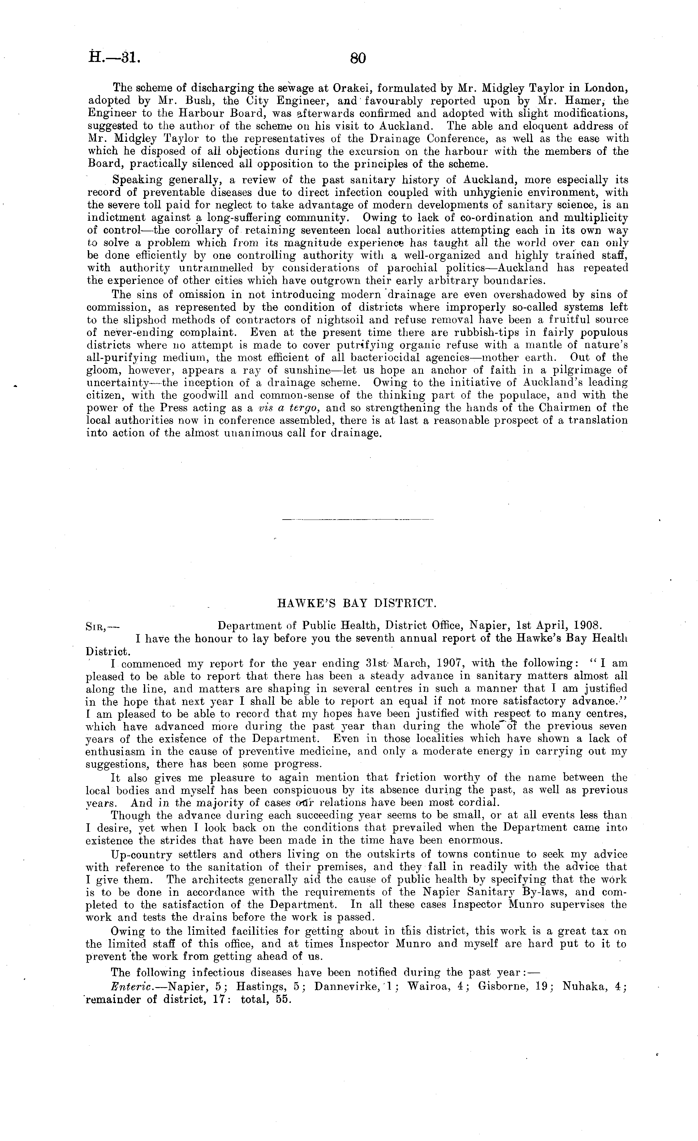 HAWKE'S BAY DISTRICT. Sir, — Department of Public Health, District Office, Napier, Ist April, 1908. I have the honour to lay before you the seventh annual report of the Hawke's Bay Health District. I commenced my report for the year ending 31st March, 1907, with the following: "I am pleased to be able to report that there has been a steady advance in sanitary matters almost all along the line, and matters are shaping in several centres in such a manner that I am justified in the hope that next year I shall be able to report an equal if not more satisfactory advance." I am pleased to be able to record that my hopes have been justified with respect to many centres, which have advanced more during the past year than during the whole of the previous seven years of the existence of the Department. Even in those localities which have shown a lack of enthusiasm in the cause of preventive medicine, and only a moderate energy in carrying out my suggestions, there has been some progress. It also gives me pleasure to again mention that friction worthy of the name between the local bodies and myself has been conspicuous by its absence during the past, as well as previous years. And in the majority of cases o-ti'r relations have been most cordial. Though the advance during each succeeding year seems to be small, or at all events less than I desire, yet when I look back on the conditions that prevailed when the Department came into existence the strides that have been made in the time have been enormous. Up-country settlers and others living on the outskirts of towns continue to seek my advice with reference to the sanitation of their premises, and they fall in readily with the advice that I give them. The architects generally aid the cause of public health by specifying that the work is to be done in accordance with the requirements of the Napier Sanitary By-laws, and completed to the satisfaction of the Department. In all these cases Inspector Munro supervises the work and tests the drains before the work is passed. Owing to the limited facilities for getting about in this district, this work is a great tax on the limited staff of this office, and at times Inspector Munro and myself are hard put to it to prevent the work from getting ahead of us. The following infectious diseases have been notified during the past year: — Enteric. —Napier, 5; Hastings, 5; Dannevirke, 1 : Wairoa, 4; Gisborne, 19; Nuhaka, 4; remainder of district, 17: total, 55.