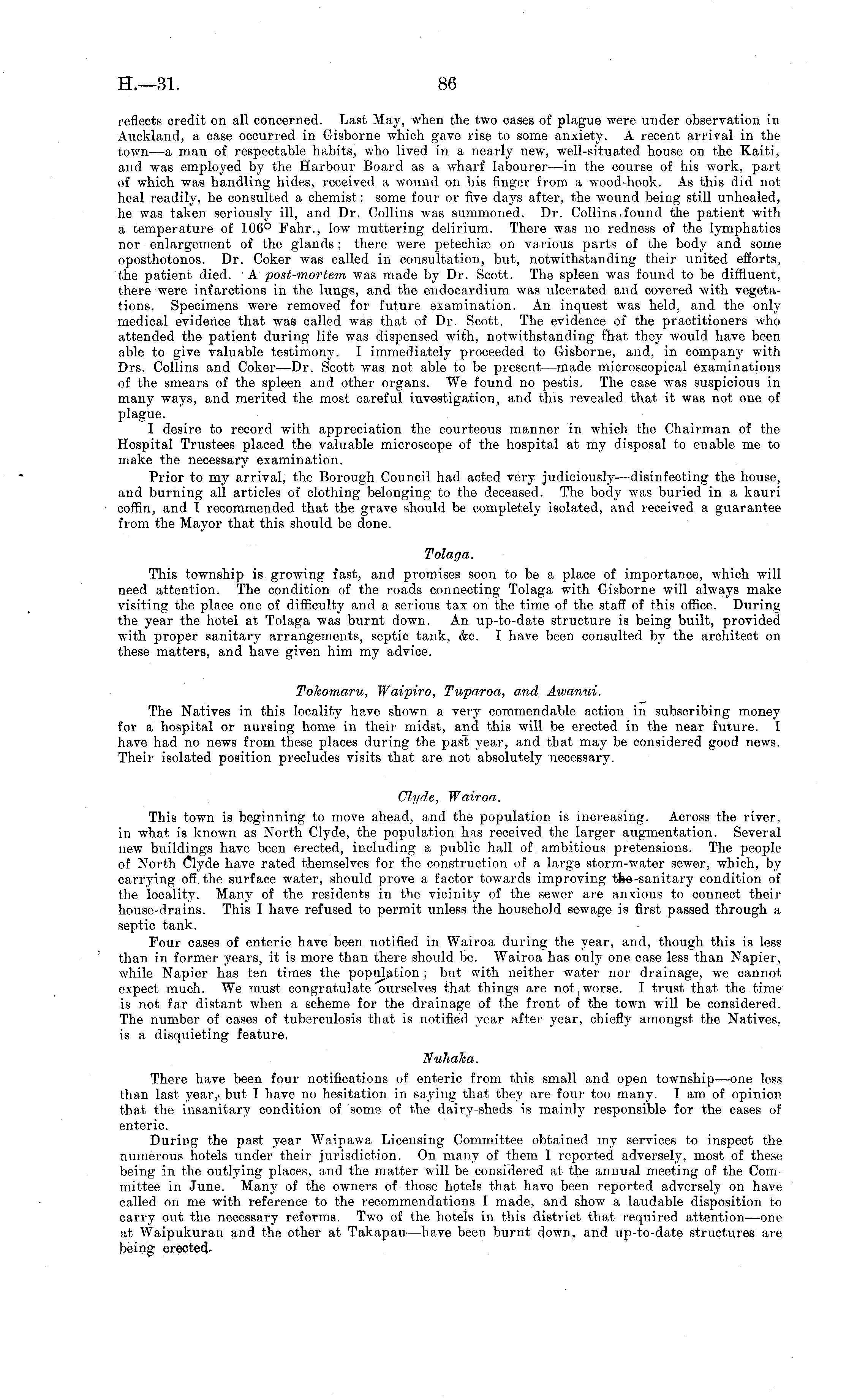reflects credit on all concerned. Last May, when the two cases of plague were under observation in Auckland, a case occurred in Gisborne which gave rise to some anxiety. A recent arrival in the town —a man of respectable habits, who lived in a nearly new, well-situated house on the Kaiti, and was employed by the Harbour Board as a wharf labourer—in the course of his work, part of which was handling hides, received a wound on his finger from a wood-hook. As this did not heal readily, he consulted a chemist: some four or five days after, the wound being still unhealed, he was taken seriously ill, and Dr. Collins was summoned. Dr. Collins found the patient with a temperature of 106° Fahr., low muttering delirium. There was no redness of the lymphatics nor enlargement of the glands; there were petechiae on various parts of the body and some oposthotonos. Dr. Coker was called in consultation, but, notwithstanding their united efforts, the patient died. A post-mortem was made by Dr. Scott. The spleen was found to be diffluent, there were infarctions in the lungs, and the endocardium was ulcerated and covered with vegetations. Specimens were removed for future examination. An inquest was held, and the only medical evidence that was called was that of Dr. Scott. The evidence of the practitioners who attended the patient during life was dispensed with, notwithstanding that they would have been able to give valuable testimony. I immediately proceeded to Gisborne, and, in company with Drs. Collins and Coker—Dr. Scott was not able to be present—made microscopical examinations of the smears of the spleen and other organs. We found no pestis. The case was suspicious in many ways, and merited the most careful investigation, and this revealed that it was not one of plague. I desire to record with appreciation the courteous manner in which the Chairman of the Hospital Trustees placed the valuable microscope of the hospital at my disposal to enable me to make the necessary examination. Prior to my arrival, the Borough Council had acted very judiciously—disinfecting the house, and burning all articles of clothing belonging to the deceased. The body was buried in a kauri coffin, and I recommended that the grave should be completely isolated, and received a guarantee from the Mayor that this should be done. Tolaga. This township is growing fast, and promises soon to be a place of importance, which will need attention. The condition of the roads connecting Tolaga with Gisborne will always make visiting the place one of difficulty and a serious tax on the time of the staff of this office. During the year the hotel at Tolaga was burnt down. An up-to-date structure is being built, provided with proper sanitary arrangements, septic tauk, &c. I have been consulted by the architect on these matters, and have given him my advice. Tokomaru, Waipiro, Tuparoa, and Awanui. The Natives in this locality have shown a very commendable action in subscribing money for a hospital or nursing home in their midst, and this will be erected in the near future. I have had no news from these places during the past year, and that may be considered good news. Their isolated position precludes visits that are not absolutely necessary. Clyde, Wairoa. This town is beginning to move ahead, and the population is increasing. Across the river, in what is known as North Clyde, the population has received the larger augmentation. Several new buildings have been erected, including a public hall of ambitious pretensions. The people of North Clyde have rated themselves for the construction of a large storm-water sewer, which, by carrying off the surface water, should prove a factor towards improving the-sanitary condition of the locality. Many of the residents in the vicinity of the sewer are anxious to connect their house-drains. This I have refused to permit unless the household sewage is first passed through a septic tank. Four cases of enteric have been notified in Wairoa during the year, and, though this is less than in former years, it is more than there should be. Wairoa has only one case less than Napier, while Napier has ten times the population : but with neither water nor drainage, we cannot expect much. We must congratulate ourselves that things are not, worse. I trust that the time is not far distant when a scheme for the drainage of the front of the town will be considered. The number of cases of tuberculosis that is notified 3'ear after year, chiefly amongst the Natives, is a disquieting feature. Nuhaka. There have been four notifications of enteric from this small and open township—one less than last year,, but I have no hesitation in saying that they are four too many. lam of opinion that the insanitary condition of some of the dairy-sheds is mainly responsible for the cases of enteric. During the past year Waipawa Licensing Committee obtained my services to inspect the numerous hotels under their jurisdiction. On many of them I reported adversely, most of these being in the outlying places, and the matter will be considered at the annual meeting of the Committee in June. Many of the owners of those hotels that have been reported adversely on have called on me with reference to the recommendations I made, and show- a laudable disposition to carry out the necessary reforms. Two of the hotels in this district that required attention—one at Waipukurau and the other at Takapau —have been burnt down, and up-to-date structures are being erected-