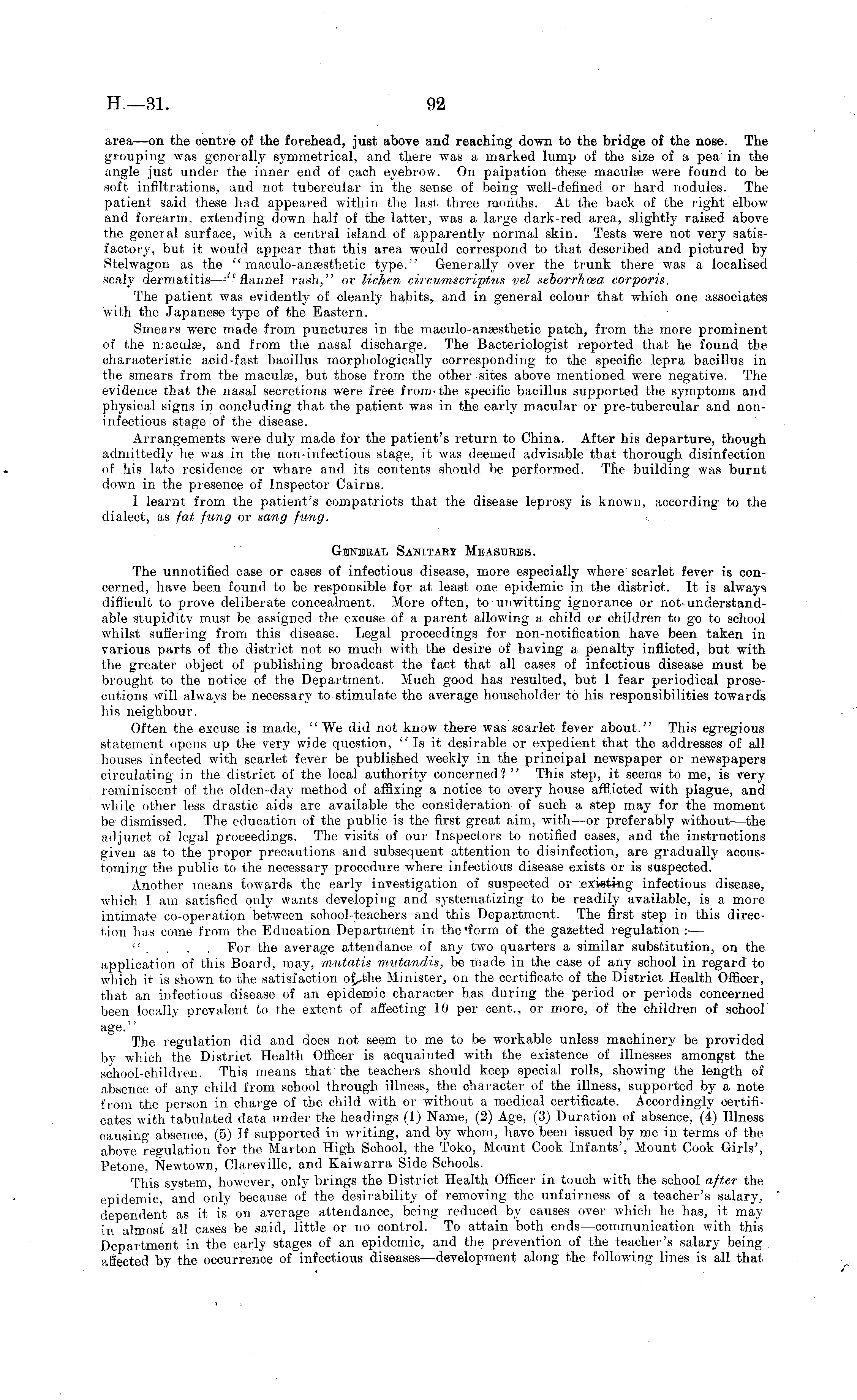 area—on the centre of the forehead, just above and reaching down to the bridge of the nose. The grouping was generally symmetrical, and there was a marked lump of the size of a pea in the angle just under the inner end of each eyebrow. On palpation these maculae were found to be soft infiltrations, and not tubercular in the sense of being well-defined or hard nodules. The patient said these had appeared within the last three months. At the back of the right elbow and forearm, extending down half of the latter, was a large dark-red area, slightly raised above the general surface, with a central island of apparently normal skin. Tests were not very satisfactory, but it would appear that this area would correspond to that described and pictured by Stelwagon as the " maculo-ansesthetic type." Generally over the trunk there was a localised scaly dermatitis— -" flannel rash," or lichen eircumscriptus vel seborrhoea corporis. The patient was evidently of cleanly habits, and in general colour that which one associates with the Japanese type of the Eastern. Smears were made from punctures in the maculo-anaesthetic patch, from the more prominent of the maculae, and from the nasal discharge. The Bacteriologist reported that he found the characteristic acid-fast bacillus morphologically corresponding to the specific lepra bacillus in the smears from the maculae, but those from the other sites above mentioned were negative. The evidence that the nasal secretions were free from, the specific bacillus supported the symptoms and physical signs in concluding that the patient was in the early macular or pre-tubercular and noninfectious stage of the disease. Arrangements were duly made for the patient's return to China. After his departure, though admittedly he was in the non-infectious stage, it was deemed advisable that thorough disinfection of his late residence or whare and its contents shotild be performed. The building was burnt down in the presence of Inspector Cairns. I learnt from the patient's compatriots that the disease leprosy is known, according to the dialect, as fat fung or sang fung. General Sanitary Measures. The unnotified case or cases of infectious disease, more especially where scarlet fever is concerned, have been found to be responsible for at least one epidemic in the district, It is always difficult to prove deliberate concealment. More often, to unwitting ignorance or not-understand-able stupidity must be assigned the excuse of a parent allowing a child or children to go to school whilst suffering from this disease. Legal proceedings for non-notification have been taken in various parts of the district not so much with the desire of having a penalty inflicted, but with the greater object of publishing broadcast the fact that all cases of infectious disease must be brought to the notice of the Department. Much good has resulted, but 1 fear periodical prosecutions will always be necessary to stimulate the average householder to his responsibilities towards his neighbour. Often the excuse is made, "We did not know there was scarlet fever about." This egregious statement opens up the very wide question, "Is it desirable or expedient that the addresses of all houses infected with scarlet fever be published weekly in the principal newspaper or newspapers circulating in the district of the local authority concerned? " This step, it seems to me, is very reminiscent of the olden-day method of affixing a notice to every house afflicted with plague, and while other less drastic aids are available the consideration of such a step may for the moment be dismissed. The education of the public is the first great aim, with —or preferably without—the adjunct of legal proceedings. The visits of our Inspectors to notified cases, and the instructions given as to the proper precautions and subsequent attention to disinfection, are gradually accustoming the public to the necessary procedure where infectious disease exists or is suspected. Another means towards the early investigation of suspected or existing infectious disease, which I am satisfied only w-ants developing and systematizing to be readily available, is a more intimate co-operation between school-teachers and this Department. The first step in this direction lias come from the Education Department in the'form of the gazetted regulation:— " . . . . For the average attendance of any two quarters a similar substitution, on the. application of this Board, may, mutatis mutandis, be made in the case of any school in regard to which it is shown to the satisfaction Minister, on the certificate of the District Health Officer, that an infectious disease of an epidemic character has during the period or periods concerned been locally prevalent to the extent of affecting 10 per cent., or more, of the children of school age." The regulation did and does not seem to me to be workable unless machinery be provided by which the District Health Officer is acquainted with the existence of illnesses amongst the school-children. This means that the teachers should keep special rolls, showing the length of absence of any child from school through illness, the character of the illness, supported by a note from the person in charge of the child with or without a medical certificate. Accordingly certificates with tabulated data under the headings (1) Name, (2) Age, (3) Duration of absence, (4) Illness causing absence, (5) If supported in writing, and by whom, have been issued by me in terms of the above regulation for the Marton High School, the Toko, Mount Cook Infants', Mount Cook Girls', Petone, Newtown, Clareville, and Kaiwarra Side Schools. This system, however, only brings the District Health Officer in touch with the school after the epidemic, and only because of the desirability of removing the unfairness of a teacher's salary, dependent as it is on average attendance, being reduced by causes over which he has, it may in almost all cases be said,