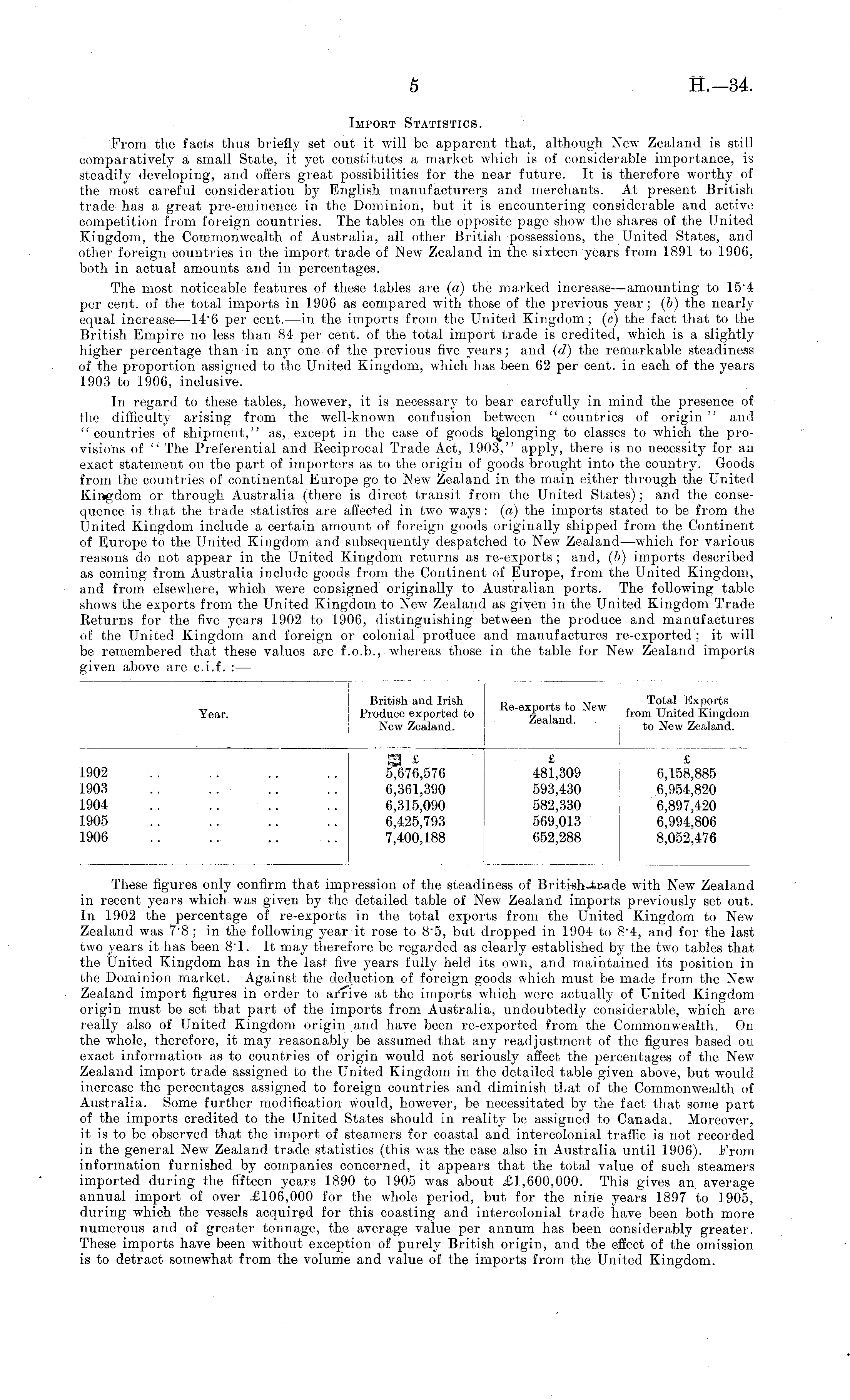 British and Irish Produce exported to New Zealand. Re-exports to New Zealand. Total Exports from United Kingdom to New Zealand. Year. 902 903 .904 905 .906 13 £ 57676,576 6,361,390 6,315,090 6,425,793 7,400,188 £ 481,309 593,430 582,330 569,013 652,288 £ 6,158,885 6,954,820 6,897,420 6,994,806 8,052,476