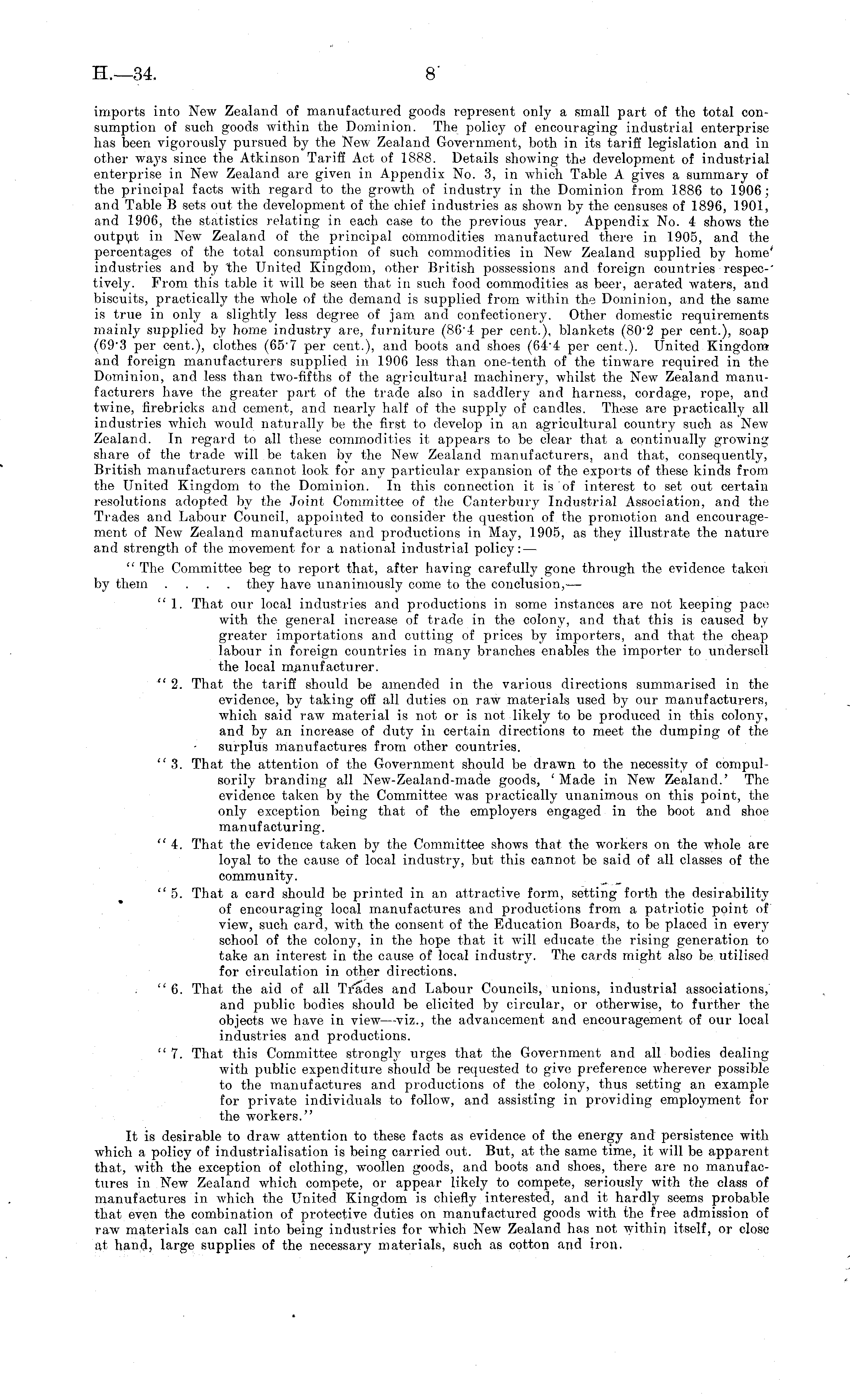 imports into New Zealand of manufactured goods represent only a small part of the total consumption of such goods xvithin the Dominion. The policy of encouraging industrial enterprise has been vigorously pursued by the New Zealand Government, both in its tariff legislation and in other ways since the Atkinson Tariff Act of 1888. Details shoxving the development of industrial enterprise in Nexv Zealand are given in Appendix No. 3, in xvhich Table A gives a summary of the principal facts with regard to the growth of industry in the Dominion from 1886 to 1906; and Table B sets out the development of the chief industries as shoxvn by the censuses of 1896, 1901, and 1906, the statistics relating in each case to the previous year. Appendix No. 4 shows the output in New Zealand of the principal commodities manufactured there in 1905, and the percentages of the total consumption of such commodities in Nexv Zealand supplied by home industries and by 'the United Kingdom, other British possessions and foreign countries respectively. From this table it xvill be seen that in such food commodities as beer, aerated waters, and biscuits, practically the whole of the demand is supplied from within the Dominion, and the same is true in only a slightly less degree of jam and confectionery. Other domestic requirements mainly supplied by home industry are, furniture (864 per cent.), blankets (802 per cent.), soap (69"3 per cent.), clothes (65 - 7 per cent.), and boots and shoes (64 - 4 per cent.). United Kingdom and foreign manufacturers supplied in 1906 less than one-tenth of the tinware required in the Dominion, and less than of the agricultural machinery, whilst the Nexv Zealand manufacturers have the greater part of the trade also in saddlery and harness, cordage, rope, and txvine, firebricks and cement, and nearly half of the supply of candles. These are practically all industries which would naturally be the first to develop in an agricultural country such as New Zealand. In regard to all these commodities it appears to be clear that a continually groxving share of the trade xvill be taken by the Nexv Zealand manufacturers, and that, consequently, British manufacturers cannot look for any particular expansion of the exports of these kinds from the United Kingdom to the Dominion. In this connection it is of interest to set out certain resolutions adopted by the Joint Committee of the Canterbury Industrial Association, and the Trades and Labour Council, appointed to consider the question of the promotion and encouragement of New Zealand manufactures and productions in May, 1905, as they illustrate the nature and strength of the movement for a national industrial policy: — " The Committee beg to report that, after having carefully gone through the evidence taken by them .... they have unanimously come to the conclusion, — " 1. That our local industries and productions in some instances are not keeping pace with the general increase of trade in the colony, and that this is caused by greater importations and cutting of prices by importers, and that the cheap labour in foreign countries in many branches enables the importer to undersell the local manufacturer. "2. That the tariff should be amended in the various directions summarised in the evidence, by taking off all duties on raw materials used by our manufacturers, which said raw material is not or is not likely to be produced in this colony, and by an increase of duty in certain directions to meet the dumping of the surplus manufactures from other countries. "3. That the attention of the Government should be drawn to the necessity of compulsorily branding all Nexv-Zealand-made goods, 'Made in New Zealand.' The evidence taken by the Committee was practically unanimous on this point, the only exception being that of the employers engaged in the boot and shoe manufacturing. " 4. That the evidence taken by the Committee shows that the workers on the whole are loyal to the cause of local industry, but this cannot be said of all classes of the community. "5. That a card should be printed in an attractive form, setting forth the desirability of encouraging local manufactures and productions from a patriotic point of view, such card, with the consent of the Education Boards, to be placed in every school of the colony, in the hope that it xvill educate the rising generation to take an interest in the cause of local industry. The cards might also be utilised for circulation in other directions. " 6. That the aid of all Tr"ades and Labour Councils, unions, industrial associations, and public bodies should be elicited by circular, or otherwise, to further the objects xve have in viexv—viz., the advancement and encouragement of our local industries and productions. " 7. That this Committee strongly urges that the Government and all bodies dealing with public expenditure should be requested to give preference wherever possible to the manufactures and productions of the colony, thus setting an example for private individuals to folloxv, and assisting in providing employment for the workers." It is desirable to draw attention to these facts as evidence of the energy and persistence with which a policy of industrialisation is being carried out. But, at the same time, it will be apparent that, with the exception of clothing, woollen goods, and boots and shoes, there are no manufactures in New Zealand which compete, or appear likely to compete, seriously with the class of manufactures in xvhich the United Kingdom is chiefly interested, and it hardly seems probable that even the combination of protective duties on manufactured goods with the free admission of raw materials can call into being industries for xvhich New Zealand has not within itself, or close at hand, large supplies of the necessary materials, such as cotton and iron,
