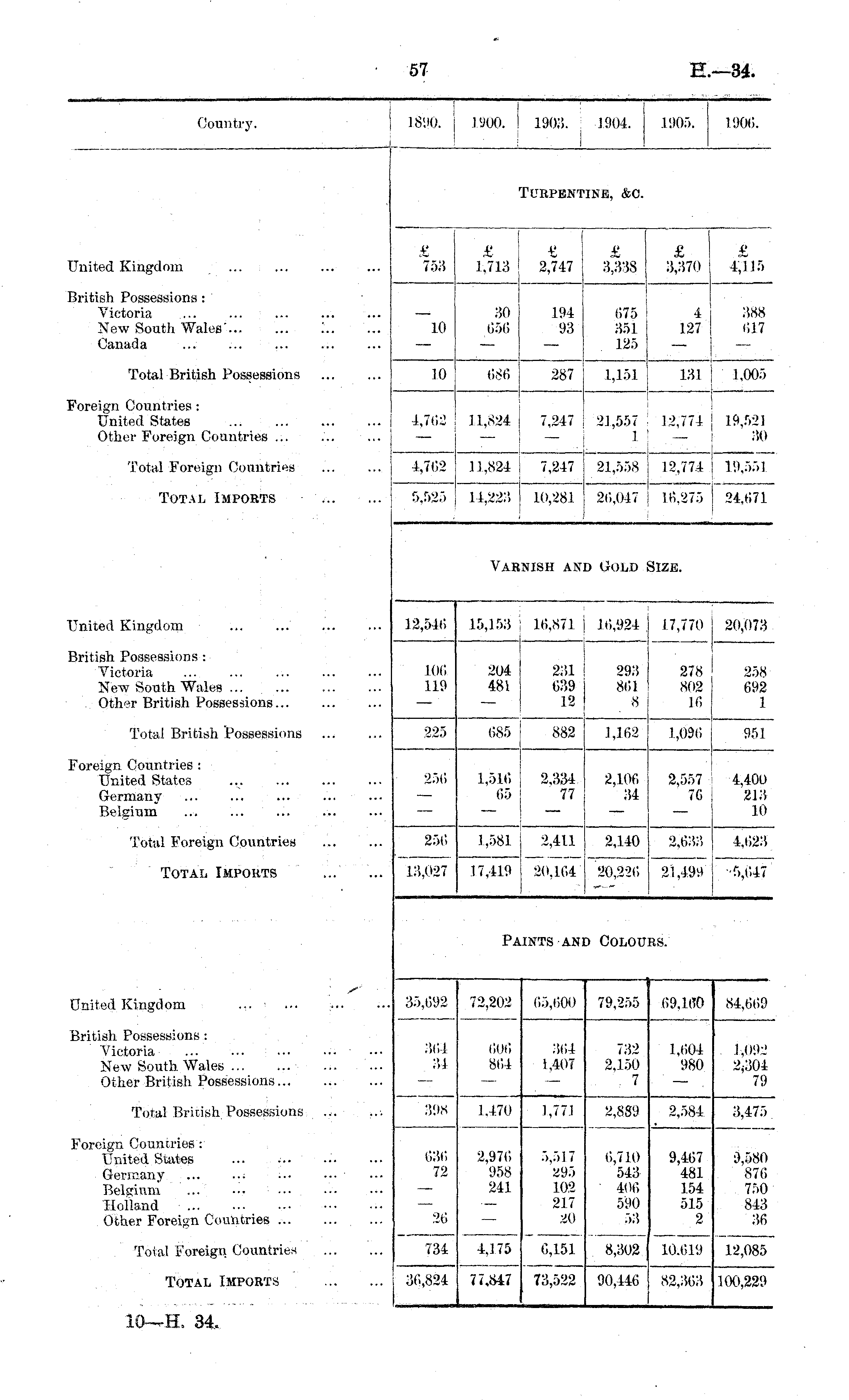 Country. 1890. j i iyoo. ! 1903. 1904. 1905. 1906. Turpen 'INE, &c. United Kingdom £ 753 £ 1,713 £ 2,747 £ 3,338 £ 3,370 £ 4,115 British Possessions : Victoria New South Wales' ... Canada 10 30 656 194 93 675 351 125 4 127 388 617 Total British Possessions 10 (\66 287 1,151 131 1,005 Foreign Countries: United States Other Foreign Countries ... 4,762 11.824 7,247 21,557 1 12,774 19,521 30 Total Foreign Countries 4,762 11,824 7,247 21,558 12,774 19,551 Total Imports 5,525 14,223 10,281 26,047 16,275 24,071 Varnish an: Gold Size. United Kingdom 12,546 15,153 16,871 16,924 17,770 20,073 British Possessions : Victoria New South Wales ... Other British Possessions 106 119 204 481 231 639 12 293 861 8 278 802 16 258 692 1 Total British Possessions 225 685 882 1,162 1,096 951 Foreign Countries : United States Germany Belgium 256 1,516 65 2,334 77 2,106 34 2,557 76 4,400 213 10 Total Foreign Countries 256 1,581 2,411 2,140 2,633 4,023 - Total Imports 13,027 17,419 20,164 20,226 21,499 -5,047 Paints an COLOU ,S. United Kingdom ... ■ ••• 35,692 72,202 65,600 79,255 69,160 84,669 British Possessions : Victoria New South Wales Other British Possessions 364 34 000, 804 364 1,407 732 2,150 7 1,604 980 1,092 2 ( 304 79 Total British Possessions 398 1,470 1,771 2,889 2,584 3,475 Foreign Countries: United States Germany ... ..; ■•■ ••• Belgium Holland Other Foreign Countries 636 72 2,976 958 241 5,517 295 102 217 20 6,710 543 406 590 53 9,467 481 154 515 2 9,580 876 750 843 36 26 Total Foreign Countries 734 4,175 6,151 8,302 10.619 12,085 Total Imports 36,824 77,847 73,522 90,446 82,363 100,220