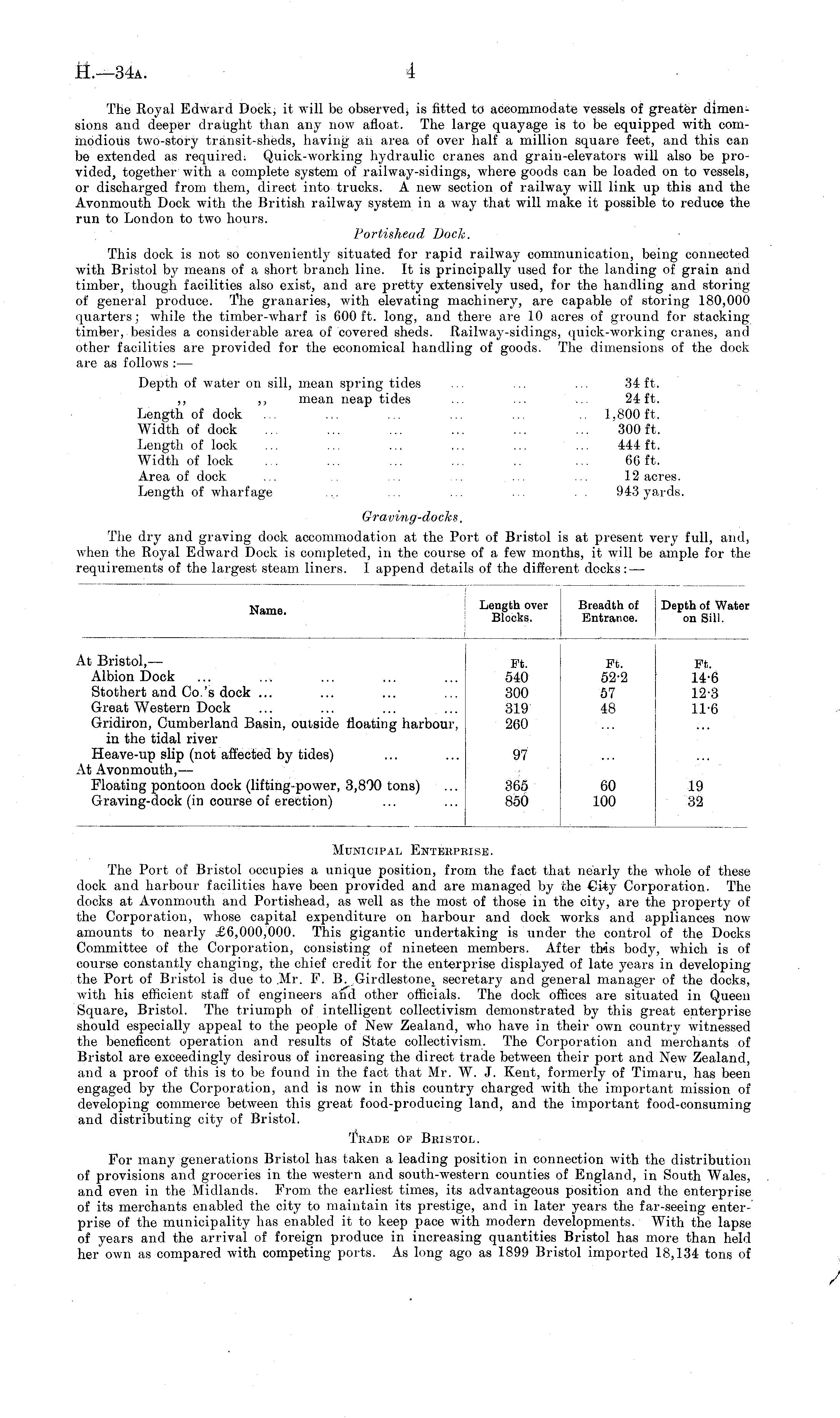 Municipal Enterprise. The Port of Bristol occupies a unique position, from the fact that nearly the whole of these dock and harbour facilities have been provided and are managed by the City Corporation. The docks at Avonmouth and Portishead, as well as the most of those in the city, are the property of the Corporation, whose capital expenditure on harbour and dock works and appliances now amounts to nearly £6,000,000. This gigantic undertaking is under the control of the Docks Committee of the Corporation, consisting of nineteen members. After this body, which is of course constantly changing, the chief credit for the enterprise displayed of late years in developing the Port of Bristol is due to .Mr. F. B. Girdlestonej secretary and general manager of the docks, with his efficient staff of engineers and other officials. The dock offices are situated in Queen Square, Bristol. The triumph of intelligent collectivism demonstrated by this great enterprise should especially appeal to the people of New Zealand, who have in their own country witnessed the beneficent operation and results of State collectivism. The Corporation and merchants of Bristol are exceedingly desirous of increasing the direct trade between their port and New Zealand, and a proof of this is to be found in the fact that Mr. W. J. Kent, formerly of Timaru, has been engaged by the Corporation, and is now in this country charged with the important mission of developing commerce between this great food-producing land, and the important food-consuming and distributing city of Bristol. Trade of Bristol. For many generations Bristol has taken a leading position in connection with the distribution of provisions and groceries in the western and south-western counties of England, in South Wales, and even in the Midlands. From the earliest times, its advantageous position and the enterprise of its merchants enabled the city to maintain its prestige, and in later years the far-seeing enterprise of the municipality has enabled it to keep pace with modern developments. With the lapse of years and the arrival of foreign produce in increasing quantities Bristol has more than held her own as compared with competing ports. As long ago as 1899 Bristol imported 18,134 tons of