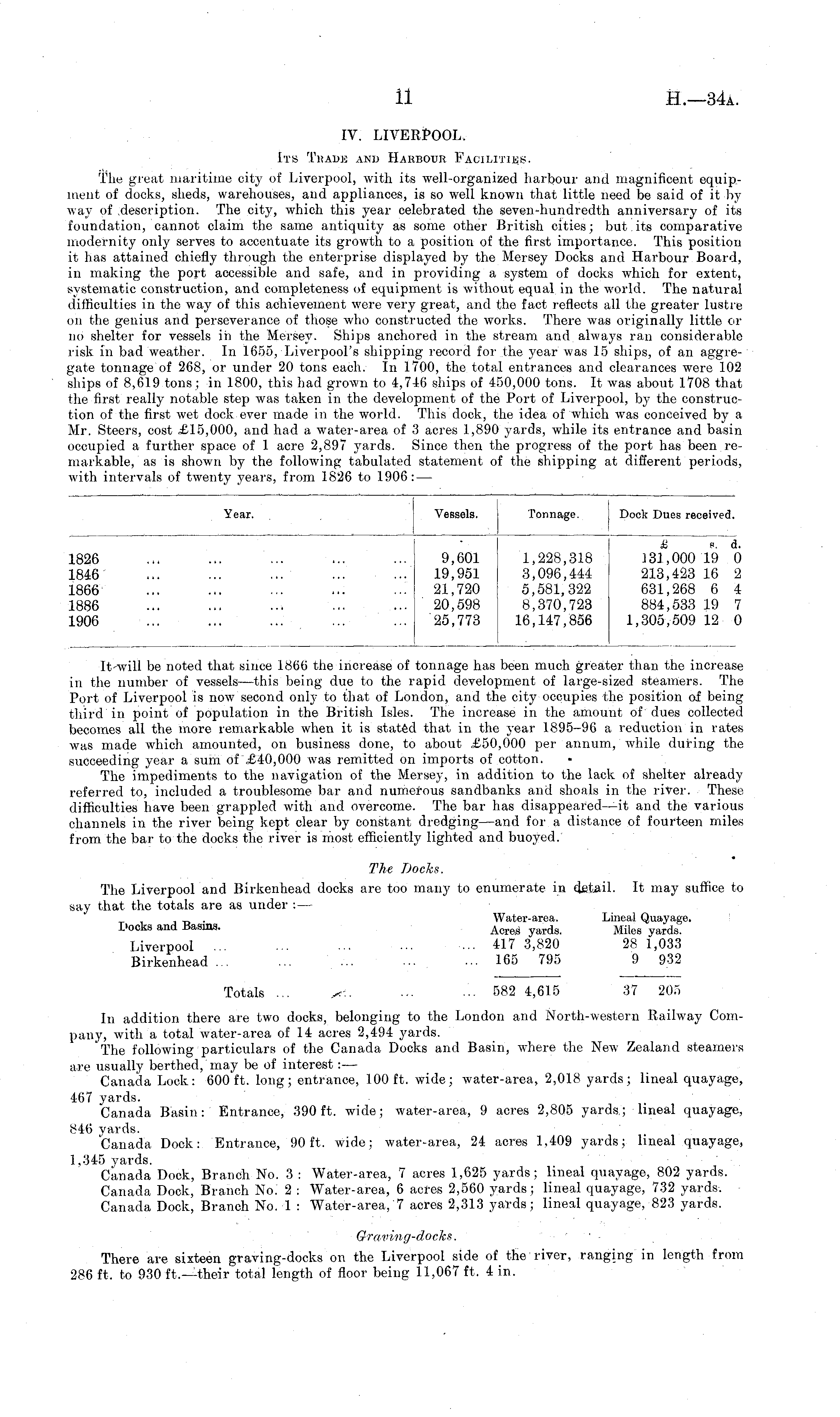IV. LIVERPOOL. Its Trade and Harbour Facilities. The great maritime city of Liverpool, with its well-organized harbour and magnificent equipment of docks, sheds, warehouses, and appliances, is so well known that little need be said of it by way of description. The city, which this year celebrated the seven-hundredth anniversary of its foundation, cannot claim the same antiquity as some other British cities; but its comparative modernity only serves to accentuate its growth to a position of the first importance. This position it has attained chiefly through the enterprise displayed by the Mersey Docks and Harbour Board, in making the port accessible and safe, and in providing a system of docks which for extent, systematic construction, and completeness of equipment is without equal in the world. The natural difficulties in the way of this achievement were very great, and the fact reflects all the greater lustre on the genius and perseverance of those who constructed the works. There was originally little or no shelter for vessels in the Mersey. Ships anchored in the stream and always ran considerable risk in bad weather. In 1655, Liverpool's shipping record for the year was 15 ships, of an aggregate tonnage of 268, or under 20 tons each. In 1700, the total entrances and clearances were 102 ships of 8,619 tons; in 1800, this had grown to 4,746 ships of 450,000 tons. It was about 1708 that the first really notable step was taken in the development of the Port of Liverpool, by the construction of the first wet dock ever made in the world. This dock, the idea of which was conceived by a Mr. Steers, cost £15,000, and had a water-area of 3 acres 1,890 yards, while its entrance and basin occupied a further space of 1 acre 2,897 yards. Since then the progress of the port has been remarkable, as is shown by the following tabulated statement of the shipping at different periods, with intervals of twenty years, from 1826 to 1906 : —
