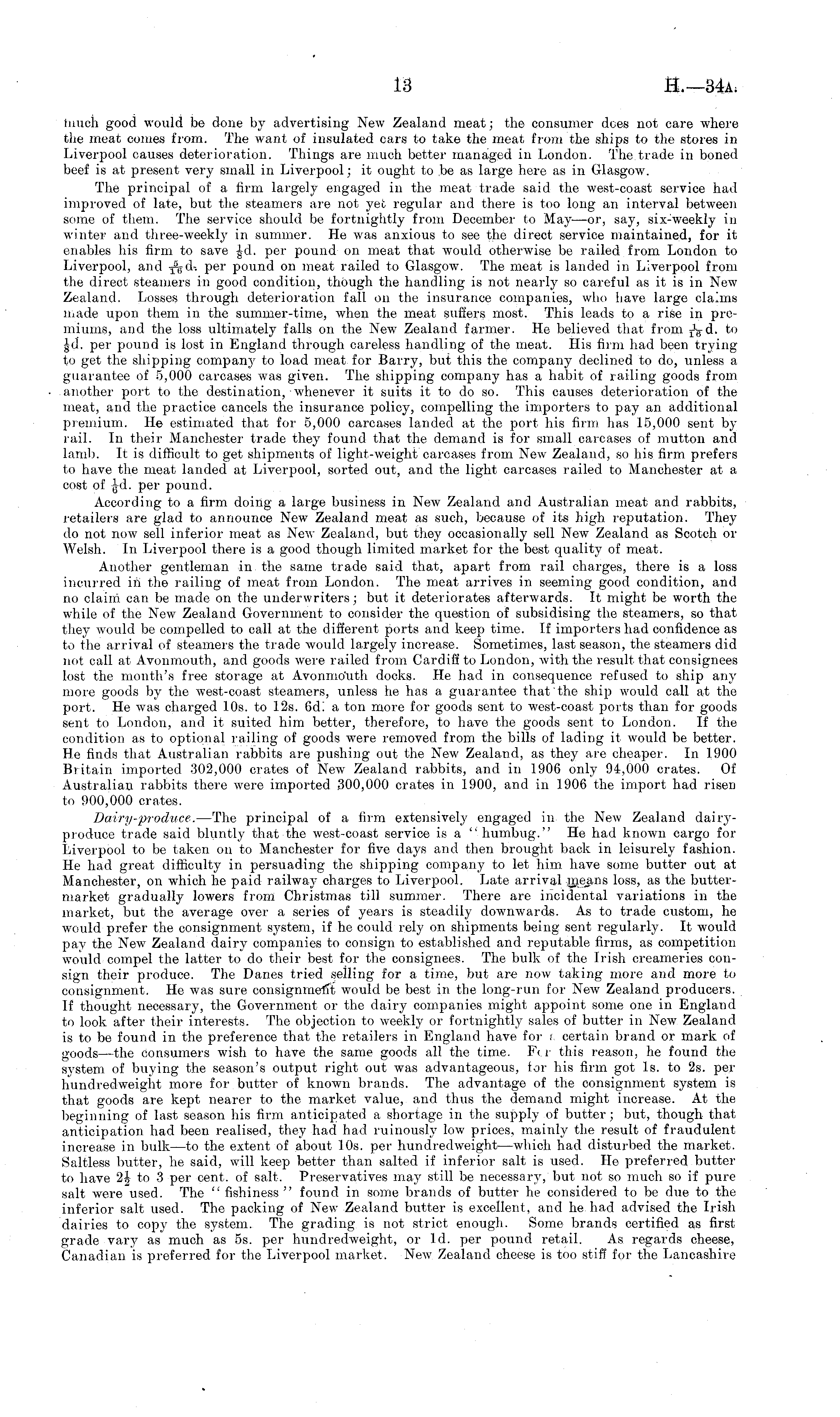 much good would be done by advertising New Zealand meat; the consumer does not care where the meat comes from. The want of insulated cars to take the meat from the ships to the stores in Liverpool causes deterioration. Things are much better managed in London. The trade in boned beef is at present very small in Liverpool; it ought to be as large here as in Glasgow. The principal of a firm largely engaged in the meat trade said the west-coast service had improved of late, but the steamers are not yet regular and there is too long an interval between some of them. The service should be fortnightly from December to May —or, say, six : weekly in winter and three-weekly in summer. He was anxious to see the direct service maintained, for it enables his firm to save |d. per pound on meat that would otherwise be railed from Loudon to Liverpool, and -fgd-. per pound on meat railed to Glasgow. The meat is landed in Liverpool from the direct steamers in good condition, though the handling is not nearly so careful as it is in New Zealand. Losses through deterioration fall 011 the insurance companies, who have large claims made upon them in the summer-time, when the meat suffers most. This leads to a rise in premiums, and the loss ultimately falls on the New Zealand farmer. He believed that from jVd. to gfd. per pound is lost in England through careless handling of the meat. His firm had been trying to get the shipping company to load meat for Barry, but this the company declined to do, unless a guarantee of 5,000 carcases was given. The shipping company has a habit of railing goods from another port to the destination, whenever it suits it to do so. This causes deterioration of the meat, and the practice cancels the insurance policy, compelling the importers to pay an additional premium. He estimated that for 5,000 carcases landed at the port his firm has 15,000 sent byrail. In their Manchester trade they found that the demand is for small carcases of mutton and lamb. It is difficult to get shipments of light-weight carcases from New Zealand, so his firm prefers to have the meat landed at Liverpool, sorted out, and the light carcases railed to Manchester at a cost of |-d. per pound. According to a firm doing a large business in New Zealand and Australian meat and rabbits, retailers are glad to announce New Zealand meat as such, because of its high reputation. They do not now sell inferior meat as New Zealand, but they occasionally sell New Zealand as Scotch or Welsh. In Liverpool there is a good though limited market for the best quality of meat, Another gentleman in the same trade said that, apart from rail charges, there is a loss incurred in the railing of meat from London. The meat arrives in seeming good condition, and no claim can be made on the underwriters; but it deteriorates afterwards. It might be worth the while of the New Zealand Government to consider the question of subsidising the steamers, so that they would be compelled to call at the different ports and keep time. If importers had confidence as to the arrival of steamers the trade would largely increase. Sometimes, last season, the steamers did not call at Avonmouth, and goods were railed from Cardiff to London, with the result that consignees lost the month's free storage at Avonmo'uth docks. He had in consequence refused to ship any more goods by the west-coast steamers, unless he has a guarantee that the ship would call at the port. He was charged 10s. to 12s. 6d! a ton more for goods sent to west-coast ports than for goods sent to London, and it suited him better, therefore, to have the goods sent to London. If the condition as to optional railing of goods were removed from the bills of lading it would be better. He finds that Australian rabbits are pushing out the New Zealand, as they are cheaper. In 1900 Britain imported 302,000 crates of New Zealand rabbits, and in 1906 only 94,000 crates. Of Australian rabbits there w r ere imported 300,000 crates in 1900, and in 1906 the import had risen to 900,000 crates. Dairy-produce. —The principal of a firm extensively engaged in the New Zealand dairyproduce trade said bluntly that the west-coast service is a "humbug." He had known cargo for Liverpool to be taken on to Manchester for five days and then brought back in leisurely fashion. He had great difficulty in persuading the shipping company to let him have some butter out at Manchester, on which he paid railway charges to Liverpool. Late arrival means loss, as the buttermarket gradually lowers from Christmas till summer. There are incidental variations in the market, but the average over a series of years is steadily downwards. As to trade custom, he would prefer the consignment system, if he could rely on shipments being sent regularly. It would pay the New Zealand dairy companies to consign to established and reputable firms, as competition would compel the latter to do their best for the consignees. The bulk of the Irish creameries consign their produce. The Danes tried selling for a time, but are now taking more and more to consignment. He was sure consignmefft would be best in the long-run for New Zealand producers. If thought necessary, the Government or the dairy companies might appoint some one in England to look after their interests. The objection to weekly or fortnightly sales of butter in New Zealand is to be found in the preference that the retailers in England have for i certain brand or mark of goods—the consumers wish to have the same goods all the time. Ft r this reason, he found the system of buying the season's output right out was advantageous, tor his firm got Is. to 2s. per hundredweight more for butter of know r n brands. The advantage of the consignment system is that goods are kept nearer to the market value, and thus the demand might increase. At the beginning of last season his firm anticipated a shortage in the supply of butter ; but, though that anticipation had been realised, they had had ruino