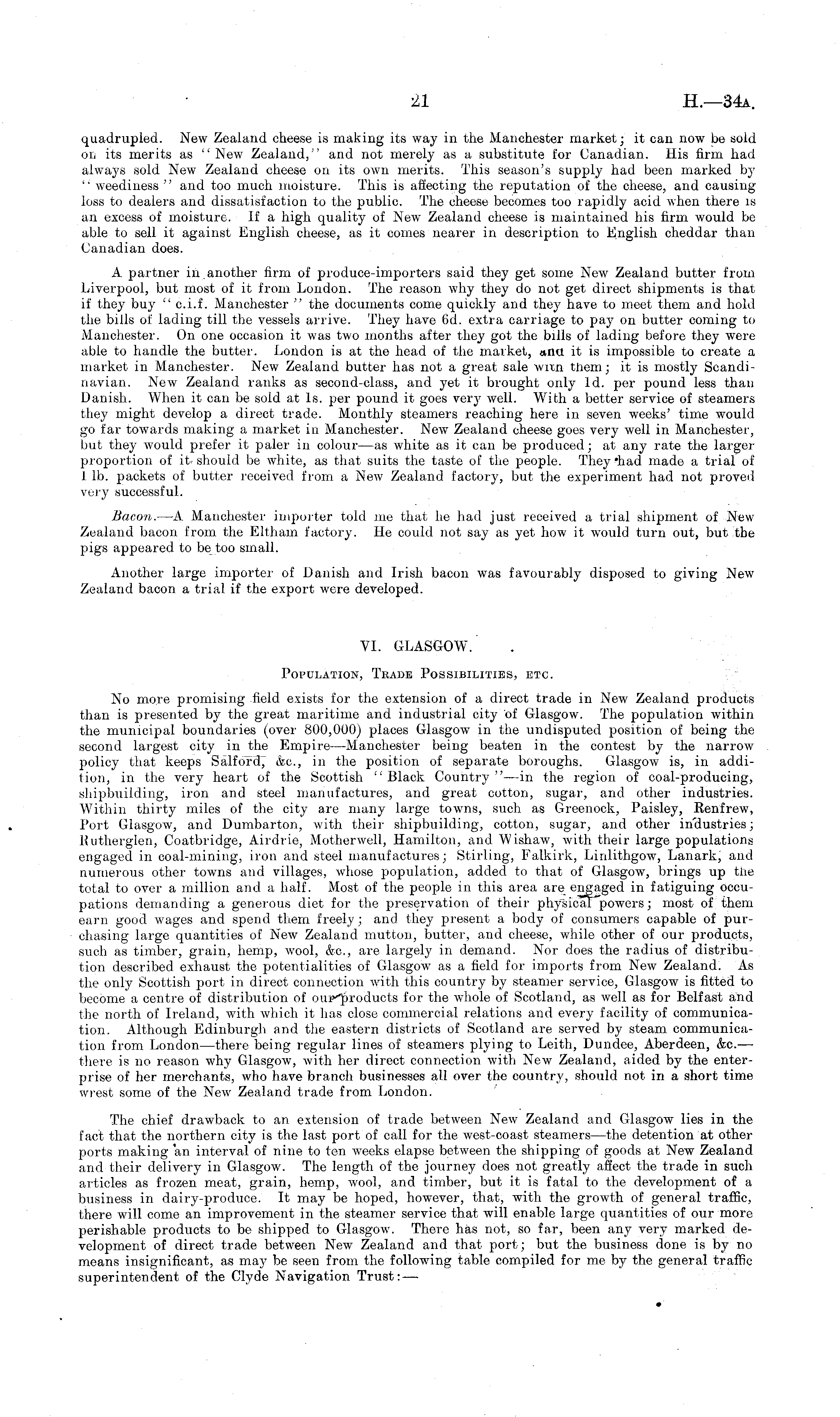 quadrupled. New Zealand cheese is making its way in the Manchester market; it can now be sold on its merits as "New Zealand," and not merely as a substitute for Canadian. His firm had always sold New Zealand cheese on its own merits. This season's supply had been marked by " weediness " and too much moisture. This is affecting the reputation of the cheese, and causing loss to dealers and dissatisfaction to the public. The cheese becomes too rapidly acid when there is an excess of moisture. If a high quality of New Zealand cheese is maintained his firm would be able to sell it against English cheese, as it comes nearer in description to English cheddar than Canadian does. A partner in another firm of produce-importers said they get some New Zealand butter from Liverpool, but most of it from London. The reason why they do not get direct shipments is that if they buy " c.i.f. Manchester " the documents come quickly and thejr have to meet them and hold the bills of lading till the vessels arrive. They have 6d. extra carriage to pay on butter coming to Manchester. On one occasion it was two months after they got the bills of lading before they were able to handle the butter. London is at the head of the market, arm it is impossible to create a market in Manchester. New Zealand butter has not a great sale witn them; it is mostly Scandinavian. New Zealand ranks as second-class, and yet it brought only Id. per pound less than Danish. When it can be sold at Is. per pound it goes very well. With a better service of steamers they might develop a direct trade. Monthly steamers reaching here in seven weeks' time would go far towards making a market in Manchester. New Zealand cheese goes very well in Manchester, but they would prefer it paler in colour—as white as it can be produced; at any rate the larger proportion of it. should be white, as that suits the taste of the people. They'had made a trial of I. lb. packets of butter received from a New Zealand factory, but the experiment had not proved very successful. Bacon. —A Manchester importer told me that he had just received a trial shipment of New Zealand bacon from the Eltham factory. He could not say as yet how it would turn out, but the pigs appeared to be too small. Another large importer of Danish and Irish bacon was favourably disposed to giving New Zealand bacon a trial if the export were developed. VI. GLASGOW. Population, Trade Possibilities, etc. No more promising field exists for the extension of a direct trade in New Zealand products than is presented by the great maritime and industrial city of Glasgow. The population within the municipal boundaries (over 800,000) places Glasgow in the undisputed position of being the second largest city in the Empire—Manchester being beaten in the contest by the narrow policy that keeps Salford, &c, in the position of separate boroughs. Glasgow is, in addition, in the very heart of the Scottish "Black Country"—in the region of coal-producing, shipbuilding, iron and steel manufactures, and great cotton, sugar, and other industries. Within thirty miles of the city are many large towns, such as Greenock, Paisley, Renfrew, Port Glasgow, and Dumbarton, with their shipbuilding, cotton, sugar, and other industries; Rutherglen, Coatbridge, Airdrie, Motherwell, Hamilton, and Wishaw, with their large populations engaged in coal-mining, iron and steel manufactures; Stirling, Falkirk, Linlithgow, Lanark, and numerous other towns and villages, whose population, added to that of Glasgow, brings up the total to over a million and a half. Most of the people in this area are engaged in fatiguing occupations demanding a generous diet for the preservation of their physical powers; most of them earn good wages and spend them freely ; and they present a body of consumers capable of purchasing large quantities of New Zealand mutton, butter, and cheese, while other of our products, such as timber, grain, hemp, wool, &c., are largely in demand. Nor does the radius of distribution described exhaust the potentialities of Glasgow as a field for imports from New Zealand. As the only Scottish port in direct connection with this country by steamer service, Glasgow is fitted to become a centre of distribution of oup-'products for the whole of Scotland, as well as for Belfast and the north of Ireland, with which it has close commercial relations and every facility of communication. Although Edinburgh and the eastern districts of Scotland are served by steam communication from London —there being regular lines of steamers plying to Leith, Dundee, Aberdeen, &c. — there is no reason why Glasgow, with her direct connection with New Zealand, aided by the enterprise of her merchants, who have branch businesses all over the country, should not in a short time wrest some of the New Zealand trade from London. The chief drawback to an extension of trade between New Zealand and Glasgow lies in the fact that the northern city is the last port of call for the west-coast steamers —the detention at other ports making 'an interval of nine to ten weeks elapse between the shipping of goods at New Zealand and their delivery in Glasgow. The length of the journey does not greatly affect the trade in such articles as frozen meat, grain, hemp, wool, and timber, but it is fatal to the development of a business in dairy-produce. It may be hoped, however, that, with the growth of general traffic, there will come an improvement in the steamer service that will enable large quantities of our more perishable products to be shipped to Glasgow. There has not, so far, been any very marked development of direct trade between New Zealand and that port; but the business done is by no means insignificant, as may be seen from the following table compiled for me by the general traffic superintendent of the Clyde Navigation Trust: —