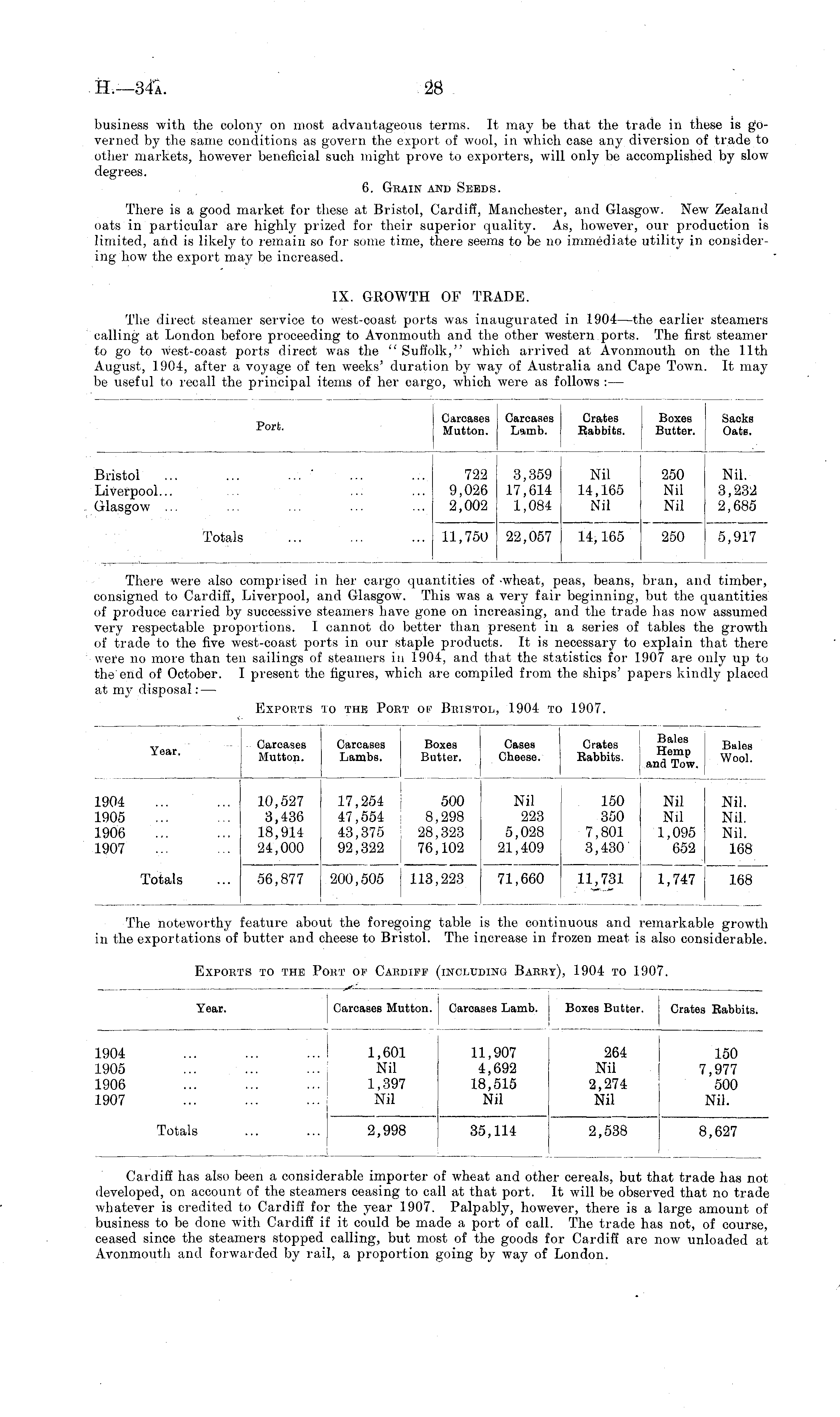 business with the colony on most advantageous terms. It may be that the trade in these is governed by the same conditions as govern the export of wool, in wiiich case any diversion of trade to other markets, however beneficial such might prove to exporters, will only be accomplished by slow degrees. 6. Grain and Seeds. There is a good market for these at Bristol, Cardiff, Manchester, and Glasgow. New Zealand oats in particular are highly prized for their superior quality. As, however, our production is limited, and is likely to remain so for some time, there seems to be no immediate utility in considering how the export may be increased. IX. GROWTH OF TRADE. The direct steamer service to west-coast ports was inaugurated in 1904 —the earlier steamers calling at London before proceeding to Avonmouth and the other western ports. The first steamer to go to w ; est-coast ports direct was the " Suffolk," which arrived at Avonmouth on the 11th August, 1904, after a voyage of ten weeks' duration by way of Australia and Cape Town. It may be useful to recall the principal items of her cargo, which were as follows : —