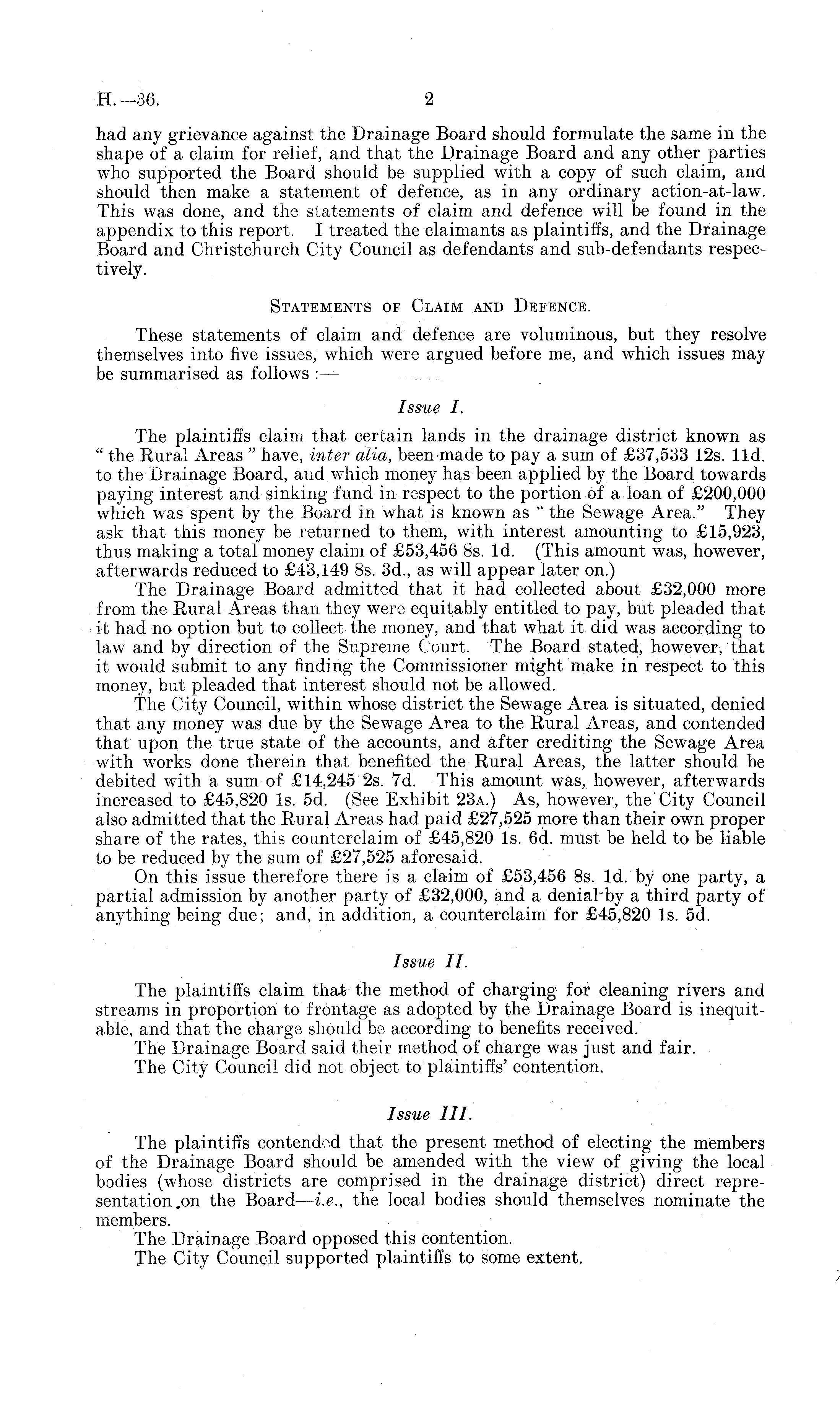 had any grievance against the Drainage Board should formulate the same in the shape of a claim for relief, and that the Drainage Board and any other parties who supported the Board should be supplied with a copy of such claim, and should then make a statement of defence, as in any ordinary action-at-law. This was done, and the statements of claim and defence will be found in the appendix to this report. I treated the claimants as plaintiffs, and the Drainage Board and Christchurch City Council as defendants and sub-defendants respectively. Statements of Claim and Defence. These statements of claim and defence are voluminous, but they resolve themselves into five issues, which were argued before me, and which issues may be summarised as follows : — Issue I. The plaintiffs claim that certain lands in the drainage district known as " the Rural Areas " have, inter alia, been-made to pay a sum of £37,533 12s. lid. to the Drainage Board, and which money has been applied by the Board towards paying interest and sinking fund in respect to the portion of a loan of £200,000 which was spent by the Board in what is known as " the Sewage Area." They ask that this money be returned to them, with interest amounting to £15,923, thus making a total money claim of £53,456 Bs. Id. (This amount was, however, afterwards reduced to £43,149 Bs. 3d., as will appear later on.) The Drainage Board admitted that it had collected about £32,000 more from the Rural Areas than they were equitably entitled to pay, but pleaded that it had no option but to collect the money, and that what it did was according to law and by direction of the Supreme Court. The Board stated, however, that it would submit to any finding the Commissioner might make in respect to this money, but pleaded that interest should not be allowed. The City Council, within whose district the Sewage Area is situated, denied that any money was due by the Sewage Area to the Rural Areas, and contended that upon the true state of the accounts, and after crediting the Sewage Area with works done therein that benefited the Rural Areas, the latter should be debited with a sum of £14,245 2s. 7d. This amount was, however, afterwards increased to £45,820 Is. sd. (See Exhibit 23a.) As, however, the'City Council also admitted that the Rural Areas had paid £27,525 more than their own proper share of the rates, this counterclaim of £45,820 Is. 6d. must be held to be liable to be reduced by the sum of £27,525 aforesaid. On this issue therefore there is a claim of £53,456 Bs. Id. by one party, a partial admission by another party of £32,000, and a denial by a third party of anything being due; and, in addition, a counterclaim for £45,820 Is. sd. Issue 11. The plaintiffs claim that the method of charging for cleaning rivers and streams in proportion to frontage as adopted by the Drainage Board is inequitable, and that the charge should be according to benefits received. The Drainage Board said their method of charge was just and fair. The City Council did not object to plaintiffs' contention. Issue 111. The plaintiffs contended that the present method of electing the members of the Drainage Board should be amended with the view of giving the local bodies (whose districts are comprised in the drainage district) direct representation .on the Board — i.e., the local bodies should themselves nominate the members. The Drainage Board opposed this contention. The City Council supported plaintiffs to some extent.