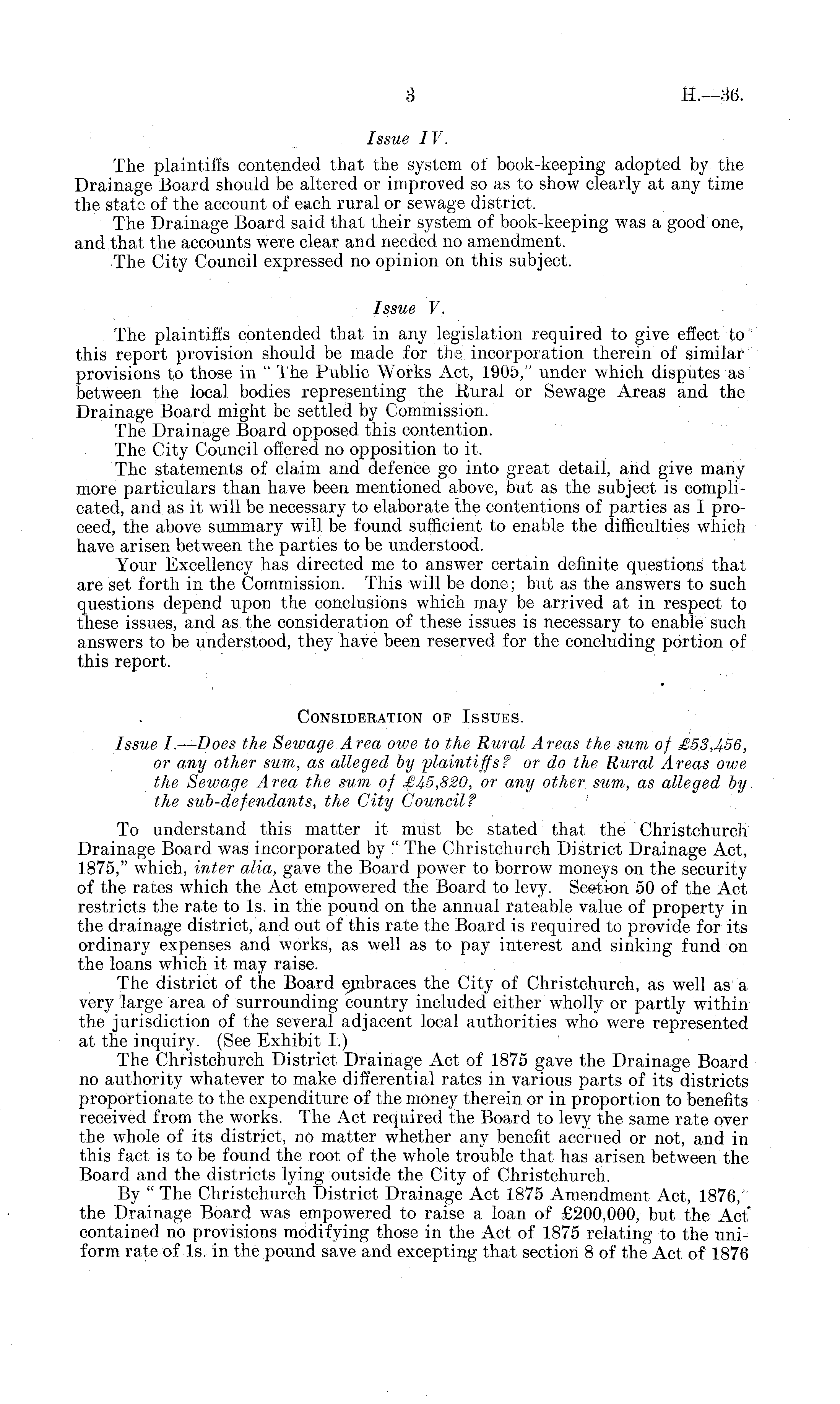 Issue IV. The plaintiffs contended that the system of book-keeping adopted by the Drainage Board should be altered or improved so as to show clearly at any time the state of the account of each rural or sewage district. The Drainage Board said that their system of book-keeping was a good one, and that the accounts were clear and needed no amendment. The City Council expressed no opinion on this subject. Issue V. The plaintiffs contended that in any legislation required to give effect to this report provision should be made for the incorporation therein of similar provisions to those in " The Public Works Act, 1905," under which disputes as between the local bodies representing the Rural or Sewage Areas and the Drainage Board might be settled by Commission. The Drainage Board opposed this contention. The City Council offered no opposition to it. The statements of claim and defence go into great detail, and give many more particulars than have been mentioned above, but as the subject is complicated, and as it will be necessary to elaborate the contentions of parties as I proceed, the above summary will be found sufficient to enable the difficulties which have arisen between the parties to be understood. Your Excellency has directed me to answer certain definite questions that are set forth in the Commission. This will be done; but as the answers to such questions depend upon the conclusions which may be arrived at in respect to these issues, and as the consideration of these issues is necessary to enable such answers to be understood, they have been reserved for the concluding portion of this report. Consideration of Issues. Issue I. — Does the Sewage Area owe to the Rural Areas the sum of £53,456, or a,ny other sum, as alleged by plaintiffs? or do the Rural Areas owe the Sewage Area the sum of £45,820, or any other sum, as alleged by the sub-defendants, the City Council? To understand this matter it must be stated that the Christchurch Drainage Board was incorporated by " The Christchurch District Drainage Act, 1875," which, inter alia, gave the Board power to borrow moneys on the security of the rates which the Act empowered the Board to levy. Section 50 of the Act restricts the rate to Is. in the pound on the annual rateable value of property in the drainage district, and out of this rate the Board is required to provide for its ordinary expenses and works, as well as to pay interest and sinking fund on the loans which it may raise. The district of the Board embraces the City of Christchurch, as well as a very large area of surrounding country included either wholly or partly within the jurisdiction of the several adjacent local authorities who were represented at the inquiry. (See Exhibit I.) The Christchurch District Drainage Act of 1875 gave the Drainage Board no authority whatever to make differential rates in various parts of its districts proportionate to the expenditure of the money therein or in proportion to benefits received from the works. The Act required the Board to levy the same rate over the whole of its district, no matter whether any benefit accrued or not, and in this fact is to be found the root of the whole trouble that has arisen between the Board and the districts lying outside the City of Christchurch. By " The Christchurch District Drainage Act 1875 Amendment Act, 1876/' the Drainage Board was empowered to raise a loan of £200,000, but the Act contained no provisions modifying those in the Act of 1875 relating to the uniform rate of Is. in the pound save and excepting that section 8 of the Act of 1876