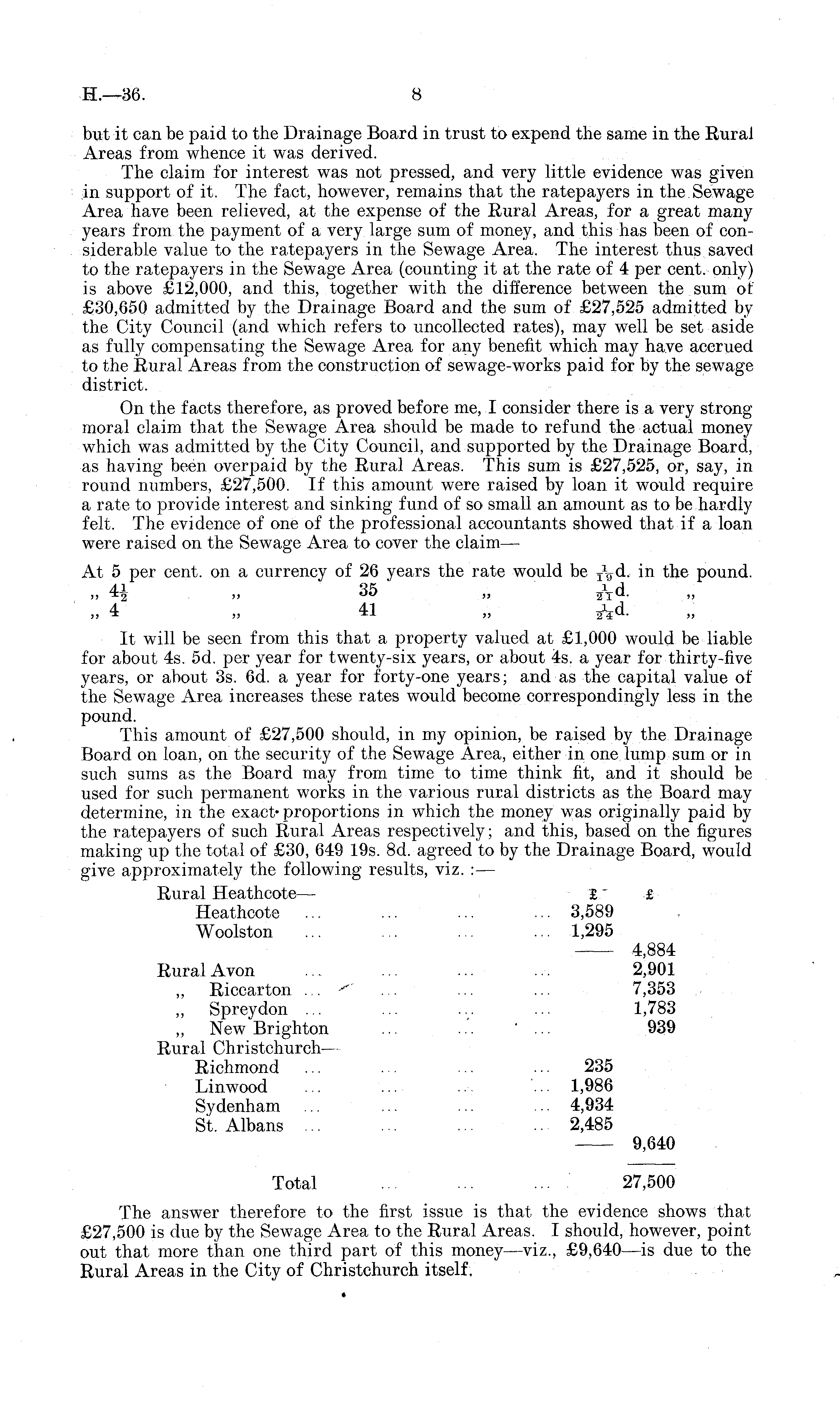but it can be paid to the Drainage Board in trust to expend the same in the Rural Areas from whence it was derived. The claim for interest was not pressed, and very little evidence was given in support of it. The fact, however, remains that the ratepayers in the Sewage Area have been relieved, at the expense of the Rural Areas, for a great many years from the payment of a very large sum of money, and this has been of considerable value to the ratepayers in the Sewage Area. The interest thus saved to the ratepayers in the Sewage Area (counting it at the rate of 4 per cent, only) is above £12,000, and this, together with the difference between the sum of £30,650 admitted by the Drainage Board and the sum of £27,525 admitted by the City Council (and which refers to uncollected rates), may well be set aside as fully compensating the Sewage Area for any benefit which may have accrued to the Rural Areas from the construction of sewage-works paid for by the sewage district. On the facts therefore, as proved before me, I consider there is a very strong moral claim that the Sewage Area should be made to refund the actual money which was admitted by the City Council, and supported by the Drainage Board, as having been overpaid by the Rural Areas. This sum is £27,525, or, say, in round numbers, £27,500. If this amount were raised by loan it would require a rate to provide interest and sinking fund of so small an amount as to be hardly felt. The evidence of one of the professional accountants showed that if a loan were raised on the Sewage Area to cover the claim— At 5 per cent, on a currency of 26 years the rate would be j\d. in the pound. d.l I/) 4 41 -A-d It will be seen from this that a property valued at £1,000 would be liable for about 4s. sd. per year for twenty-six years, or about 4s. a year for thirty-five years, or about 3s. 6d. a year for forty-one years; and as the capital value of the Sewage Area increases these rates would become correspondingly less in the pound. This amount of £27,500 should, in my opinion, be raised by the Drainage Board on loan, on the security of the Sewage Area, either in one lump sum or in such sums as the Board may from time to time think fit, and it should be used for such permanent works in the various rural districts as the Board may determine, in the exact- proportions in which the money was originally paid by the ratepayers of such Rural Areas respectively; and this, based on the figures making up the total of £30, 649 19s. Bd. agreed to by the Drainage Board, would give approximately the following results, viz. :— Rural Heathcote— £ £ Heathcote ... ... ... ... 3,589 Woolston ... ... ... ... 1,295 4,884 Rural Avon ... ... ... ... 2,901 „ Riccarton ... "' ... ... ... 7,353 ~ Spreydon ... ... ... ... 1,783 New Brighton ... ... "... 939 Rural Christchurch — Richmond ... ... ... ... 235 Linwood ... 1,986 Sydenham ... ... ... ... 4,934 St. Albans 2,485 9,640 Total ... ... 27,500 The answer therefore to the first issue is that the evidence shows that £27,500 is due by the Sewage Area to the Rural Areas. I should, however, point out that more than one third part of this money —viz., £9,640 —is due to the Rural Areas in the City of Christchurch itself.