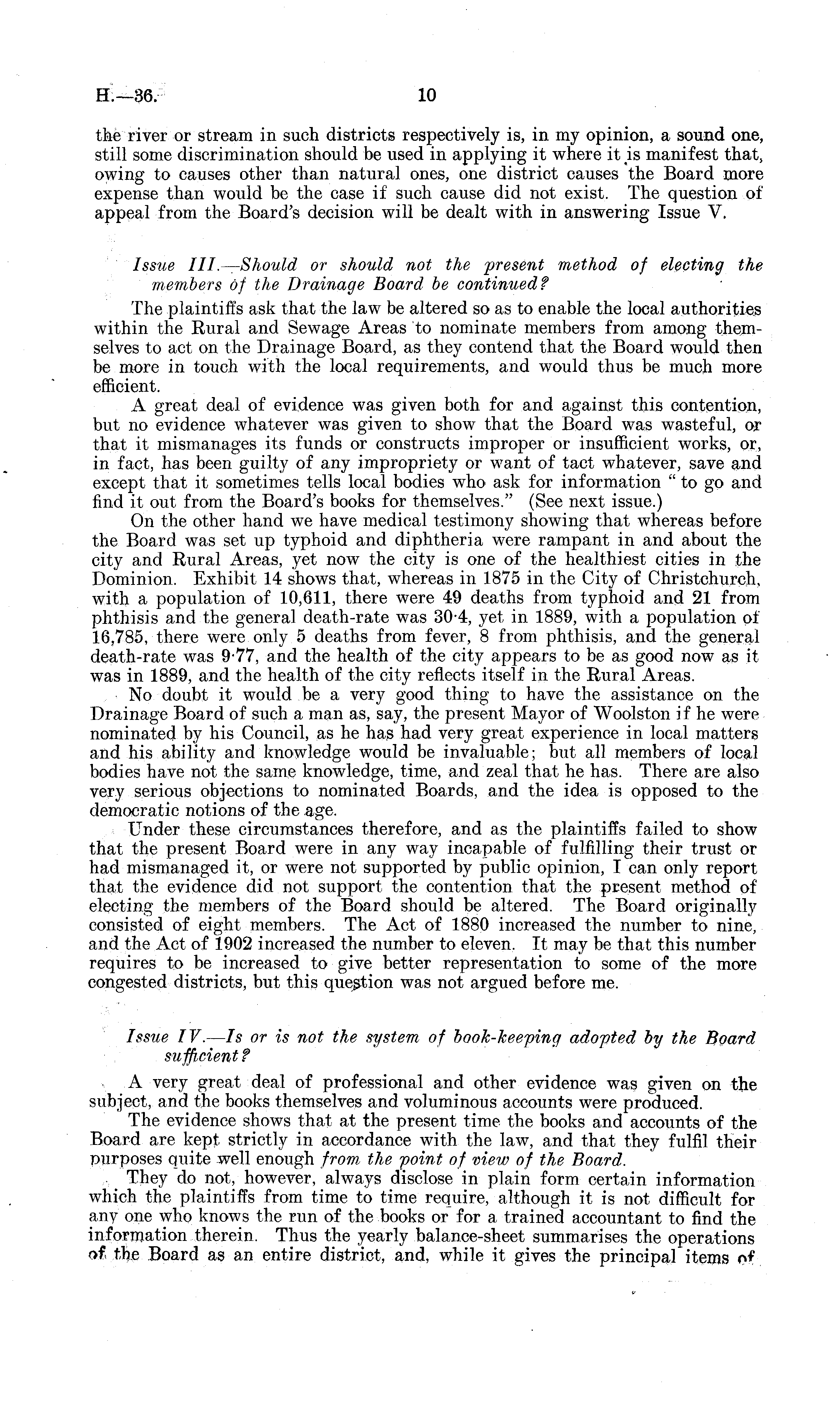 the river or stream in such districts respectively is, in my opinion, a sound one, still some discrimination should be used in applying it where it is manifest that, owing to causes other than natural ones, one district causes the Board more expense than would be the case if such cause did not exist. The question of appeal from the Board's decision will be dealt with in answering Issue V. Issue lll.—Should or should not the -present method of electing the members of the Drainage Board be continued? The plaintiffs ask that the law be altered so as to enable the local authorities within the Rural and Sewage Areas to nominate members from among themselves to act on the Drainage Board, as they contend that the Board would then be more in touch with the local requirements, and would thus be much more efficient. A great deal of evidence was given both for and against this contention, but no evidence whatever was given to show that the Board was wasteful, or that it mismanages its funds or constructs improper or insufficient works, or, in fact, has been guilty of any impropriety or want of tact whatever, save and except that it sometimes tells local bodies who ask for information " to go and find it out from the Board's books for themselves." (See next issue.) On the other hand we have medical testimony showing that whereas before the Board was set up typhoid and diphtheria were rampant in and about the city and Rural Areas, yet now the city is one of the healthiest cities in the Dominion. Exhibit 14 shows that, whereas in 1875 in the City of Christchurch, with a population of 10,611, there were 49 deaths from typhoid and 21 from phthisis and the general death-rate was 30-4, yet in 1889, with a population of 16,785, there were only 5 deaths from fever, 8 from phthisis, and the general death-rate was 9-77, and the health of the city appears to be as good now as it was in 1889, and the health of the city reflects itself in the Rural Areas. No doubt it would be a very good thing to have the assistance on the Drainage Board of such a man as, say, the present Mayor of Woolston if he were nominated by his Council, as he has had very great experience in local matters and his ability and knowledge would be invaluable; but all members of local bodies have not the same knowledge, time, and zeal that he has. There are also very serious objections to nominated Boards, and the idea is opposed to the democratic notions of the age. Under these circumstances therefore, and as the plaintiffs failed to show that the present Board were in any way incapable of fulfilling their trust or had mismanaged it, or were not supported by public opinion, I can only report that the evidence did not support the contention that the present method of electing the members of the Board should be altered. The Board originally consisted of eight members. The Act of 1880 increased the number to nine, and the Act of 1902 increased the number to eleven. It may be that this number requires to be increased to give better representation to some of the more congested districts, but this question was not argued before me. Issue IV. — ls or is not the system of book-keeping adopted by the Board sufficient ? A very great deal of professional and other evidence was given on the subject, and the books themselves and voluminous accounts were produced. The evidence shows that at the present time the books and accounts of the Board are kept strictly in accordance with the law, and that they fulfil their purposes quite well enough from the point of view of the Board. They do not, however, always disclose in plain form certain information which the plaintiffs from time to time require, although it is not difficult for any one who knows the run of the books or for a trained accountant to find the information therein. Thus the yearly balance-sheet summarises the operations of the Board as an entire district, and, while it gives the principal items of