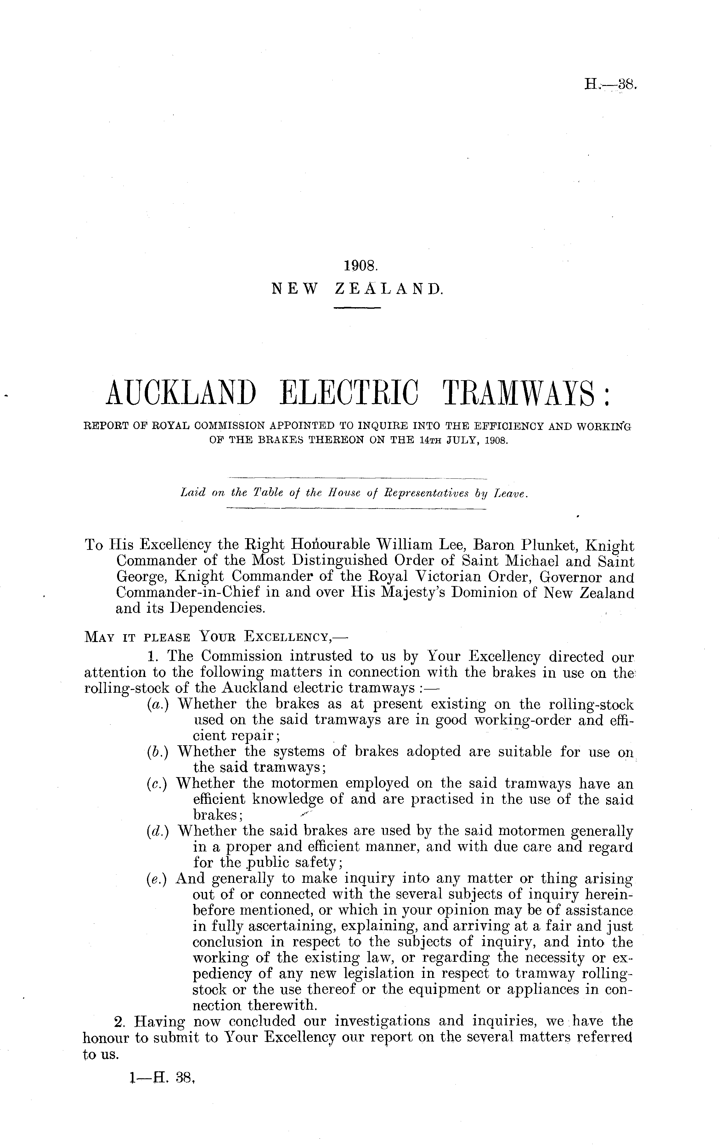 AUCKLAND ELECTRIC TRAMWAYS: REPORT OF ROYAL COMMISSION APPOINTED TO INQUIRE INTO THE EFFICIENCY AND WORKING OF THE BRAKES THEREON ON THE 14th JULY, 1908.