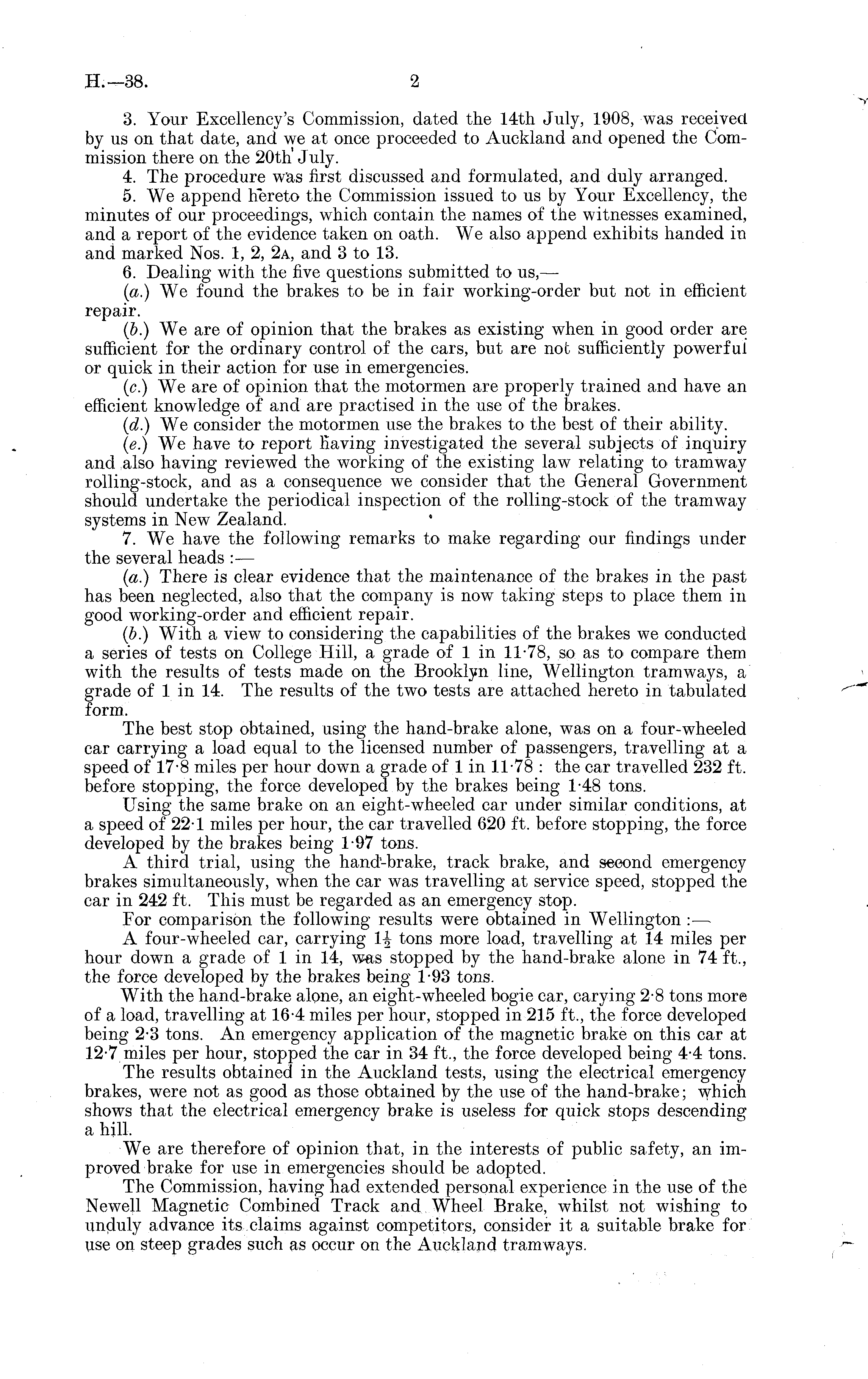 3. Your Excellency's Commission, dated the 14th July, 1908, was received by us on that date, and we at once proceeded to Auckland and opened the Commission there on the 20th' July. 4. The procedure was first discussed and formulated, and duly arranged. 5. We append hereto the Commission issued to us by Your Excellency, the minutes of our proceedings, which contain the names of the witnesses examined, and a report of the evidence taken on oath. We also append exhibits handed in and marked Nos. 1, 2, 2a, and 3 to 13. 6. Dealing with the five questions submitted to us, — (a.) We found the brakes to be in fair working-order but not in efficient repair. (b.) We are of opinion that the brakes as existing when in good order are sufficient for the ordinary control of the cars, but are not sufficiently powerful or quick in their action for use in emergencies. (c.) We are of opinion that the motormen are properly trained and have an efficient knowledge of and are practised in the use of the brakes. (d.) We consider the motormen use the brakes to the best of their ability. (<?.) We have to report Having investigated the several subjects of inquiry and also having reviewed the working of the existing law relating to tramway rolling-stock, and as a consequence we consider that the General Government should undertake the periodical inspection of the rolling-stock of the tramway systems in New Zealand. 7. We have the following remarks to make regarding our findings under the several heads :— (a.) There is clear evidence that the maintenance of the brakes in the past has been neglected, also that the company is now taking steps to place them in good working-order and efficient repair. (b.) With a view to considering the capabilities of the brakes we conducted a series of tests on College Hill, a grade of 1 in 11-78, so as to compare them with the results of tests made on the Brooklyn line, Wellington tramways, a grade of 1 in 14. The results of the two tests are attached hereto in tabulated form. The best stop obtained, using the hand-brake alone, was on a four-wheeled car carrying a load equal to the licensed number of passengers, travelling at a speed of 17-8 miles per hour down a grade of 1 in 11-78 : the car travelled 232 ft. before stopping, the force developed by the brakes being 1-48 tons. Using the same brake on an eight-wheeled car under similar conditions, at a speed of 22-1 miles per hour, the car travelled 620 ft. before stopping, the force developed by the brakes being 1-97 tons. A third trial, using the hand-brake, track brake, and second emergency brakes simultaneously, when the car was travelling at service speed, stopped the car in 242 ft. This must be regarded as an emergency stop. For comparison the following results were obtained in Wellington :— A four-wheeled car, carrying tons more load, travelling at 14 miles per hour down a grade of 1 in 14, was stopped by the hand-brake alone in 74 ft., the force developed by the brakes being 1-93 tons. With the hand-brake alone, an eight-wheeled bogie car, carying 2-8 tons more of a load, travelling at 16-4 miles per hour, stopped in 215 ft., the force developed being 2-3 tons. An emergency application of the magnetic brake on this car at 12-7 miles per hour, stopped the car in 34 ft., the force developed being 4-4 tons. The results obtained in the Auckland tests, using the electrical emergency brakes, were not as good as those obtained by the use of the hand-brake; which shows that the electrical emergency brake is useless for quick stops descending a hill. We are therefore of opinion that, in the interests of public safety, an improved brake for use in emergencies should be adopted. The Commission, having had extended personal experience in the use of the Newell Magnetic Combined Track and Wheel Brake, whilst not wishing to unduly advance its claims against competitors, consider it a suitable brake for use on steep grades such as occur on the Auckland tramways.