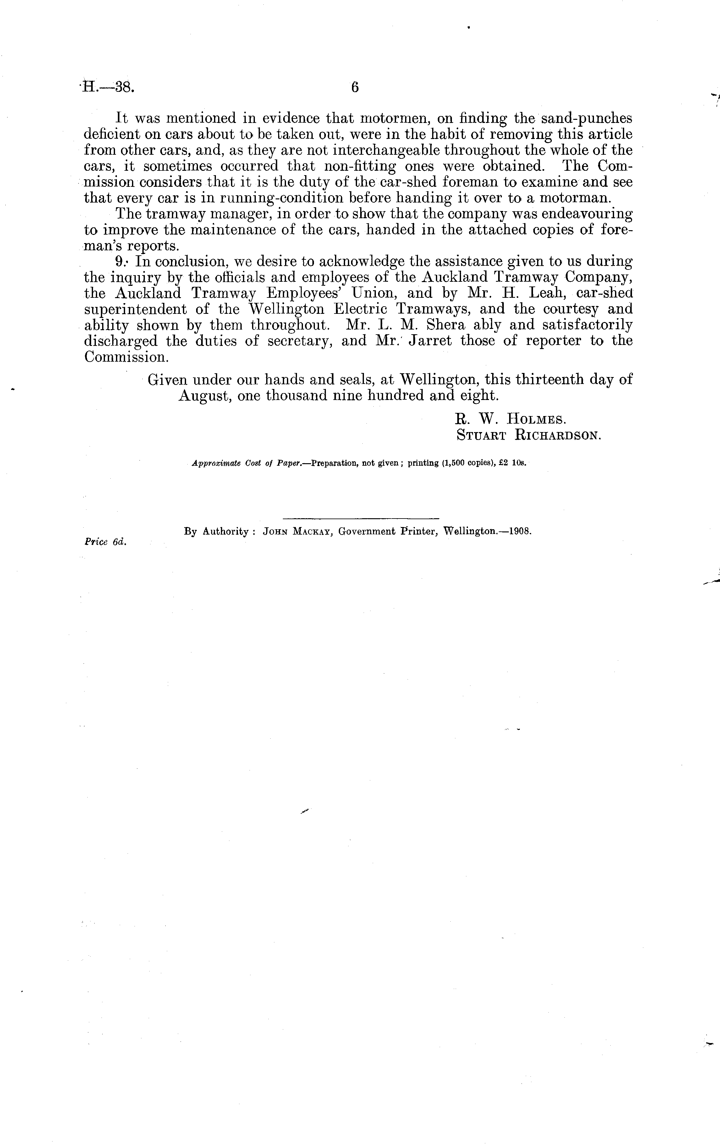 It was mentioned in evidence that motormen, on finding the sand-punches deficient on cars about to be taken out, were in the habit of removing this article from other cars, and, as they are not interchangeable throughout the whole of the cars, it sometimes occurred that non-fitting ones were obtained. The Commission considers that it is the duty of the car-shed foreman to examine and see that every car is in running-condition before handing it over to a motorman. The tramway manager, in order to show that the company was endeavouring to improve the maintenance of the cars, handed in the attached copies of foreman's reports. 9.- In conclusion, we desire to acknowledge the assistance given to us during the inquiry by the officials and employees of the Auckland Tramway Company, the Auckland Tramway Employees' Union, and by Mr. H. Leah, car-shed superintendent of the Wellington Electric Tramways, and the courtesy and ability shown by them throughout. Mr. L. M. Shera ably and satisfactorily discharged the duties of secretary, and Mr. Jarret those of reporter to the Commission. Given under our hands and seals, at Wellington, this thirteenth day of August, one thousand nine hundred and eight. R. W. Holmes. Stuart Richardson. Approximate Cost of Paper. —Preparation, not given; printing (1,500 copies), £2 10s.