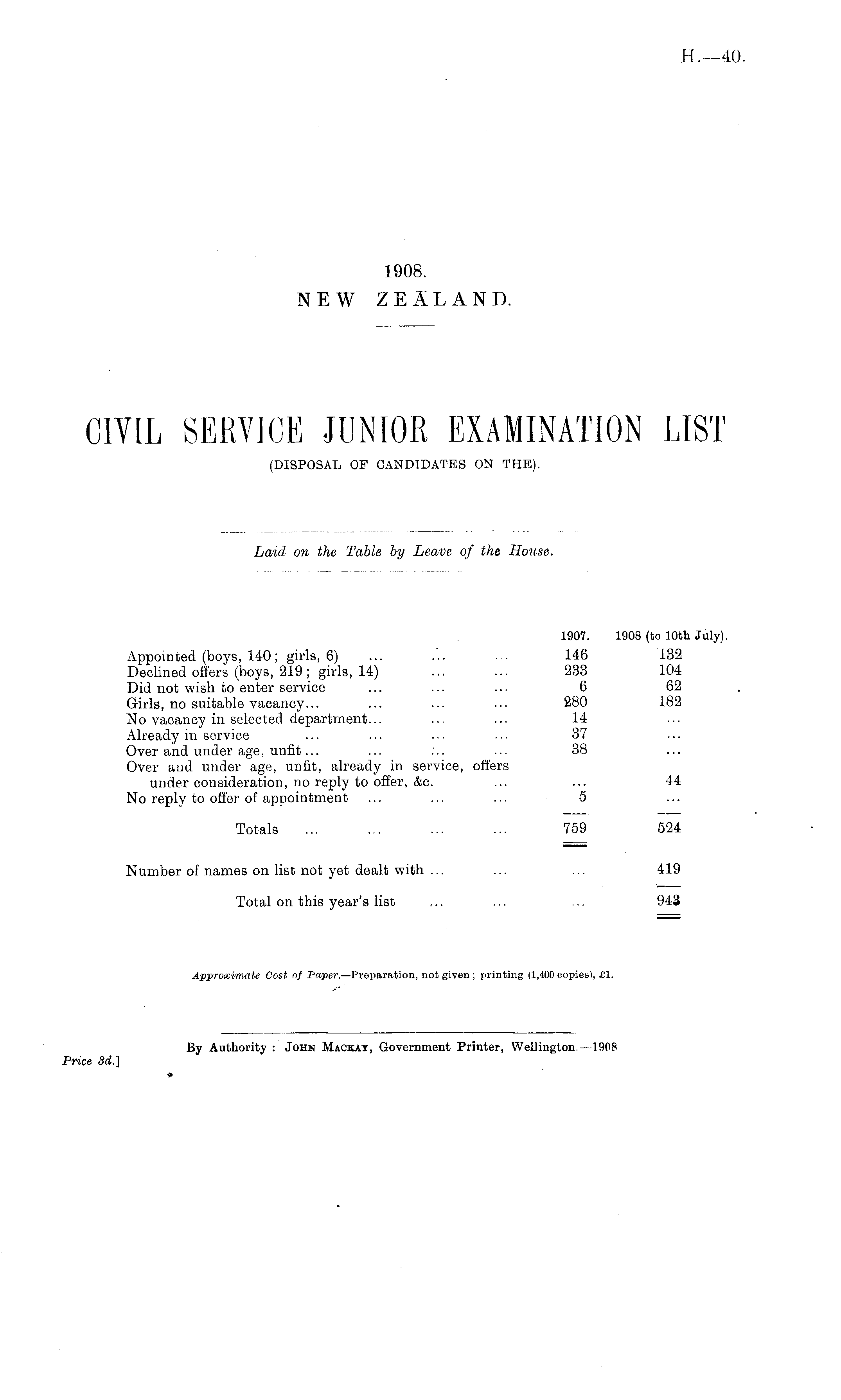 1907. 1908 (to 10th July). Appointed (boys, 140; girls, 6) ... ~. ... 146 132 Declined offers (boys, 219; girls, 14) ... ... 233 104 Did not wish to enter service ... ... ... 6 62 Girls, no suitable vacancy... ... ... ... 280 182 No vacancy in selected department... ... ... 14 Already in service ... ... ... ... 37 Over and under age, unfit... ... ... ... 38 Over and under age, unfit, already in service, offers under consideration, no reply to offer, <fee. ... ... 44 No reply to offer of appointment ... ... ... 5 Totals 759 524 Number of names on list not yet dealt with ... ... ... 419 Total on this year's list ... ... ... 943 Approximate Cost of Paper. —Preparation, not given ; printing (1,400 copies), £1,