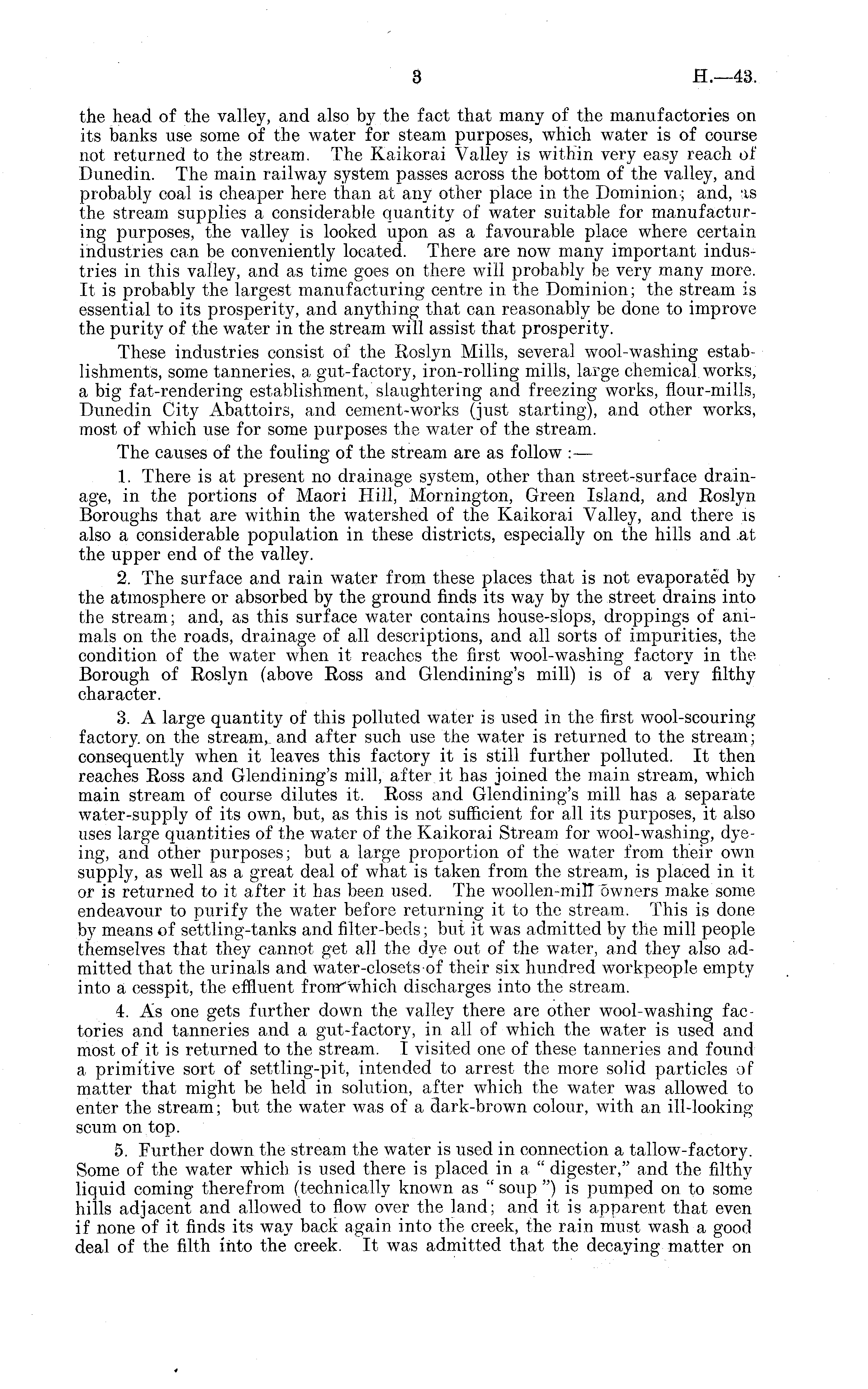 the head of the valley, and also by the fact that many of the manufactories on its banks use some of the water for steam purposes, which water is of course not returned to the stream. The Kaikorai Valley is within very easy reach of Dunedin. The main railway system passes across the bottom of the valley, and probably coal is cheaper here than at any other place in the Dominion; and, as the stream supplies a considerable quantity of water suitable for manufacturing purposes, the valley is looked upon as a favourable place where certain industries can be conveniently located. There are now many important industries in this valley, and as time goes on there will probably be very many more. It is probably the largest manufacturing centre in the Dominion; the stream is essential to its prosperity, and anything that can reasonably be done to improve the purity of the water in the stream will assist that prosperity. These industries consist of the Roslyn Mills, several wool-washing establishments, some tanneries, a gut-factory, iron-rolling mills, large chemical works, a big fat-rendering establishment, slaughtering and freezing works, flour-mills, Dunedin City Abattoirs, and cement-works (just starting), and other works, most of which use for some purposes the water of the stream. The causes of the fouling of the stream are as follow : — 1. There is at present no drainage system, other than street-surface drainage, in the portions of Maori Hill, Mornington, Green Island, and Roslyn Boroughs that are within the watershed of the Kaikorai Valley, and there is also a considerable population in these districts, especially on the hills and at the upper end of the valley. 2. The surface and rain water from these places that is not evaporated by the atmosphere or absorbed by the ground finds its way by the street drains into the stream; and, as this surface water contains house-slops, droppings of animals on the roads, drainage of all descriptions, and all sorts of impurities, the condition of the water when it reaches the first wool-washing factory in the Borough of Roslyn (above Ross and Glendining's mill) is of a very filthy character. 3. A large quantity of this polluted water is used in the first wool-scouring factory, on the stream, and after such use the water is returned to the stream; consequently when it leaves this factory it is still further polluted. It then reaches Ross and Glendining's mill, after it has joined the main stream, which main stream of course dilutes it. Ross and Glendining's mill has a separate water-supply of its own, but, as this is not sufficient for all its purposes, it also uses large quantities of the water of the Kaikorai Stream for wool-washing, dyeing, and other purposes; but a large proportion of the water from their own supply, as well as a great deal of what is taken from the stream, is placed in it or is returned to it after it has been used. The woollen-mill owners make some endeavour to purify the water before returning it to the stream. This is done by means of settling-tanks and filter-beds; but it was admitted by the mill people themselves that they cannot get all the dye out of the water, and they also admitted that the urinals and water-closets of their six hundred workpeople empty into a cesspit, the effluent from'which discharges into the stream. 4. As one gets further down the valley there are other wool-washing factories and tanneries and a gut-factory, in all of which the water is used and most of it is returned to the stream. I visited one of these tanneries and found a primitive sort of settling-pit, intended to arrest the more solid particles of matter that might be held in solution, after which the water was allowed to enter the stream; but the water was of a dark-brown colour, with an ill-looking scum on top. 5. Further down the stream the water is used in connection a tallow-factory. Some of the water which is used there is placed in a " digester," and the filthy liquid coming therefrom (technically known as " soup ") is pumped on to some hills adjacent and allowed to flow over the land; and it is apparent that even if none of it finds its way back again into the creek, the rain must wash a good deal of the filth into the creek. It was admitted that the decaying matter on
