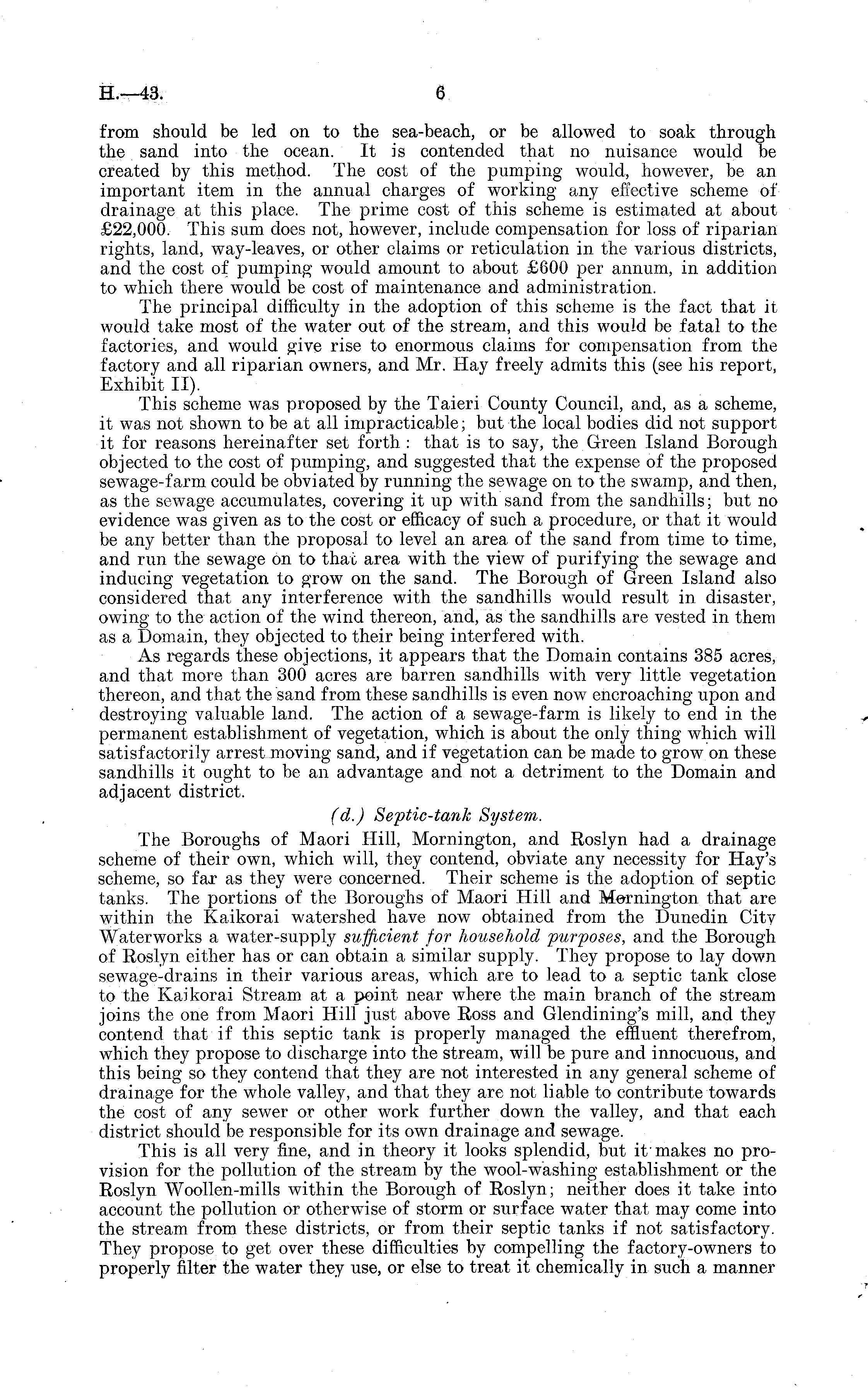 from should be led on to the sea-beach, or be allowed to soak through the sand into the ocean. It is contended that no nuisance would be created by this method. The cost of the pumping would, however, be an important item in the annual charges of working any effective scheme of drainage at this place. The prime cost of this scheme is estimated at about £22,000. This sum does not, however, include compensation for loss of riparian rights, land, way-leaves, or other claims or reticulation in the various districts, and the cost of pumping would amount to about £600 per annum, in addition to which there would be cost of maintenance and administration. The principal difficulty in the adoption of this scheme is the fact that it would take most of the water out of the stream, and this would be fatal to the factories, and would give rise to enormous claims for compensation from the factory and all riparian owners, and Mr. Hay freely admits this (see his report, Exhibit II). This scheme was proposed by the Taieri County Council, and, as a scheme, it was not shown to be at all impracticable; but the local bodies did not support it for reasons hereinafter set forth : that is to say, the Green Island Borough objected to the cost of pumping, and suggested that the expense of the proposed sewage-farm could be obviated by running the sewage on to the swamp, and then, as the sewage accumulates, covering it up with sand from the sandhills; but no evidence was given as to the cost or efficacy of such a procedure, or that it would be any better than the proposal to level an area of the sand from time to time, and run the sewage on to that area with the view of purifying the sewage and inducing vegetation to grow on the sand. The Borough of Green Island also considered that any interference with the sandhills would result in disaster, owing to the action of the wind thereon, and, as the sandhills are vested in them as a Domain, they objected to their being interfered with. As regards these objections, it appears that the Domain contains 385 acres, and that more than 300 acres are barren sandhills with very little vegetation thereon, and that the sand from these sandhills is even now encroaching upon and destroying valuable land. The action of a sewage-farm is likely to end in the permanent establishment of vegetation, which is about the only thing which will satisfactorily arrest moving sand, and if vegetation can be made to grow on these sandhills it ought to be an advantage and not a detriment to the Domain and adjacent district. (d.) Septic-tank System. The Boroughs of Maori Hill, Mornington, and Roslyn had a drainage scheme of their own, which will, they contend, obviate any necessity for Hay's scheme, so fax as they were concerned. Their scheme is the adoption of septic tanks. The portions of the Boroughs of Maori Hill and Mornington that are within the Kaikorai watershed have now obtained from the Dunedin City Waterworks a water-supply sufficient for household purposes, and the Borough of Roslyn either has or can obtain a similar supply. They propose to lay down sewage-drains in their various areas, which are to lead to a septic tank close to the Kaikorai Stream at a point near where the main branch of the stream joins the one from Maori Hill just above Ross and Glendining's mill, and they contend that if this septic tank is properly managed the effluent therefrom, which they propose to discharge into the stream, will be pure and innocuous, and this being so they contend that they are not interested in any general scheme of drainage for the whole valley, and that they are not liable to contribute towards the cost of any sewer or other work further down the valley, and that each district should be responsible for its own drainage and sewage. This is all very fine, and in theory it looks splendid, but it'makes no provision for the pollution of the stream by the wool-washing establishment or the Roslyn Woollen-mills within the Borough of Roslyn; neither does it take into account the pollution or otherwise of storm or surface water that may come into the stream from these districts, or from their septic tanks if not satisfactory. They propose to get over these difficulties by compelling the factory-owners to properly filter the water they use, or else to treat it chemically in such a manner