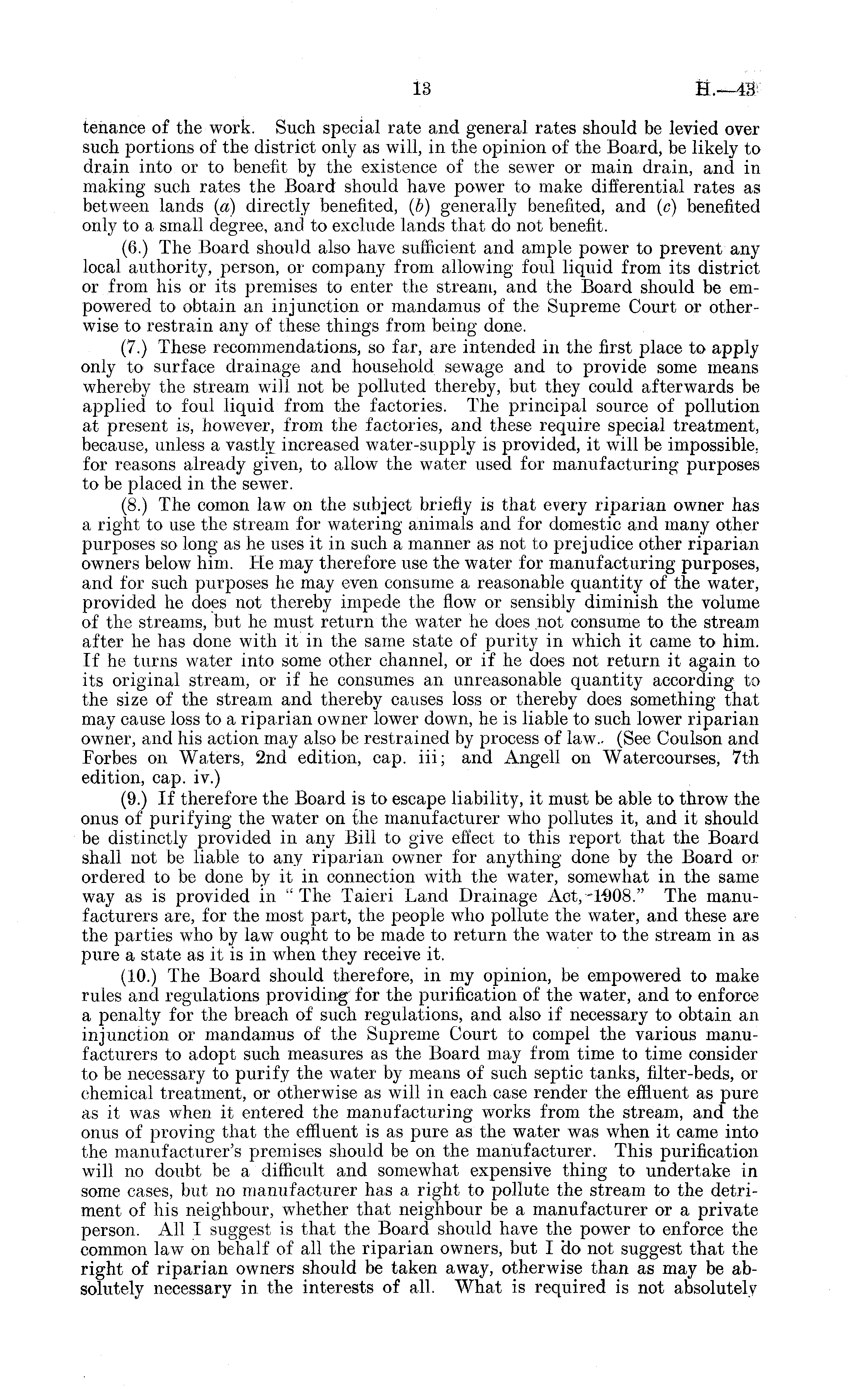 tenance of the work. Such special rate and general rates should be levied over such portions of the district only as will, in the opinion of the Board, be likely to drain into or to benefit by the existence of the sewer or main drain, and in making such rates the Board should have power to make differential rates as between lands (a) directly benefited, (b) generally benefited, and (c) benefited only to a small degree, and to exclude lands that do not benefit. (6.) The Board should also have sufficient and ample power to prevent any local authority, person, or company from allowing foul liquid from its district or from his or its premises to enter the stream, and the Board should be empowered to obtain an injunction or mandamus of the Supreme Court or otherwise to restrain any of these things from being done. (7.) These recommendations, so far, are intended in the first place to apply only to surface drainage and household sewage and to provide some means whereby the stream will not be polluted thereby, but they could afterwards be applied to foul liquid from the factories. The principal source of pollution at present is, however, from the factories, and these require special treatment, because, unless a vastly increased water-supply is provided, it will be impossible, for reasons already given, to allow the water used for manufacturing purposes to be placed in the sewer. (8.) The comon law on the subject briefly is that every riparian owner has a right to use the stream for watering animals and for domestic and many other purposes so long as he uses it in such a manner as not to prejudice other riparian owners below him. He may therefore use the water for manufacturing purposes, and for such purposes he may even consume a reasonable quantity of the water, provided he does not thereby impede the flow or sensibly diminish the volume of the streams, but he must return the water he does not consume to the stream after he has done with it in the same state of purity in which it came to him. If he turns water into some other channel, or if he does not return it again to its original stream, or if he consumes an unreasonable quantity according to the size of the stream and thereby causes loss or thereby does something that may cause loss to a riparian owner lower down, he is liable to such lower riparian owner, and his action may also be restrained by process of law.. (See Coulson and Forbes on Waters, 2nd edition, cap. iii; and Angell on Watercourses, 7th edition, cap. iv.) (9.) If therefore the Board is to escape liability, it must be able to throw the onus of purifying the water on the manufacturer who pollutes it, and it should be distinctly provided in any Bill to give effect to this report that the Board shall not be liable to any riparian owner for anything done by the Board or ordered to be done by it in connection with the water, somewhat in the same way as is provided in " The Taieri Land Drainage Act, 1908." The manufacturers are, for the most part, the people who pollute the water, and these are the parties who by law ought to be made to return the water to the stream in as pure a state as it is in when they receive it. (10.) The Board should therefore, in my opinion, be empowered to make rules and regulations providing for the purification of the water, and to enforce a penalty for the breach of such regulations, and also if necessary to obtain an injunction or mandamus of the Supreme Court to compel the various manufacturers to adopt such measures as the Board may from time to time consider to be necessary to purify the water by means of such septic tanks, filter-beds, or chemical treatment, or otherwise as will in each case render the effluent as pure as it was when it entered the manufacturing works from the stream, and the onus of proving that the effluent is as pure as the water was when it came into the manufacturer's premises should be on the manufacturer. This purification will no doubt be a difficult and somewhat expensive thing to undertake in some cases, but no manufacturer has a right to pollute the stream to the detriment of his neighbour, whether that neighbour be a manufacturer or a private person. All I suggest is that the Board should have the power to enforce the common law on behalf of all the riparian owners, but I do not suggest that the right of riparian owners should be taken away, otherwise than as may be absolutely necessary in the interests of all. What is required is not absolutely