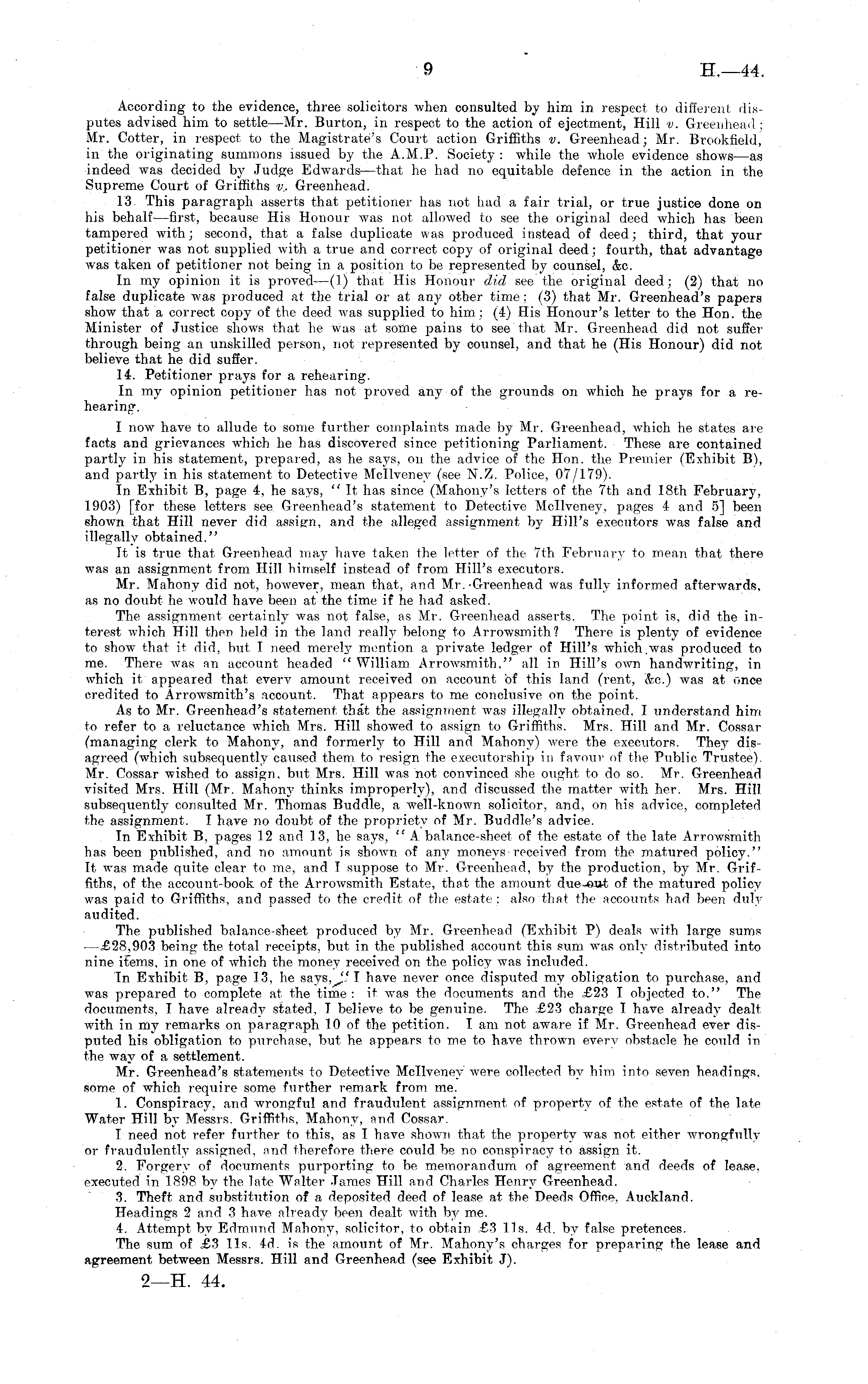 According to the evidence, three solicitors when consulted by him in respect to different disputes advised him to settle—Mr. Burton, in respect to the action of ejectment, Hill v. Greenhead ; Mr. Cotter, in respect to the Magistrate's Court action Griffiths v. Greenhead; Mr. Brookfield, in the originating summons issued by the A.M.P. Society : while the whole evidence shows —-as indeed was decided by Judge Edwards—that he had no equitable defence in the action in the Supreme Court of Griffiths v_. Greenhead. 13 This paragraph asserts that petitioner has not had a fair trial, or true justice done on his behalf —first, because His Honour was not allowed to see the original deed which has been tampered with; second, that a false duplicate was produced instead of deed; third, that your petitioner was not supplied with a true and correct copy of original deed; fourth, that advantage was taken of petitioner not being in a position to be represented by counsel, &c. In my opinion it is proved—(l) that His Honour did see the original deed; (2) that no false duplicate was produced at the trial or at any other time; (3) that Mr. Greenhead's papers show that a correct copy of the deed was supplied to him; (4) His Honour's letter to the Hon. the Minister of Justice shows that he was at some pains to see that Mr. Greenhead did not suffer through being an unskilled person, not represented by counsel, and that he (His Honour) did not believe that he did suffer. 14. Petitioner prays for a rehearing. In my opinion petitioner has not proved any of the grounds on which he prays for a rehearing. I now have to allude to some further complaints made by Mr. Greenhead, which he states are facts and grievances which he has discovered since petitioning Parliament. These are contained partly in his statement, prepared, as he says, on the advice of the Hon. the Premier (Exhibit B), and parti}' in his statement to Detective Mcllveney (see N.Z. Police, 07/179). In Exhibit B, page 4, he says, " It has since (Mahony's letters of the 7th and 18th February, 1903) [for these letters see Greenhead's statement to Detective Mcllveney, pages 4 and 5] been shown that Hill never did assign, and the alleged assignment by Hill's executors was false and illegally obtained." Tt is true that Greenhead may have taken the letter of the 7th February to mean that there was an assignment from Hill himself instead of from Hill's executors. Mr. Mahony did not, however, mean that, and Mr. •Greenhead was fully informed afterwards, as no doubt he would have been at the time if he had asked. The assignment certainly was not false, as Mr. Greenhead asserts. The point is, did the interest which Hill then held in the land really belong to Arrowsmith? There is plenty of evidence to show that it did, but I need merely mention a private ledger of Hill's which.was produced to me. There was an account headed " William Arrowsmith," all in Hill's own handwriting, in which it appeared that every amount received on account of this land (rent, &c.) was at once credited to Arrowsmith's account. That appears to me conclusive on the point. As to Mr. Greenhead's statement that the assignment was illegally obtained, I understand him to refer to a reluctance which Mrs. Hill showed to assign to Griffiths. Mrs. Hill and Mr. Cossar (managing clerk to Mahony, and formerly to Hill and Mahony) were the executors. They disagreed (which subsequently caused them to resign the executorship in favour of the Public Trustee). Mr. Cossar wished to assign, but Mrs. Hill was not convinced she ought to do so. Mr. Greenhead visited Mrs. Hill (Mr. Mahony thinks improperly), and discussed the matter with her. Mrs. Hill subsequently consulted Mr. Thomas Buddie, a well-known solicitor, and, on his advice, completed the assignment. I have no doubt of the propriety of Mr. Buddies advice. In Exhibit B, pages 12 and 13, he says, " A balance-sheet of the estate of the late Arrowsmith has been published, and no amount is shown of any moneys• received from the matured policy." It was made quite clear to me, and I suppose to Mr. Greenhead, by the production, by Mr. Griffiths, of the account-book of the Arrowsmith Estate, that the amount due out of the matured policy was paid to Griffiths, and passed to the credit of the estate : also that the accounts had been duly audited. The published balance-sheet produced by Mr. Greenhead (Exhibit P) deals with large sums —£28,903 being the total receipts, but in the published account this sum was only distributed into nine items, in one of which the money received on the policy was included. In Exhibit B, page 13, he I have never once disputed my obligation to purchase, and was prepared to complete at the time: it was the documents and the £23 I objected to." The documents, I have already stated, I believe to be genuine. The £23 charge I have already dealt with in my remarks on paragraph 10 of the petition. lam not aware if Mr. Greenhead ever disputed his obligation to purchase, but he appears to me to have thrown every obstacle he could in the way of a settlement. Mr. Greenhead's statements to Detective Mcllveney were collected by him into seven headings, some of which require some further remark from me. 1. Conspiracy, and wrongful and fraudulent assignment of property of the estate of the late Water Hill by Messrs. Griffiths. Mahony, and Cossar. T need not refer further to this, as I have shown that the property was not either wrongfully or fraudulently assigned, and therefore there could be no conspiracy to assign it. 2. Forgery of documents purporting to be memorandum of agreement and deeds of lease, executed in 1898 by the late Walter James Hill and Charles Henry Greenhead. 8. Theft and substitution of a deposited deed of lease at the Deeds Office, Auckland. Headings 2 and 3 have already been dealt with by me. 4. Attempt by Edmund Mahony, solicitor, to obtain £3 11s. 4d. by false pretences. The sum of £3 11s. 4d. is the amount