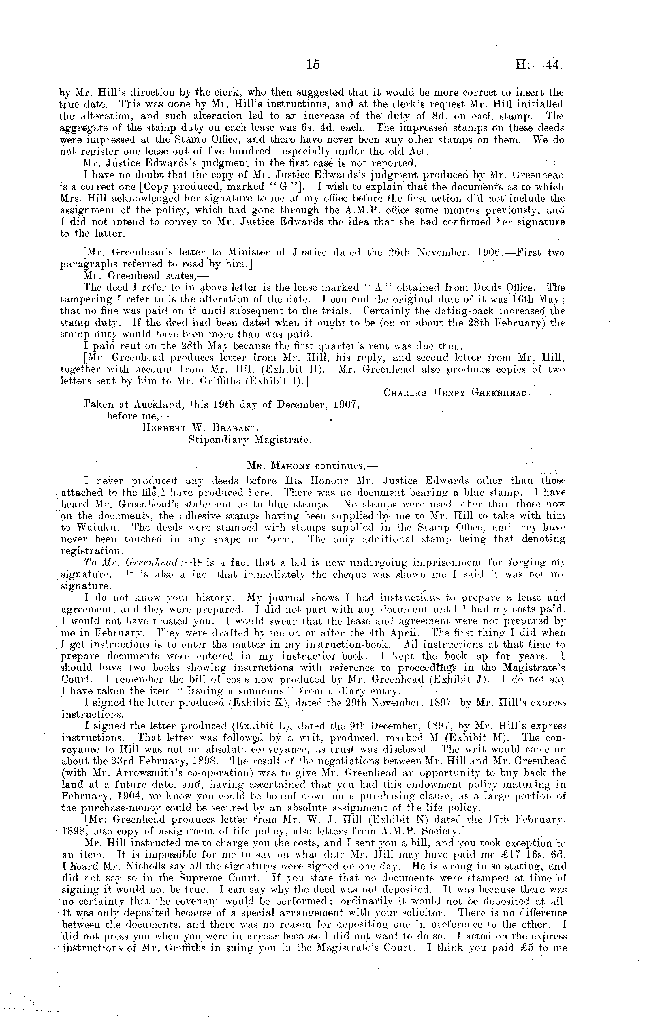 by Mr. Hill's direction by the clerk, who then suggested that it would be more correct to insert the true date. This was done by Mr. Hill's instructions, and at the clerk's request Mr. Hill initialled the alteration, and such alteration led to. an increase of the duty of Bd. on each stamp. The aggregate of the stamp duty on each lease was 6s. 4d. each. The impressed stamps on these deeds were impressed at the Stamp Office, and there have never been any other stamps on them. We do not register one lease out of five hundred —especially under the old Act. Mr. Justice Edwards's judgment in the first case is not reported. I have no doubt that the copy of Mr. Justice Edwards's judgment produced by Mr. Greenhead is a correct one [Copy produced, marked " G "]. I wish to explain that the documents as to which Mrs. Hill acknowledged her signature to me at my office before the first action did not include the assignment of the policy, which had gone through the A.M.P. office some months previously, and I did not intend to convey to Mr. Justice Edwards the idea that she had confirmed her signature to the latter. [Mr. Greenhead's letter to Minister of Justice dated the 26th November, 1906.—First two paragraphs referred to read by him.] Mr. Greenhead states, — The deed I refer to in above letter is the lease marked "A " obtained from Deeds Office, tile tampering I refer to is the alteration of the date. I contend the original date of it was 16th May ; that no fine was paid on it until subsequent to the trials. Certainly the dating-back increased the stamp duty. If the deed had been dated when it ought to be (on or about the 28th February) the stamp duty would have been more than was paid. I paid rent on the 28th May because the first quarter's rent was due then. [Mr. Greenhead produces letter from Mr. Hill, his reply, and second letter from Mr. Hill, together with account from Mr. I Till (Exhibit H). Mr. Greenhead also produces copies of two letters sent by him to Mr. Griffiths (Exhibit I).] Chari.ms Henry Gree'nhead. Taken at Auckland, this 19th daj* of December, 1907, before me, — Herbert W. Brabant, Stipendiary Magistrate. Mi!. Mahony continues, — I never produced any deeds before His Honour Mr. Justice Edwards other than those attached to the file I have produced here. There was no document bearing a blue stamp. I have heard Mr. Greenbead's statement as to blue stamps. No stamps were used other than those now on the documents, the adhesive stamps having been supplied by me to Mr. Hill to take with him to Waiuku. The deeds were stamped with stamps supplied in the Stamp Office, and they have never been touched in any shape or form. The only additional stamp being that denoting registration. To il//\ (1 ri'tnhcuil: It is a fact that a lad is now undergoing imprisonment for forging my signature. Ft is also a fact that immediately the cheque was shown me I said it was not my signature. I do not know your history. My journal shows I had instructions to prepare a lease and agreement, and they were prepared. I did not part with anj- document until 1 had my costs paid. I would not have trusted you. I would swear that the lease and agreement were not prepared by me in February. They were drafted by me on or after the 4th April. The first thing T did when I get instructions is to enter the matter in my instruction-book. All instructions at that time to prepare documents were entered in my instruction-book. I kept the book up for years. I should have two books showing instructions with reference to proceedings in the Magistrate's Court. [ remember the bill of costs now produced by Mr. Greenhead (Exhibit J). I do not say I have taken the item " Issuing a summons " from a diary entry. I signed the letter produced (Exhibit X), dated the 29th November, 1897, by Mr. Hill's express instructions. I signed the letter produced (Exhibit L), dated the 9th December, 1897, by Mr. Hill's express instructions. That letter was followejd by a writ, produced, marked M (Exhibit M). The conveyance to Hill was not an absolute conveyance, as trust was disclosed. The writ would come on about the 23rd February, 1898. The result of the negotiations between Mr. Hill and Mr. Greenhead (with Mr. Arrowsmith's co-operation) was to give Mr. Greenhead an opportunit}- to buy back the land at a future date, and, having ascertained that you had this endowment policy maturing in February, 1904, we knew you could be bound"down on a purchasing clause, as a large portion of the purchase-money could be secured by an absolute assignment of the life policy. [Mr. Greenhead produces letter from Mr. W. J. Hill (Exhibit N) dated the 17th February. 1898, also copy of assignment of life policy, also letters from A.M.P. Society.] Mr. Hill instructed me to charge you the costs, and I sent you a bill, and you took exception to an item. It is impossible for me to say on what date Mr. Hill may have paid me £17 16s. 6d. I heard Mr. Nicholls say all the signatures were signed on one day. He is wrong in so stating, and did not say so in the Supreme Court. If you state that no documents were stamped at time of signing it would not be true. I can say why the deed was not deposited. It was because there was no certainty that the covenant would be performed ; ordinarily it would not be deposited at all. It was only deposited because of a special arrangement with your solicitor. There is no difference between the documents, and there was no reason for depositing one in preference to the other. T did not press you when you were in arrear because I did not want to do so. T acted on the express instructions of Mr. Griffiths in suing you in the Magistrate's Court. I think you paid £5 to me