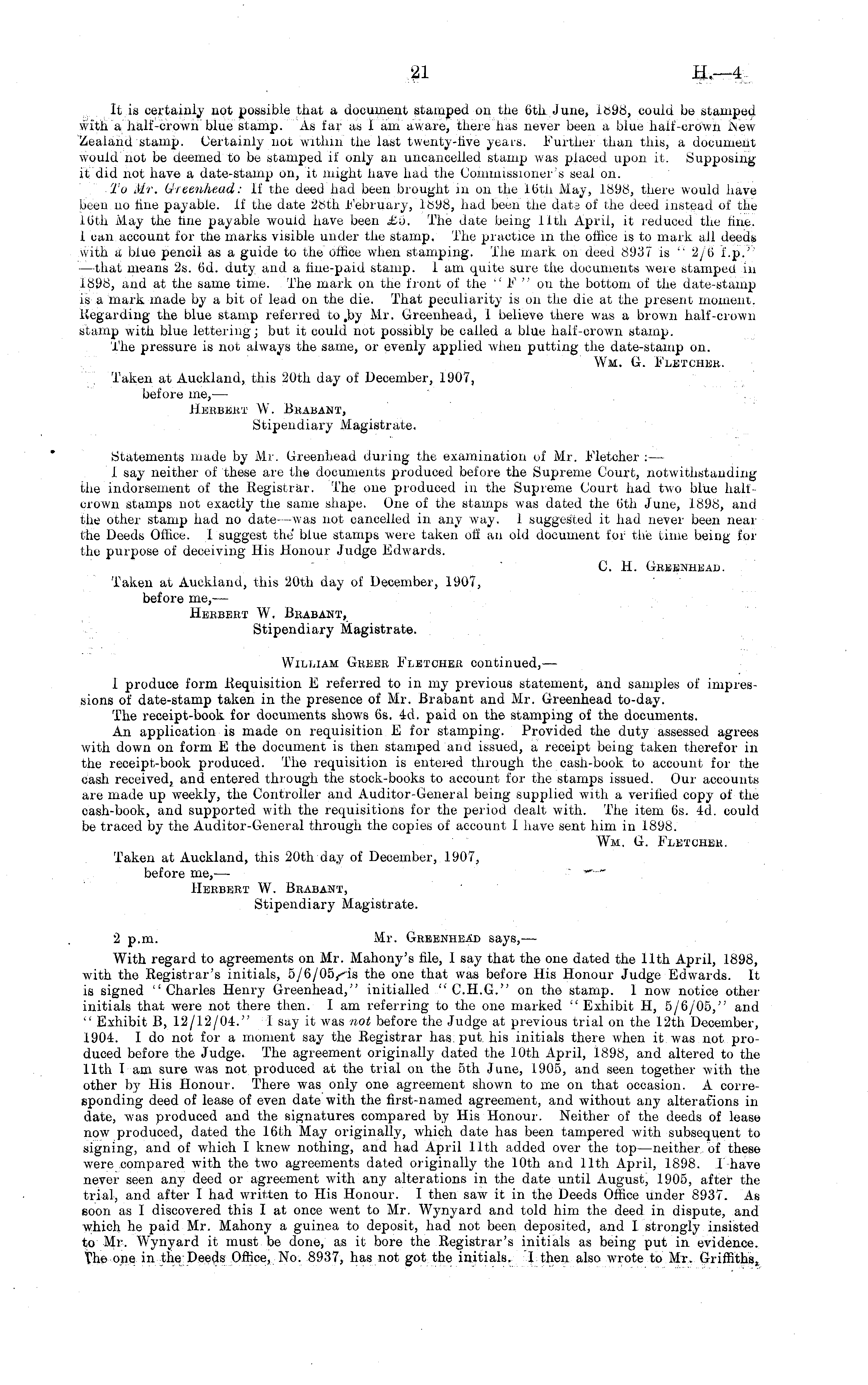 it is certainly not possible that a document stamped on the 6th June, 1698, could be stamped with a half-crown blue stamp. As far as lam aware, there has never been a blue hait'-crdwii i\ew Zealand stamp. Certainly not within the last twenty-five years. Further than this, a document would not be deemed to be stamped if only an uncancelled stamp was placed upon it. Supposing it did not have a date-stamp on, it might have had the Commissioner's seal on. To Mr. Grreenhead: if the deed had been brought in on the 16th May, 1698, there would have been no hue payable, if the date 28th February, 1898, had been the data of the deed instead of the 16th May the tine payable would have been £o. The date being 11th April, it reduced the tine. 1 can account for the marks visible under the stamp. The practice iii the office is to mark ail deeds with a blue pencil as a guide to the office when stamping. The mark on deed 8937 is " 2y6 it".p." —that means 2s. 6d. duty and a hue-paid stamp, iam quite sure the documents were stamped in 1898, and at the same time. The mark on the front of the " 1 ,, "on the bottom of the date-stamp is a mark made by a bit of lead on the die. That peculiarity is on the die at the present moment. Regarding the blue stamp referred to ,by Mr. Greenhead, i believe there was a brown half-crown stamp with blue lettering; but it could not possibly be called a blue half-crown stamp. The pressure is not always the same, or evenly applied when putting the date-stamp on. Wμ. G. Fletcher. Taken at Auckland, this 20th day of December, 1907, before me, — Herbert W. Brabant, Stipendiary Magistrate. Statements made by Mr. Greenhead during the examination of Mr. Fletcher : — 1 say neither of these are the documents produced before the Supreme Court, notwithstanding the indorsement of the -Registrar. The one produced in the Supreme Court had two blue halfcrown stamps not exactly the same shape. One of the stamps was dated the 6th June, 1898, and the other stamp had no date —was not cancelled in any way. 1 suggested it had never been near the Deeds Office, i suggest the' blue stamps were taken off an old document for the time being for the purpose of deceiving His Honour Judge Edwards. C. H. GrEENHEAD. Taken at Auckland, this 20th day of December, 1907, before me, — Herbert W. Brabant, Stipendiary Magistrate. William Greer Fletcher continued, — 1 produce form requisition E referred to in my previous statement, and samples of impressions of date-stamp taken in the presence of Mr. Brabant and Mr. Greenhead to-day. The receipt-book for documents shows 6s. 4d. paid on the stamping of the documents. An application is made on requisition E for stamping. Provided the duty assessed agrees with down on form E the document is then stamped and issued, a receipt being taken therefor in the receipt-book produced. The requisition is eiiter-ed through the cash-book to account for the cash received, and entered through the stock-books to account for the stamps issued. Our accounts are made up weekly, the Controller and Auditor-General being supplied with a verified copy of the cash-book, and supported with the requisitions for the period dealt with. The item 6s. 4d. could be traced by the Auditor-General through the copies of account 1 have sent him in 1898. Wμ. Gγ. Fletcher. Taken at Auckland, this 20th day of December, 1907, before me, — Herbert W. Brabant, Stipendiary Magistrate. 2 p.m. Mr. Greenhead says,— With regard to agreements on Mr. Mahony's file, I say that the one dated the 11th April, 1898, with the Registrar's initials, the one that was before His Honour Judge Edwards. It is signed "Charles Henry Greenhead," initialled " C.H.G." on the stamp. 1 now notice other initials that were not there then. lam referring to the one marked " Exhibit H, 5/6/05," and " Exhibit B, 12/12/04." 1 say it was not before the Judge at previous trial on the 12th December, 1904. I do not for a moment say the Registrar has. put. his initials there when it was not produced before the Judge. The agreement originally dated the 10th April, iB9B, and altered to the 11th I am sure was not produced at the trial on the sth June, 1905, and seen together with the other by His Honour. There was only one agreement shown to me on that occasion. A corresponding deed of lease of even date with the first-named agreement, and without any alterations in date, was produced and the signatures compared by His Honour. Neither of the deeds of lease now produced, dated the 16th May originally, which date has been tampered with subsequent to signing, and of which I knew nothing, and had April 11th added over the top —neither of these were compared with the two agreements dated originally the 10th and 11th April, 1898. I-have never seen any deed or agreement with any alterations in the date until August, 1905, after the trial, and after I had written to His Honour. I then saw it in the Deeds Office under 8937. As eoori as I discovered this I at once went to Mr. Wynyard and told him the deed in dispute, and which he paid Mr. Mahony a guinea to deposit, had not been deposited, and I strongly insisted to Mr. Wynyard it must be done, as it bore the Registrar's initials as being put in evidence, the one in the Deeds Office, No. 8937, has not got the initials. I then also wrote to Mr. Griffiths,,