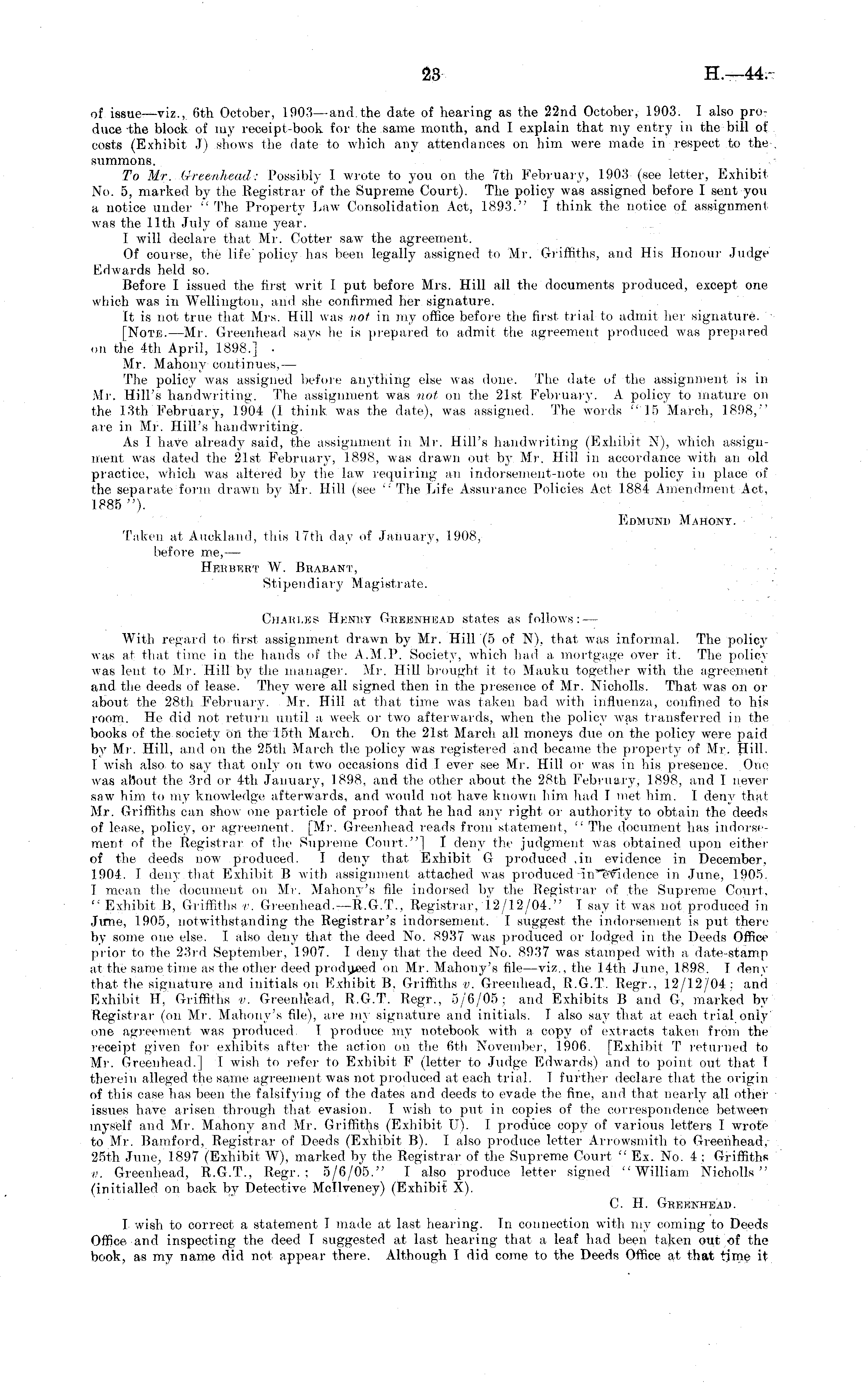 of issue—viz., 6th October, 1903 —and. the date of hearing as the 22nd October, 1903. I also produce the block of my receipt-book for the same month, and I explain that my entry in the bill of costs (Exhibit J) shows the date to which any attendances on him were made in respect to the summons. To Mr. Greenhead: I'ossibly I. wrote to you on the 7th February, 1903 (see letter, Exhibit No. 5, marked by the Registrar of the Supreme Court). The policy was assigned before I sent you a notice under "The Property Law Consolidation Act, 1893." 1 think the notice of assignment was the 11th July of same year. 1 will declare that Mr. Cotter saw the agreement. Of course, the life policy has been legally assigned to Mr. Griffiths, and His Honour Judge Edwards held so. Before I issued the first writ 1 put before Mrs. Hill all the documents produced, except one which was in Wellington, and she confirmed her signature. It is not true that Mrs. Hill was not in my office before the first trial to admit her signature. [Note. —Mr. Greenhead says he is prepared to admit the agreement produced was prepared on the 4th April, 1898.] . Mr. Mahony continues, — The policy was assigned before anything else was done. The date of the assignment is in Mr. Hill's handwriting. The assignment was not on the 21st February. A policy to mature on the 13th February, 1904 (1 think was the date), was assigned. The words "15 March, 1898," are in Mr*. Hill's handwriting. As 1 have already said, the assignment in Mr. Hill's handwriting (Exhibit N); which assignment was dated the 21st February, 1898, was drawn out by Mr. Hill in accordance with an old practice, which was altered by the law requiring an indorsement-note on the policy in place of the separate form drawn by Mr. Hill (see ''The Life Assurance Policies Act 1884 Amendment Act, 1885 "). Edmund Mahony. Taken at Auckland, this 17th day of January, 1908, before me, — Herbert W. Brabant, Stipendiary Magistrate. Charles Henry Grbenhead states as follows: — With regard to first assignment drawn by Mr. Hill (5 of N), that was informal. The policy was nt that lime in the hands of the A.M.P. Society, which had a mortgage over it. The policy was lout to Mr. Hill by the manager. Mr. Hill brought it to Mauku together with the agreement and the deeds of lease. They were all signed then in the presence of Mr. Nicholls. That was on or about the 28th February. Mr. Hill at that time was taken bad with influenza, confined to his room. He did not return until a week oi two afterwards, when the policy was transferred in the books of the society on the 15th March. On the 21st March all moneys due on the policy were paid by Mi\ Hill, and on the 25th March the policy was registered and became the property of Mr. Hill. 1 wish also to say that only on two occasions did I ever see Mr. Hill or was in his presence. One was aßout the 3rd or 4th January, 1898, and the other about the 28th February, 1898, and 1 never saw him to my knowledge afterwards, and would not have known him had 1 met him. 1 deny that Mr. Griffiths can show one particle of proof that he had any right or authority to obtain the deeds of lease, policy, or agreement. [Mi-. Greenhead reads from statement, " The document has indorsement of the Registrar of the Supreme Court." I deny the judgment was obtained upon either of the deeds now produced. I deny that Exhibit G produced .in evidence in December, 1904. I deny that Exhibit B with assignment attached was produced in evidence in June, 1905. 1 mean the document on Mr. Mahonv's file indorsed by the Registrar of the Supreme Court, " Exhibit H, Griffiths v. Greenhead.—R.G.T., Registrar, 12/12/04." I say it was not produced in Jurie, 1905, notwithstanding the Registrar's indorsement. I suggest the indorsement is put there by some one else. 1 also deny that the deed No. 8937 was produced or lodged in the Deeds Office prior to the 23rd September, 1907. 1 deny that the deed No. 8937 was stamped with a date-stamp at the same time as the other deed produced on Mr. Mahony's file —viz., the 14th June, 1898. 1 deny that the signature, and initials on Exhibit B, Griffiths v. Greenhead, R.G.T. Regr., 12/12/04: and Exhibit H, Griffiths v. Greenhead, R.G.T. Regr., 5/6/05; and Exhibits B and G, marked by Registrar (on Mr. Mahony's file), are my signature and initials. 1 also say that at each trial only one agreement was produced. 1 produce my notebook with a copy of extracts taken from the receipt given for exhibits after the action on the 6th November, 1906. [Exhibit T returned to Mr. Greenhead.] I wish to refer to Exhibit F (letter to Judge Edwards) and to point out that 1 therein alleged the same agreement was not produced at each trial. I further declare that the origin of this case lias been the falsifying of the dates and deeds to evade the fine, and that nearly all other issues have arisen through that evasion. I wish to put in copies of the correspondence between myself and Mr. Mahony and Mr. Griffiths (Exhibit U). 1 produce copy of various letters 1 wrote to Mr. Bamford, Registrar of Deeds (Exhibit B). I also produce letter Arrowsmith to Greenhead, 25th June, 1897 (Exhibit W), marked by the Registrar of the Supreme Court " Ex. No. 4 ; Griffiths v. Greenhead, R.G.T., Regr.; 5/6/05." 1 also produce letter signed ■'William Nicholls" (initialled on back by Detective McTlveney) (Exhibit X). C. H. Gheenheau. I wish to correct a statement 1 made at last hearing. In connection with my coming to Deeds Office and inspecting the deed T suggested at last hearing that a leaf had been taken out of the book, as my name did not appear there. Although I did come to the Deeds Office at that time it