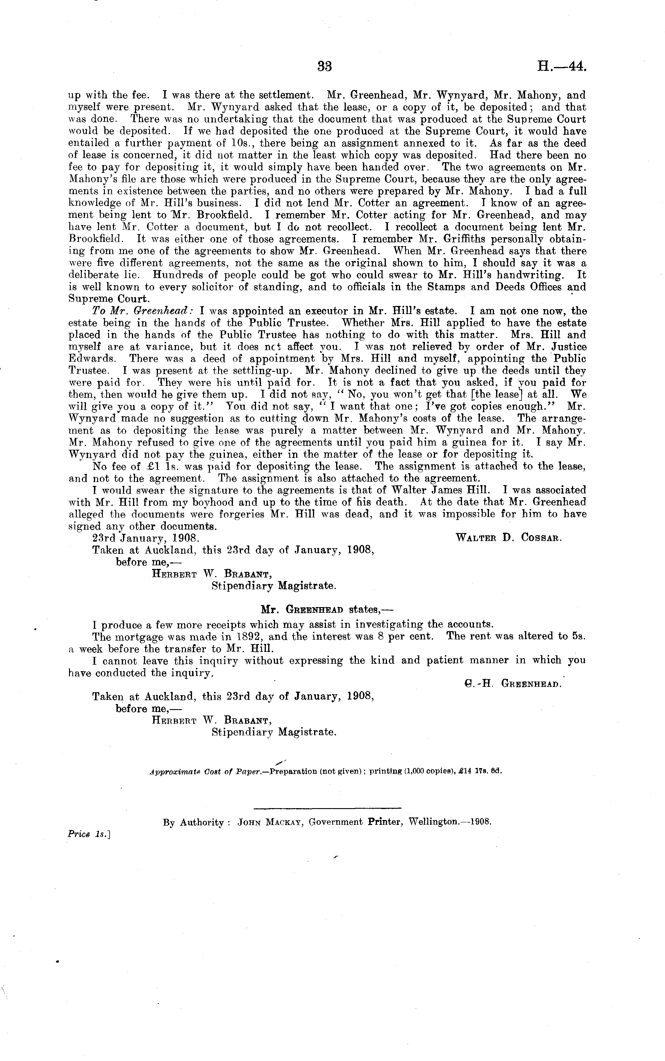 up with the fee. I was there at the settlement. Mr. Greenhead, Mr. Wynyard, Mr. Mahony, and myself were present. Mr. Wynyard asked that the lease, or a copy of it, be deposited; and that was done. There was no undertaking that the document that was produced at the Supreme Court would be deposited. If we had deposited the one produced at the Supreme Court, it would have entailed a further payment of 10s., there being an assignment annexed to it. As far as the deed of lease is concerned, it did not matter in the least which copy was deposited. Had there been no fee to pay for depositing it, it would simply have been handed over. The two agreements on Mr. Mahony's file are those which were produced in the Supreme Court, because they are the only agreements in existence between the parties, and no others were prepared by Mr. Mahony. I had a full knowledge of Mr. Hill's business. I did not lend Mr. Cotter an agreement. I know of an agreement being lent to Mr. Brookfield. I remember Mr. Cotter acting for Mr. Greenhead, and may have lent Mr. Cotter a document, but I do not recollect. I recollect a document being lent Mr. Brookfield. It was either one of those agreements. I remember Mr. Griffiths personally obtaining from me one of the agreements to show Mr. Greenhead. When Mr. Greenhead says that there were five different agreements, not the same as the original shown to him, I should say it was a deliberate lie. Hundreds of people could be got who could swear to Mr. Hill's handwriting. It is well known to every solicitor of standing, and to officials in the Stamps and Deeds Offices and Supreme Court. To Mr. Greenhead: I was appointed an executor in Mr. Hill's estate. lam not one now, the estate being in the hands' of the Public Trustee. Whether Mrs. Hill applied to have the estate placed in the hands of the Public Trustee has nothing to do with this matter. Mrs. Hill and myself are at variance, but it does net affect you. I was not relieved by order of Mr. Justice Edwards. There was a deed of appointment by Mrs. Hill and myself, appointing the Public Trustee. I was present at the settling-up. Mr. Mahony declined to give up the deeds until they were paid for. They were his until paid for. It is not a fact that you asked, if you paid for them, then would he give them up. I did not say, " No, you won't get that [the lease] at all. We will give you a copy of it." You did not say, " I want that one; I've got copies enough." Mr. Wynyard made no suggestion as to cutting down Mr. Mahony's costs of the lease. The arrangement as to depositing the lease was purely a matter between Mr. Wynyard and Mr. Mahony. Mr. Mahony refused to give one of the agreements until you paid him a guinea for it. I say Mr. Wynyard did not pay the guinea, either in the matter of the lease or for depositing it. No fee of £1 Is. was paid for depositing the lease. The assignment is attached to the lease, and not to the agreement. The assignment is also attached to the agreement. I would swear the signature to the agreements is that of Walter James Hill. I was associated with Mr. Hill from my boyhood and up to the time of his death. At the date that Mr. Greenhead alleged the documents were forgeries Mr. Hill was dead, and it was impossible for him to have signed any other documents. 23rd January, 1908. Walter D. Cossar. Taken at Auckland, this 23rd day of January, 1908, before me,- — Herbert W. Brabant, Stipendiary Magistrate. Mr. Greenhead states, —- I produce a few more receipts which may assist in investigating the accounts. The mortgage was made in 1892, and the interest was 8 per cent. The rent was altered to ss. a week before the transfer to Mr. Hill. I cannot leave this inquiry without expressing the kind and patient manner in which you have conducted the inquiry. C. H. Greenhead. Taken at Auckland, this 23rd day of January, 1908, before me, — Herbert W. Brabant, Stipendiary Magistrate. Approximate Cost of Paper.— Preparation (not given); printing (1,000 copies), il4 17e. 6d.
