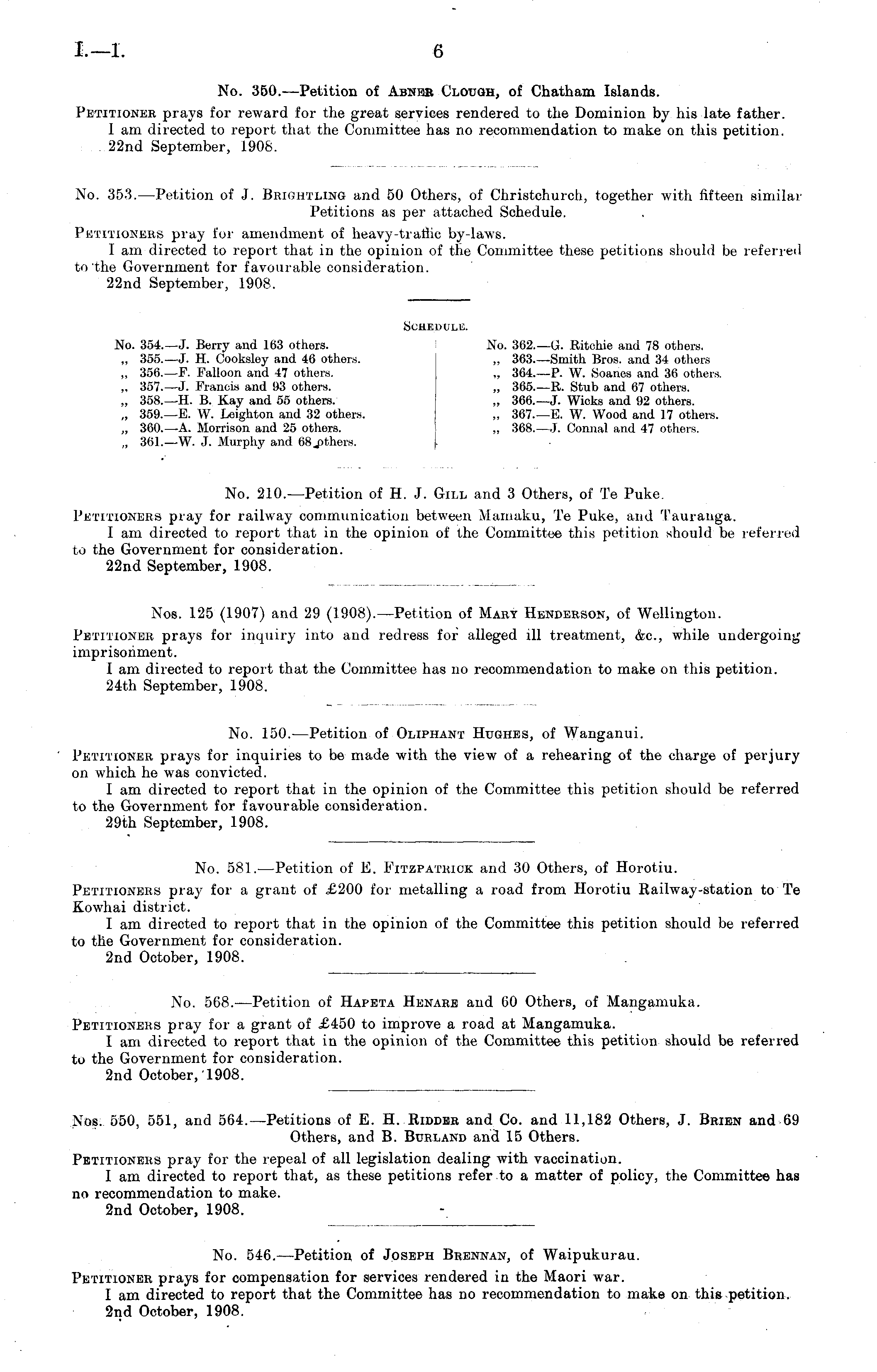 No. 350.—Petition of Abnur Clough, of Chatham Islands. Petitioner prays for reward for the great services rendered to the Dominion by his late father. I am directed to report that the Committee has no recommendation to make on this petition. 22nd September, 1908. No. 353.—Petition of J. Brightling and 50 Others, of Christchurch, together with fifteen similar Petitions as per attached Schedule. Petitioners pray for amendment of heavy-traffic by-laws. I am directed to report that in the opinion of the Committee these petitions should be referred to the Government for favourable consideration. 22nd September, 1908.