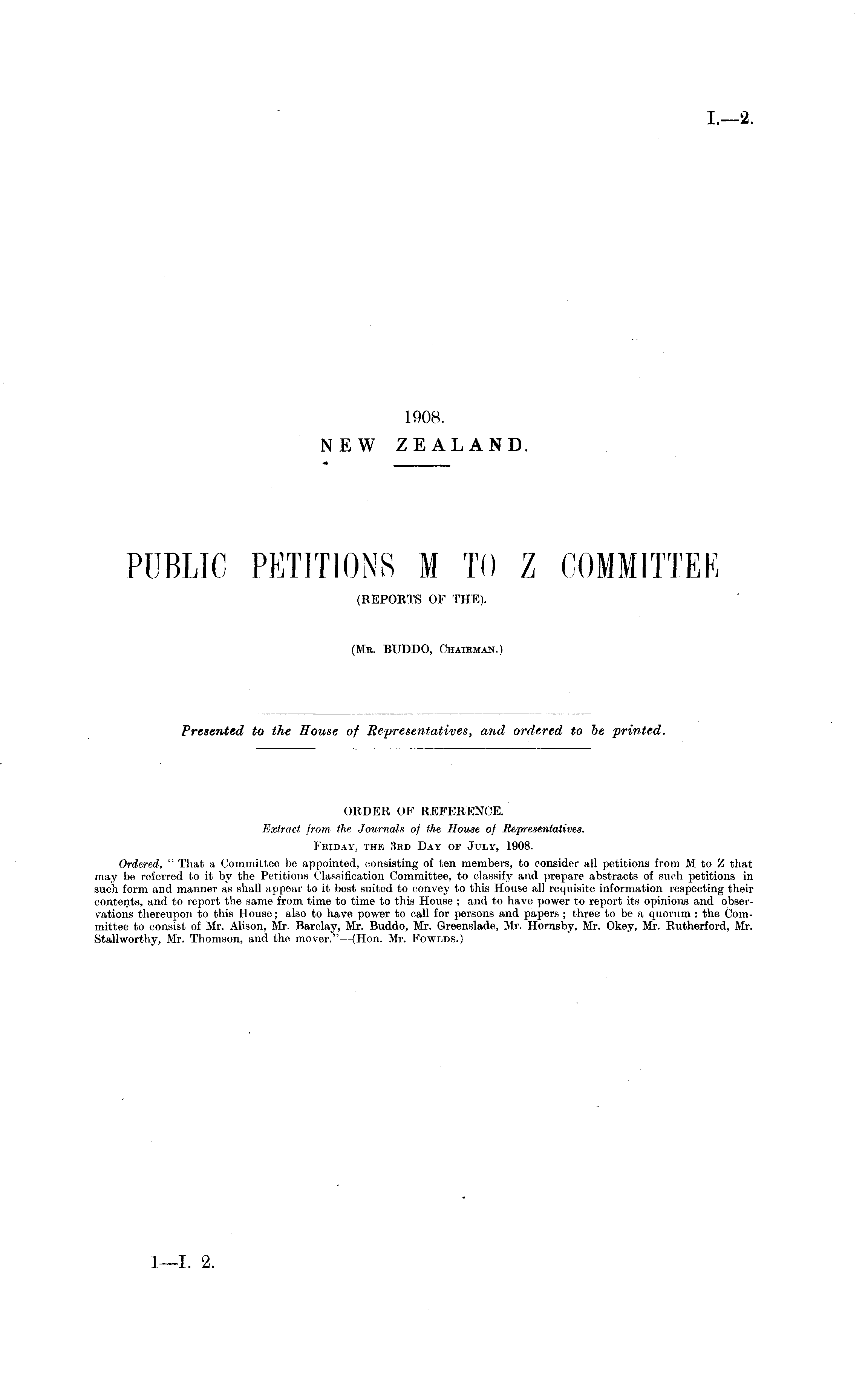 ORDER OF REFERENCE. Extract from the Journals of the House of Representatives. Friday, the 3rd Day or July, 1908. Ordered, " That a Committee be appointed, consisting of ten members, to consider all petitions from M to Z that may be referred to it by the Petitions Classification Committee, to classify and prepare abstracts of such petitions in such form and manner as shall appeal' to it best suited to convey to this House all requisite information respecting their contents, and to report the same from time to time to this House ; and to have power to report its opinions and observations thereupon to this House; also to have power to call for persons and papers ; three to be a quorum : the Committee to consist of Mr. Alison, Mr. Barclay, Mr. Buddo, Mr. Greenslade, Mr. Hornsby, Mr. Okey, Mr. Rutherford, Mr. iStallworthy, Mr. Thomson, and the mover."—(Hon. Mr. Fowlds.)