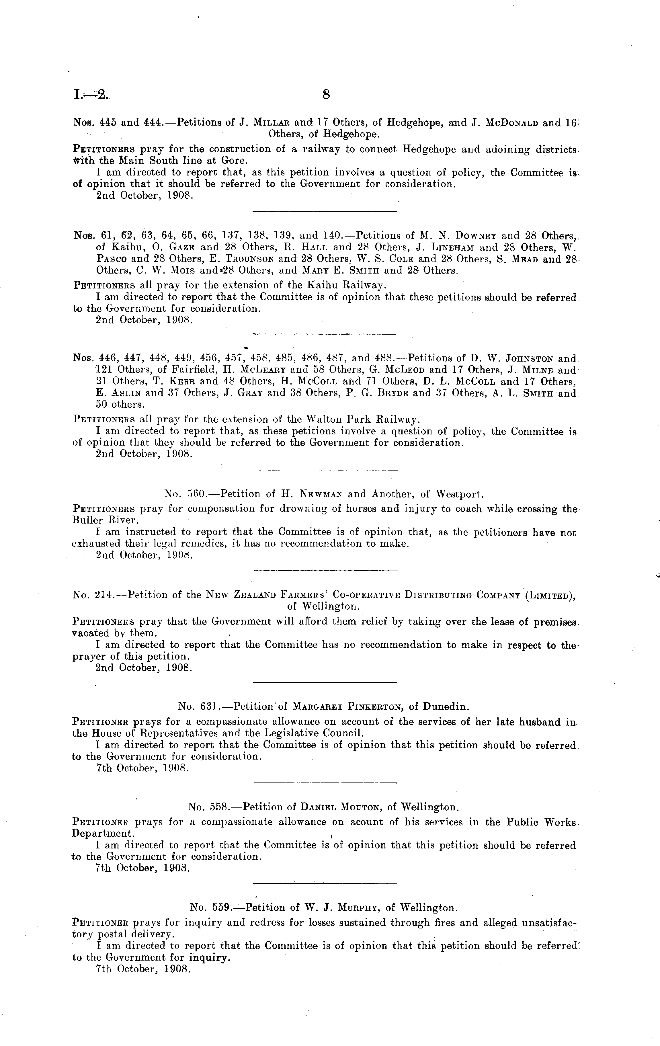Nos. 445 and 444. —Petitions of J. Millar and 17 Others, of Hedgehope, and J. McDonald and 16 Others, of Hedgehope. Petitioners pray for the construction of a railway to connect Hedgehope and adoining districts, with the Main South line at Gore. I am directed to report that, as this petition involves a question of policy, the Committee is of opinion that it should be referred to the Government for consideration. 2nd October, 1908.