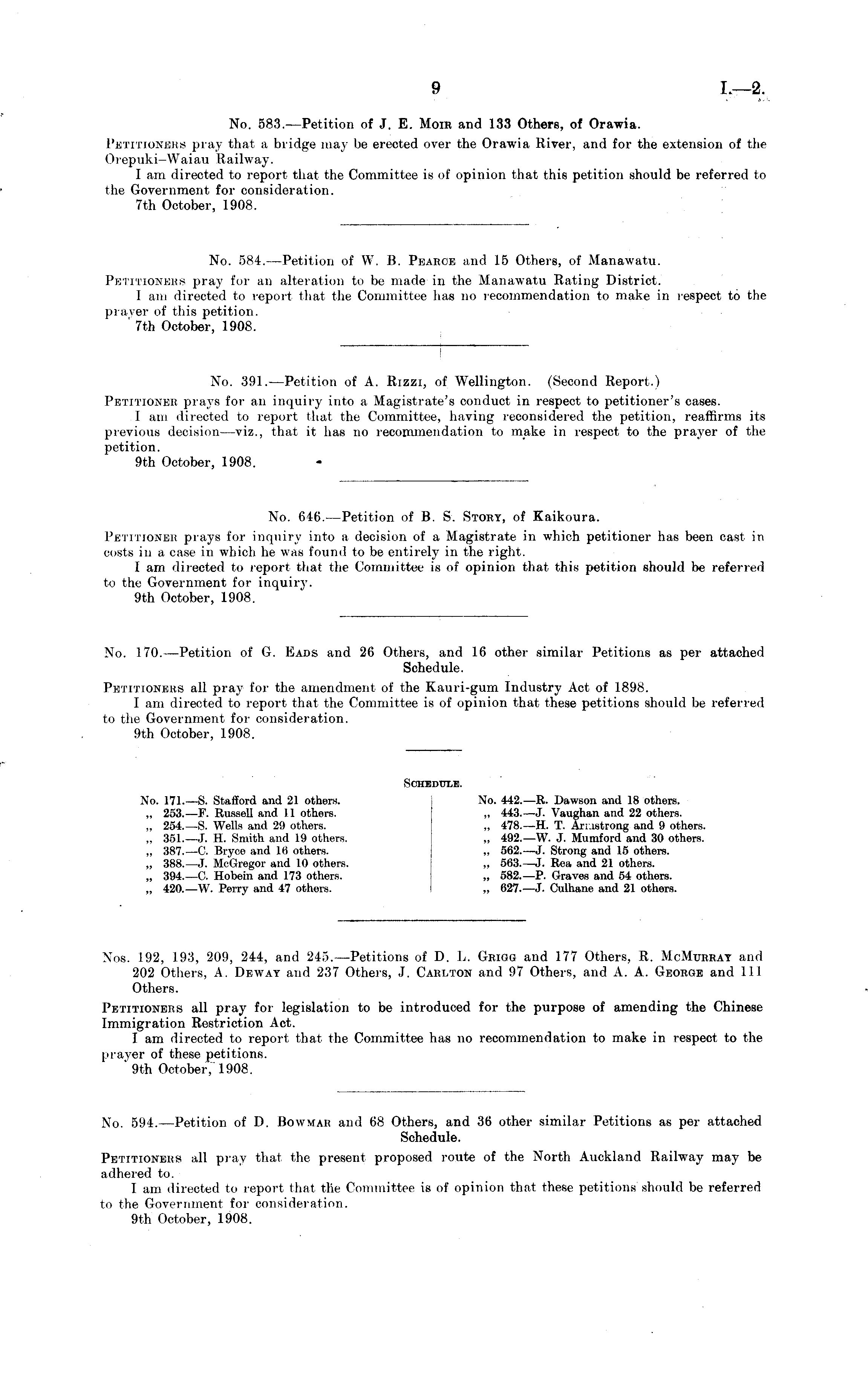Xos. 192, 193, 209, 244, and 245.—Petitions of D. L. Grigg and 177 Others, R. McMurray and 202 Others, A. Deway and 237 Others, J. Carlton and 97 Others, and A. A. George and 111 Others. Petitioners all pray for legislation to be introduced for the purpose of amending the Chinese Immigration Restriction Act. I am directed to report that the Committee has no recommendation to make in respect to the prayer of these petitions. '9th October, 1908. No. 594. —Petition of D. Bowmar and 68 Others, and 36 other similar Petitions as per attached Schedule. Petitioners all pray that the present proposed route of the North Auckland Railway may be adhered to. I am directed to report that the Committee is of opinion that these petitions should be referred to the Government for consideration. 9th October, 1908.