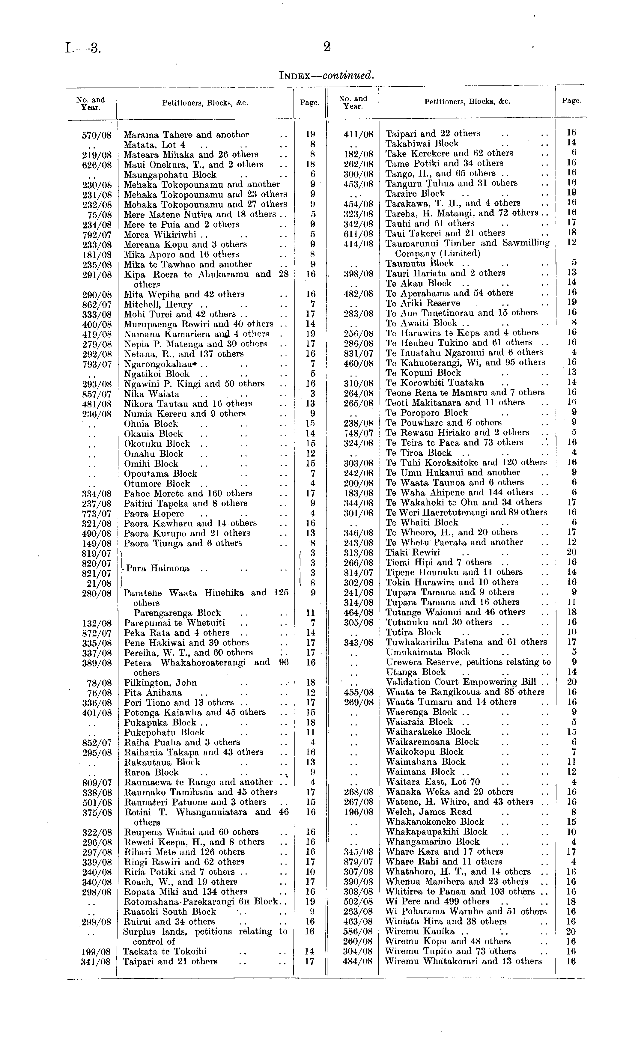 No. and Year. Petitioners, Blocks, <fcc. Page. 411/08 182/08 262/08 300/08 453/08 454/08 323/08 342/08 611/08 414/08 398/08 482/08 283/08 256/08 286/08 831/07 460/08 310/08 264/08 265/08 238/08 748/07 324/08 303/08 242/08 200/(18 183/08 344/08 301/08 346/08 243/08 313/08 266/08 814/07 302/08 241/08 314/08 464/08 305/08 Taipari and 22 others Takahiwai Block Take Korekere and 62 others Tame Potiki and 34 others Tango, H., and 65 others .. Tanguru Tuhua and 31 others Tarairo Block Tarakawa, T. H., and 4 others Tareha, H. Matangi, and 72 others .. Tauhi and (il others Taui Takerei and 21 others Taumarunui Timber and Sawmilling Company (Limited) Taumutu Block Tauri Hariata and 2 others Te Akau Block Tβ Aperahama and 54 others Te Ariki Reserve Te Aue Timetinorau and 15 others Te Awaiti Block Te Harawira ta Kepa and 4 others Te Heuheu Tukino and 61 others .. Te Inuatahu Ngaronui and 6 others Te Kahuoterangi, Wi, and 95 others To Kopuni Block Te Korowhiti Tuataka Teone Rena te Mamaru and 7 others Teoti Makitanara and 11 others Te Poroporo Block Te Pouwhare and 6 others Te Rewatu Hiriako and 2 others Te Teira te Paea and 73 others Te Tiroa Block Te Tuhi Korokaitoke and 120 others Te Umu Hukanui and another Te Waata Taunoa and 6 others Te Waha Ahipene and 144 others .. Te Wakahoki te Ohu and 34 others Te Weri Haeretuterangi and 89 others Te Whaiti Block Te Wheoro, H., and 20 others Te Whetu Paerata and another Tiaki Rewiri Tiemi Hipi and 7 others Tipene Hounuku and 11 others Tokia Harawira and 10 others Tupara Tamana and 9 others Tupara Tamana and 16 others Tutange Waionui and 46 others Tutanuku and 30 others Tutira Block Tuwhakaririka Patena and 61 others Umukaimata Block Urewera Reserve, petitions relating to Utanga Block Validation Court Empowering Bill .. Waata te Rangikotua and 85 others Waata Tumaru and 14 others Waerenga Block .. Waiaraia Block Waiharakeke Block Waikaremoana Block Waikokopu Block Waimahana Block Waimana Block Waitara East, Lot 70 Wanaka Weka and 29 others Watene, H. Whiro, and 43 others .. Welch, James Read Whakanekeneke Block Whakapaupakihi Block Whangamarino Block Whare Kara and 17 others Whare Rahi and 11 others Whatahoro, H. T., and 14 others .. Whenua Manihera and 23 others Whitirea te Panau and 103 others .. Wi Pere and 499 others Wi Poharama Waruhe and 51 others Winiata Hira and 38 others Wiremu Kauika Wiremu Kopu and 48 others Wiremu Tupito and 73 others Wiremu Whatakorari and 13 others 16 14 6 16 16 16 19 Hi 16 17 18 12 5 13 14 16 19 16 8 16 16 4 16 13 14 16 16 9 i 4 16 9 6 li 17 16 6 17 12 20 16 14 Iβ 9 11 18 16 {? 5 9 14 20 16 16 9 5 15 6 7 11 12 4 16 16 8 15 10 4 17 4 16 16 16 18 16 16 20 Iβ iii 16 343/08 455/08 269/08 268/08 267/08 196/08 345/08 879/07 307/08 390/08 308/08 502/08 263/08 463/08 586/08 260/08 304/08 484/08
