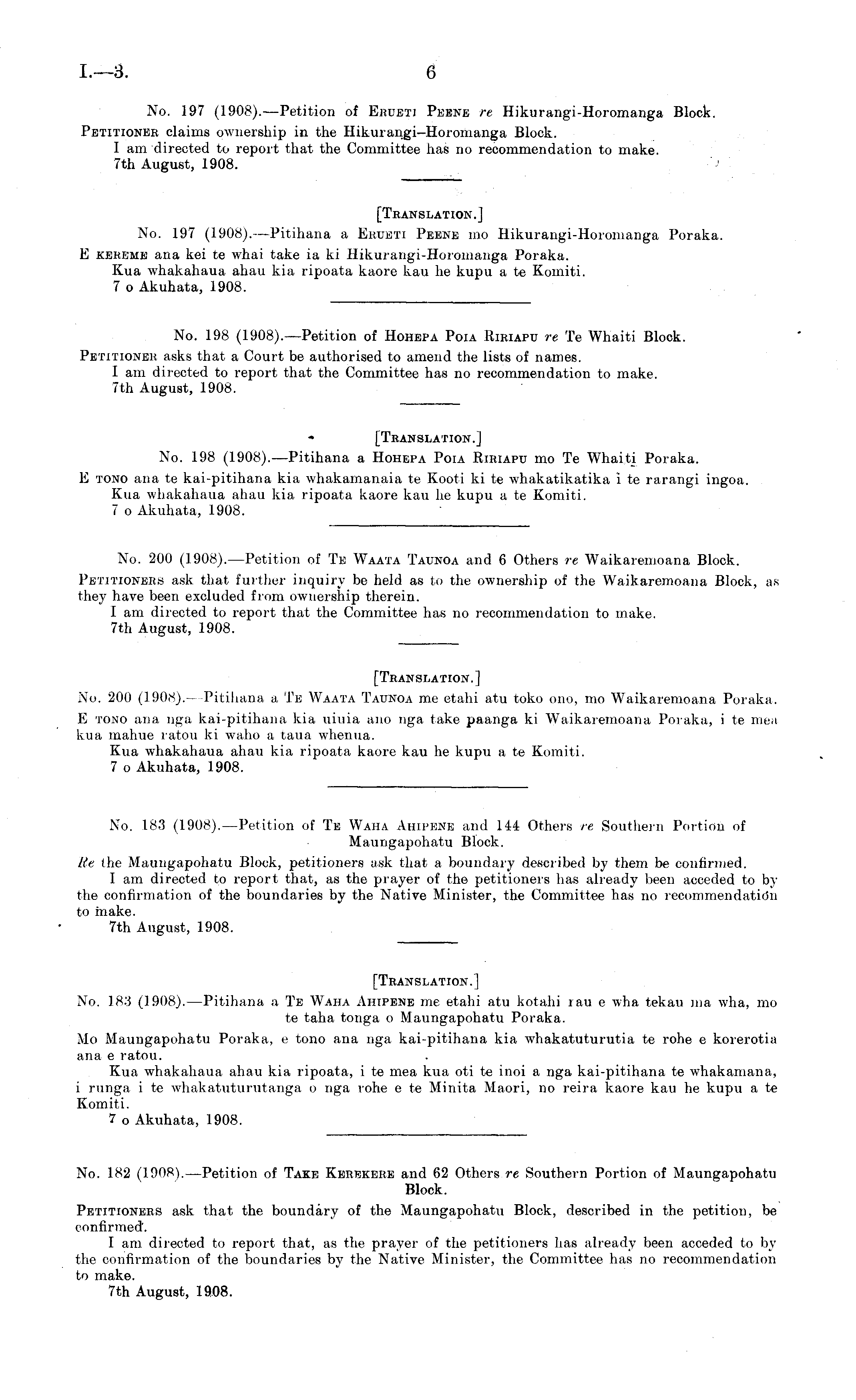 No. 198 (1908).—Petition of Hohepa Poia Rikiapu re Te Whaiti Block. Petitioner asks that a Court be authorised to amend the lists of names. 1 am directed to report that the Committee has no recommendation to make. 7th August, 1908.
