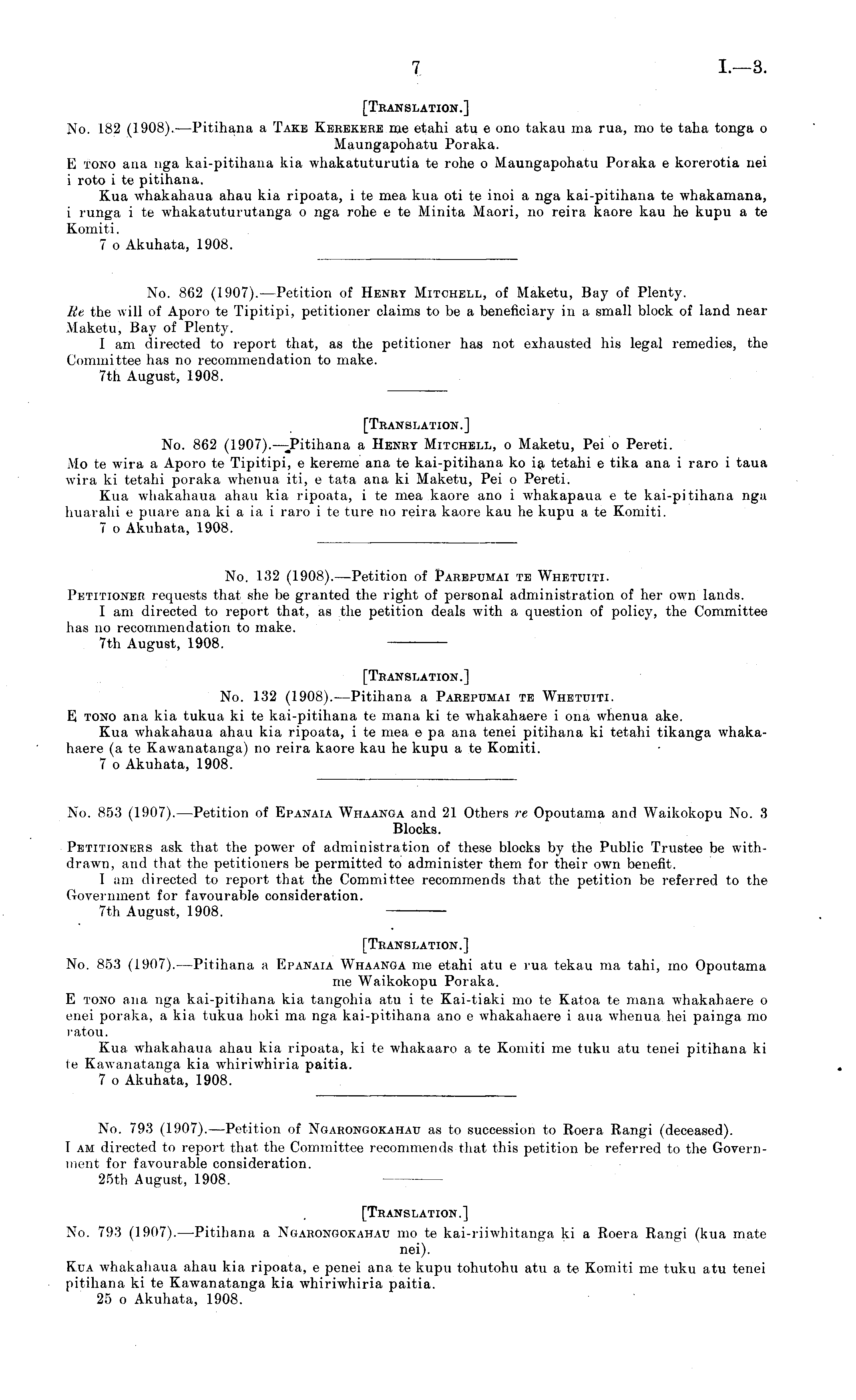 No. 862 (1907).—Petition of Henry Mitchell, of Maketu, Bay of Plenty. Re the will of Aporo te Tipitipi, petitioner claims to be a beneficiary in a small block of land near Maketu, Bay of Plenty. I am directed to report that, as the petitioner has not exhausted his legal remedies, the Committee has no recommendation to make. 7th August, 1908. [Translation.] No. 862 (1907).—Pitihana a Henry Mitchell, o Maketu, Pei o Pereti. Mo te wira a Aporo te Tipitipi, c kereme ana te kai-pitihana ko ia, tetahi c tika ana i raro i taua wira ki tetahi poraka whenua iti, c tata ana ki Maketu, Pei o Pereti. Kua whakahaua ahau kia ripoata, i te mea kaore ano i whakapaua c te kai-pitihana nga huarahi c puare ana ki a ia i raro i te ture no reira kaore kau he kupu a te Komiti. 7 o Akuhata, 1908. No. 132 (1908).—Petition of Parepumai te Whetuiti. Petitioner requests that she be granted the right of personal administration of her own lands. I am directed to report that, as the petition deals with a question of policy, the Committee has no recommendation to make. 7th August, 1908. [Translation.] No. 132 (1908).—Pitihana a Parepumai te Whetuiti. E tono ana kia tukua kite kai-pitihana te mana kite whakahaere i ona whenua ake. Kua whakahaua ahau kia ripoata, i te mea c pa ana tenei pitihana ki tetahi tikanga whakahaere (a te Kawanatanga) no reira kaore kau he kupu a te Komiti. 7 o Akuhata, 1908. No. 853 (1907).—Petition of Epanaia Whaanga and 21 Others re Opoutama and Waikokopu No. 3 Blocks. Petitioners ask that the power of administration of these blocks by the Public Trustee be withdrawn, and that the petitioners be permitted to administer them for their own benefit. 1 am directed to report that the Committee recommends that the petition be referred to the Government for favourable consideration. 7th August, 1908. [Translation.] No. 853 (1907).—Pitihana a Epanaia Whaanga me etahi atu c rua tekau ma tahi, mo Opoutama me Waikokopu Poraka. E tono ana nga kai-pitihana kia tangohia atu i te Kai-tiaki mo te Katoa te mana whakahaere o enei poraka, a kia tukua hoki ma nga kai-pitihana ano c whakahaere i ana whenua hei painga mo ratou. Kua whakahaua ahau kia ripoata, kite whakaaro a te Komiti me tuku atu tenei pitihana ki te Kawanatanga kia whiriwhiria paitia. 7 o Akuhata, 1908. No. 793 (1907).—Petition of Ngarongokahau as to succession to Roera Rangi (deceased). I am directed to report that the Committee recommends that this petition be referred to the Government for favourable consideration. 25th August, 1908. [Translation.] No. 793 (1907).—Pitihana a Ngarongokahau mo te kai-riiwhitanga ki a Roera Rangi (kua mate nei). Kua whakahaua ahau kia ripoata, c penei ana te kupu tohtitohu atu a te Komiti me tuku atu tenei pitihana kite Kawanatanga kia whiriwhiria paitia. 25 o Akuhata, 1908.