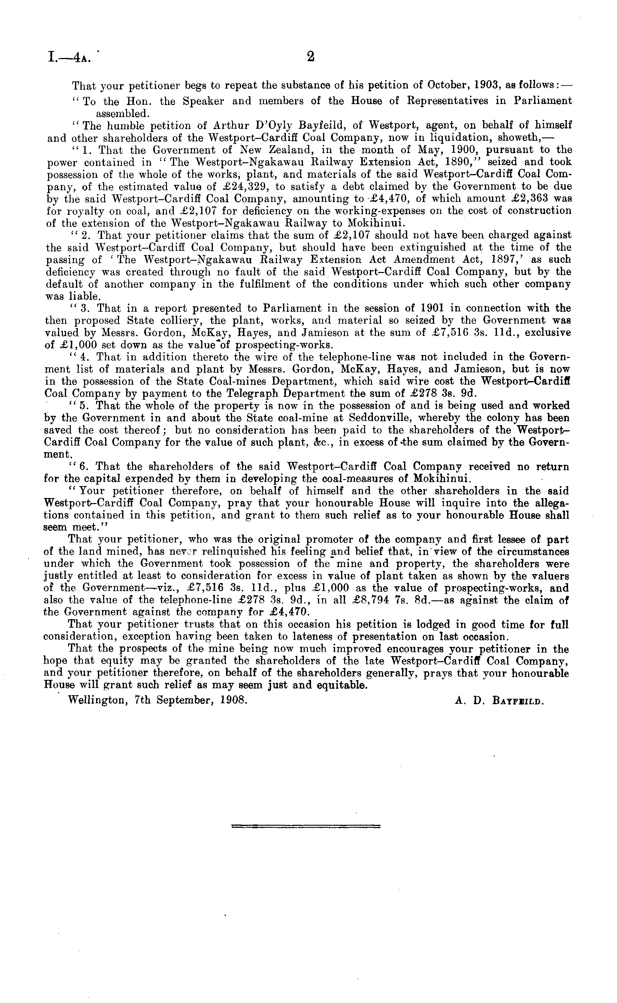 That your petitioner begs to repeat the substance of his petition of October, 1903, as follows: — " To the Hon. the Speaker and members of the House of Representatives in Parliament assembled. " The humble petition of Arthur DOyly Bayfeild, of Westport, agent, on behalf of himself and other shareholders of the Westport-Cardifi Coal Company, now in liquidation, showeth, — "1. That the Government of New Zealand, in the month of May, 1900, pursuant to the power contained in " The Westport-Ngakawau Railway Extension Act, 1890," seized and took possession of the whole of the works, plant, and materials of the said Westport-Cardifi Coal Company, of the estimated value of £24,329, to satisfy a debt claimed by the Government to be due by the said Westport-Cardiff Coal Company, amounting to £4,470, of which amount £2,363 was for royalty on coal, and £2,107 for deficiency on the working-expenses on the cost of construction of the extension of the Westport—Ngakawau Railway to Mokihinui. " 2. That your petitioner claims that the sum of £2,107 should not have been charged against the said Westport—Cardiff Coal Company, but should have been extinguished at the time of the passing of ' The Westport-Ngakawau Railway Extension Act Amendment Act, 1897,' as such deficiency was created through no fault of the said Westport-Cardiff Coal Company, but by the default of another company in the fulfilment of the conditions under which such other company was liable. " 3. That in a report presented to Parliament in the session of 1901 in connection with the then proposed State colliery, the plant, works, and material so seized by the Government was valued by Messrs. Gordon, McKay, Hayes, and Jamieson at the sum of £7,516 3s. lid., exclusive of £1,000 set down as the value'of prospecting-works. " 4. That in addition thereto the wire of the telephone-line was not included in the Government list of materials and plant by Messrs. Gordon, McKay, Hayes, and Jamieson, but is now in the possession of the State Coal-mines Department, which said wire cost the Westport-Cardiff Coal Company by payment to the Telegraph Department the sum of £278 3s. 9d. " 5. That the whole of the property is now in the possession of and is being used and worked by the Government in and about the State coal-mine at Seddonville, whereby the colony has been saved the cost thereof; but no consideration has been paid to the shareholders of the Westport— Cardiff Coal Company for the value of such plant, &c, in excess of-the sum claimed by the Government. " 6. That the shareholders of the said Westport-Cardiff Coal Company received no return for the capital expended by them in developing the coal-measures of Mokihinui. "Your petitioner therefore, on behalf of himself and the other shareholders in the said Westport-Cardiff Coal Company, pray that your honourable House will inquire into the allegations contained in this petition, and grant to them such relief as to your honourable House shall seem meet." That your petitioner, who was the original promoter of the company and first lessee of part of the land mined, has never relinquished his feeling and belief that, in view of the circumstances under which the Government took possession of the mine and property, the shareholders were justly entitled at least to consideration for excess in value of plant taken as shown by the valuers of the Government—viz., £7,516 3s. lid., plus £1,000 as the value of prospecting-works, and also the value of the telephone-line £278 3s. 9d., in all £8,794 7s. 8d. —as against the claim of the Government against the company for £4,470. That your petitioner trusts that on this occasion his petition is lodged in good time for full consideration, exception having been taken to lateness of presentation on last occasion. That the prospects of the mine being now much improved encourages your petitioner in the hope that equity may be granted the shareholders of the late Westport-Cardiff Coal Company, and your petitioner therefore, on behalf of the shareholders generally, prays that your honourable House will grant such relief as may seem just and equitable. Wellington, 7th September, 1908. A. D. Bayfmld.