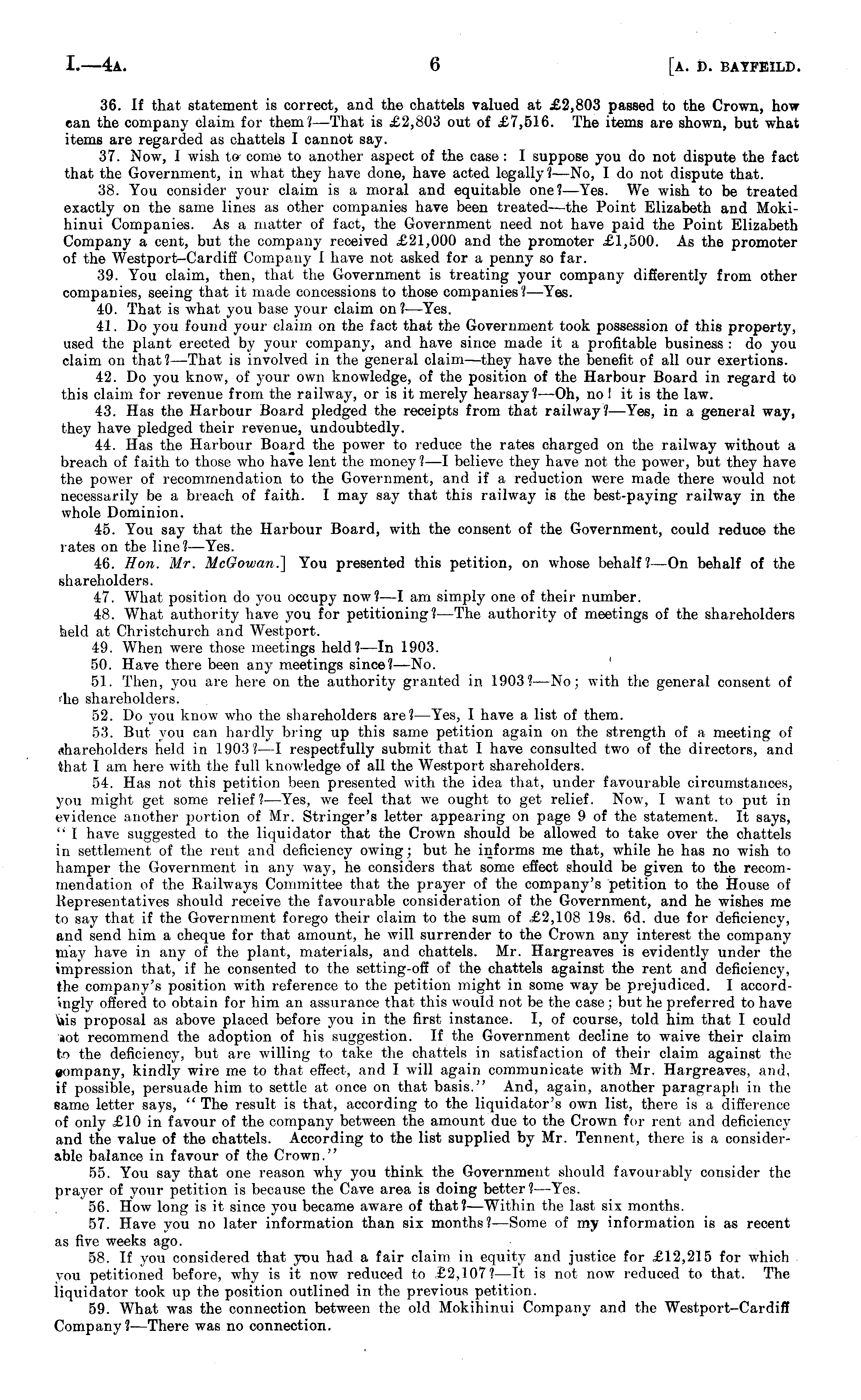 36. If that statement is correct, and the chattels valued at £2,803 passed to the Crown, how can the company claim for them? —That is £2,803 out of £7,516. The items are shown, but what items are regarded as chattels I cannot say. 37. Now, I wish to come to another aspect of the case: I suppose you do not dispute the fact that the Government, in what they have done, have acted legally ?—No, I do not dispute that. 38. You consider your claim is a moral and equitable one?— Yes. We wish to be treated exactly on the same lines as other companies have been treated—the Point Elizabeth and Mokihinui Companies. As a matter of fact, the Government need not have paid the Point Elizabeth Company a cent, but the company received £21,000 and the promoter £1,500. As the promoter of the Westport-Cardifi Company I have not asked for a penny so far. 39. You claim, then, that the Government is treating your company differently from other companies, seeing that it made concessions to those companies I —Yes. 40. That is what you base your claim on ?—Yes. 41. Do you found your claim on the fact that the Government took possession of this property, used the plant erected by your company, and have since made it a profitable business : do you claim on that? —That is involved in the general claim —they have the benefit of all our exertions. 42. Do you know, of your own knowledge, of the position of the Harbour Board in regard to this claim for revenue from the railway, or is it merely hearsay?—Oh, no ! it is the law. 43. Has the Harbour Board pledged the receipts from that railway? —Yes, in a general way, they have pledged their revenue, undoubtedly. 44. Has the Harbour Board the power to reduce the rates charged on the railway without a breach of faith to those who have lent the money I —l believe they have not the power, but they have the power of recommendation to the Government, and if a reduction were made there would not necessarily be a breach of faith. I may say that this railway is the best-paying railway in the whole Dominion. 45. You say that the Harbour Board, with the consent of the Government, could reduce the rates on the line? —Yes. 46. Hon. Mr. MeGoivan.'] You presented this petition, on whose behalf?—On behalf of the shareholders. 47. What position do you occupy now? —I am simply one of their number. 48. What authority have you for petitioning? —The authority of meetings of the shareholders held at Christchuroh and Westport. 49. When were those meetings held? —In 1903. 50. Have there been any meetings since?— No. 51. Then, you are here on the authority granted in 1903?— No; with the general consent of fhe shareholders. 52. Do you know who the shareholders are? —Yes, I have a list of them. 53. But you can hardly bring up this same petition again on the strength of a meeting of shareholders held in 1903?— I respectfully submit that I have consulted two of the directors, and that I am here with the full knowledge of all the Westport shareholders. 54. Has not this petition been presented with the idea that, under favourable circumstances, yon might get some relief?— Yes, we feel that we ought to get relief. Now, I want to put in evidence another portion of Mr. Stringer's letter appearing on page 9of the statement. It says, " I have suggested to the liquidator that the Crown should be allowed to take over the chattels in settlement of the rent and deficiency owing ; but he informs me that, while he has no wish to hamper the Government in any way, he considers that some effect should be given to the recommendation of the Railways Committee that the prayer of the company's petition to the House of Representatives should receive the favourable consideration of the Government, and he wishes me to say that if the Government forego their claim to the sum of £2,108 19s. 6d. due for deficiency, and send him a cheque for that amount, he will surrender to the Crown any interest the company may have in any of the plant, materials, and chattels. Mr. Hargreaves is evidently under the impression that, if he consented to the setting-ofi of the chattels against the rent and deficiency, the company's position with reference to the petition might in some way be prejudiced. I accordingly offered to obtain for him an assurance that this would not be the case; but he preferred to have \»is proposal as above placed before you in the first instance. I, of course, told him that I could aot recommend the adoption of his suggestion. If the Government decline to waive their claim to the deficiency, but are willing to take the chattels in satisfaction of their claim against the company, kindly wire me to that effect, and I will again communicate with Mr. Hargreaves, and, if possible, persuade him to settle at once on that basis." And, again, another paragraph in the same letter says, " The result is that, according to the liquidator's own list, there is a difference of only £10 in favour of the company between the amount due to the Crown for rent and deficiency and the value of the chattels. According to the list supplied by Mr. Tennent, there is a considerable balance in favour of the Crown." 55. You say that one reason why you think the Government should favourably consider the prayer of your petition is because the Cave area is doing better?— Yes. 56. How long is it since you became aware of that? —Within the last six months. 57. Have you no later information than six months? —Some of my information is as recent as five weeks ago. 58. If you considered that you had a fair claim in equity and justice for £12,215 for which you petitioned before, why is it now reduced to £2,107? —It is not now reduced to that. The liquidator took up the position outlined in the previous petition. 59. What was the connection between the old Mokihinui Company and the Westport-Cardiff Company?—There was no connection.