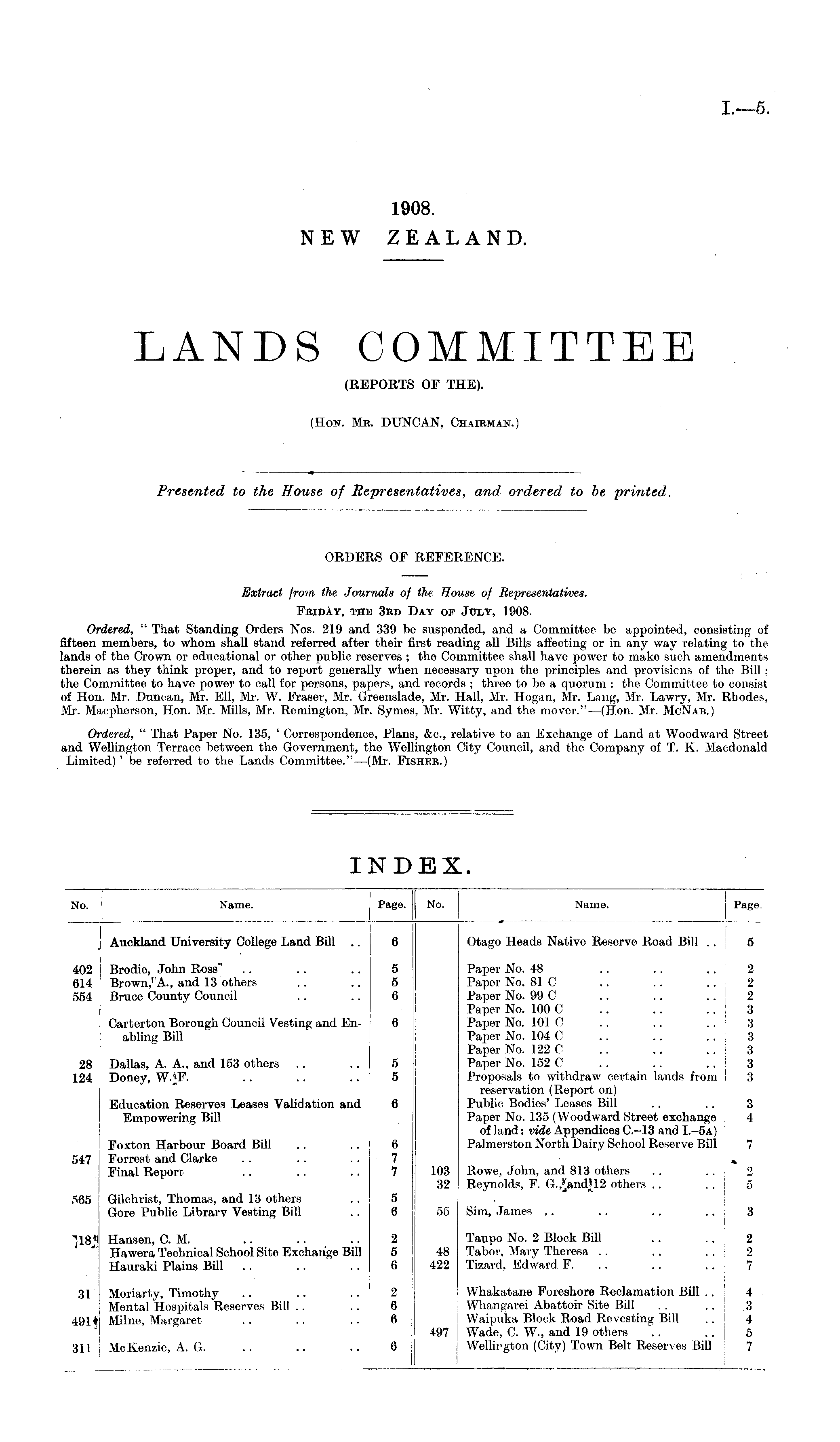 ORDERS OF REFERENCE. Extract from the Journals of the House of Representatives. Friday, the 3rd Day of Jttly, 1908. Ordered, " That Standing Orders Nos. 219 and 339 be suspended, and a Committee be appointed, consisting of fifteen members, to whom shall stand referred after their first reading all Bills affecting or in any way relating to the lands of the Crown or educational or other public reserves ; the Committee shall have power to make such amendments therein as they think proper, and to report generally when necessary upon the principles and provisions of the Bill; the Committee to have power to call for persons, papers, and records ; three to be a quorum : the Committee to consist of Hon. Mr. Duncan, Mr. Ell, Mr. W. Eraser, Mr. Greenslade, Mr. Hall, Mr. Hogan, Mr. Lang, Mr. Lawry, Mr. Rhodes, Mr. Macpherson, Hon. Mr. Mills, Mr. Remington, Mr. Symes, Mr. Witty, and the mover."—(Hon. Mr. McNab.) Ordered, " That Paper No. 135, ' Correspondence, Plans, &c, relative to an Exchange of Land at Woodward Street and Wellington Terrace between the Government, the Wellington City Council, and the Company of T. K. Macdonald Limited) ' be referred to the Lands Committee."—(Mr. Fisher.)