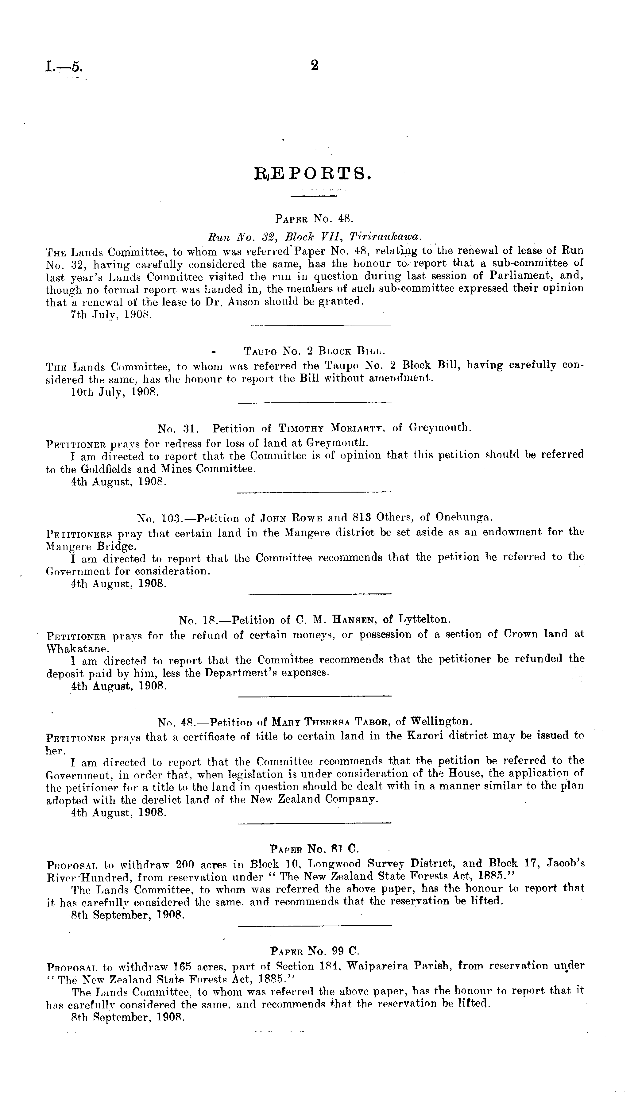 BiEPOETS. Paper No. 48. Bun No. 32, Block VII, Tiriraukawa. The Lands Committee, to whom was refer red' Paper No. 48, relating to the renewal of lease of Run No. 32, having carefully considered the same, has the honour to report that a sub-committee of last year's Lands Committee visited the run in question during last session of Parliament, and, though no formal report was handed in, the members of such sub-committee expressed their opinion that a renewal of the lease to Dr. Anson should be granted. 7th July, 1908. Taupo No. 2 Block Bill. The Lands Committee, to whom was referred the Taupo No. 2 Block Bill, having carefully considered the same, has the honour to report the Bill without amendment. 10th July, 1908. No. 31. —Petition of Timothy Moriahty, of Greymouth. Petitioner prays for redress for loss of land at Greymouth. I am directed to report that the Committee is of opinion that this petition should be referred to the Goldfields and Mines Committee. 4th August, 1908. No. 103. —Petition of John Rowe and 813 Others, of Onehunga. Petitionees pray that certain land in the Mangere district be set aside as an endowment for the Mangere Bridge. I am directed to report that the Committee recommends that the petition be referred to the Government for consideration. 4th August, 1908. No. 18.—Petition of C. M. Hansen, of Lyttelton. Petitioner prays for the refund of certain moneys, or possession of a section of Crown land at Whakatane. I am directed to report that the Committee recommends that the petitioner be refunded the deposit paid by him, less the Department's expenses. 4th August, 1908. No. 48.—Petition of Mary Theresa Tabor, of Wellington. Petitioner prays that a certificate of title to certain land in the Karori district may be issued to her. I am directed to report that the Committee recommends that the petition be referred to the Government, in order that, when legislation is under consideration of the House, the application of the petitioner for a title to the land in question should be dealt with in a manner similar to the plan adopted with the derelict land of the New Zealand Company. 4th August, 1908. Paper No. 81 C. Proposal to withdraw 200 acres in Block 10, Longwood Survey District, and Block 17, Jacob's River-Hundred, from reservation under " The New Zealand State Forests Act, 1885." The Lands Committee, to whom was referred the above paper, has the honour to report that it has carefully considered the same, and recommends that the reservation be lifted. Bth September, 1908. Paper No. 99 C. Proposal to withdraw 165 acres, part of Section 184, Waipareira Parish, from reservation under " The New Zealand State Forests Act, 1885." The Lands Committee, to whom was referred the above paper, has the honour to report that it has carefully considered the same, and recommends that the reservation be lifted. Bth September, 1908.