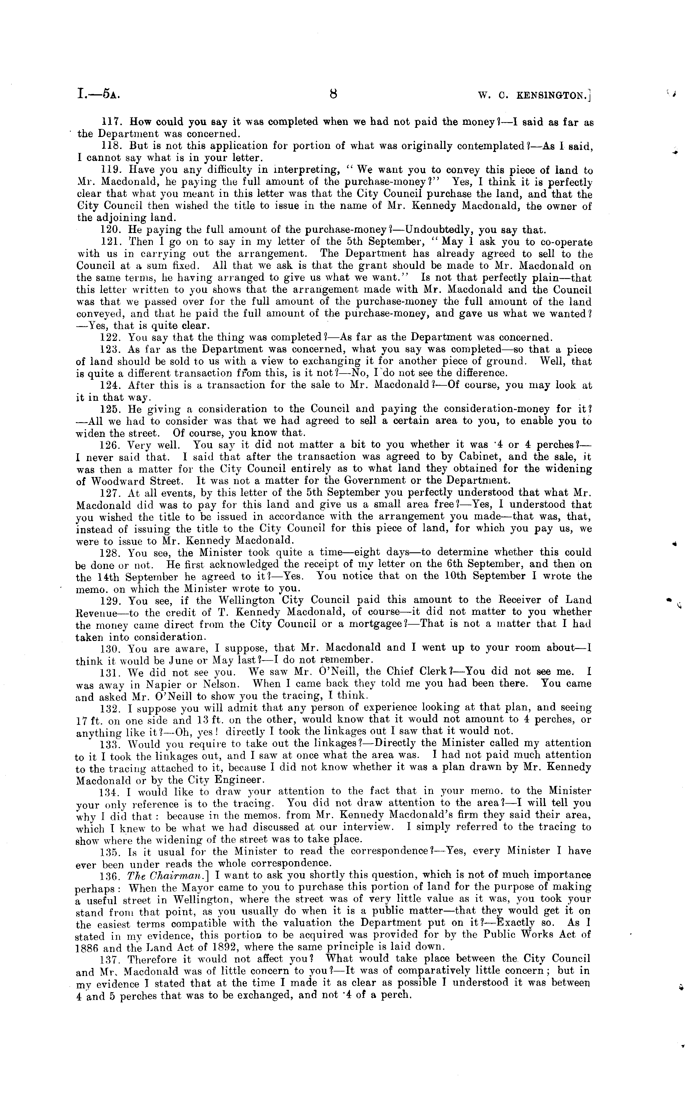 117. How could you say it was completed when we had not paid the money?—l said as far as the Department was concerned. 118. But is not this application for portion of what was originally contemplated?—As 1 said, 1 cannot say what is in your letter. 119. Have you any difficulty in interpreting, " We want you to convey this piece of land to Mr. Macdonald, he paying the full amount of the purchase-money?" Yes, I think it is perfectly clear that what you meant in this letter was that the City Council purchase the land, and that the City Council then wished the title to issue in the name of Mr. Kennedy Macdonald, the owner of the adjoining land. 120. He paying the full amount of the purchase-money?— Undoubtedly, you say that. 121. Then I go on to say in my letter of the sth September, " May 1 ask you to co-operate with us in carrying out the arrangement. The Department has already agreed to sell to the Council at a sum fixed. All that we ask is that the grant should be made to Mr. Macdonald on the same terms, he having arranged to give us what we want." Is not that perfectly plain—that this letter written to you shows that the arrangement made with Mr. Macdonald and the Council was that we passed over for the full amount of the purchase-money the full amount of the land conveyed, and that he paid the full amount of the purchase-money, and gave us what we wanted ? —Yes, that is quite clear. 122. You say that the thing was completed?—As far as the Department was concerned. 123. As far as the Department was concerned, what you say was completed—so that a piece of land should be sold to us with a view to exchanging it for another piece of ground. Well, that is quite a different transaction from this, is it not?—No, Fdo not see the difference. 124. After this is a transaction for the sale to Mr. Macdonald?-—Of course, you may look at it in that way. 125. He giving a consideration to the Council and paying the consideration-money for it? —All we had to consider was that we had agreed to sell a certain area to you, to enable you to widen the street. Of course, you know that. 126. Very well. You say it did not matter a bit to you whether it was '4 or 4 perches?— I never said that. I said that after the transaction was agreed to by Cabinet, and the sale, it was then a matter for the City Council entirely as to what land they obtained for the widening of Woodward Street. It was not a matter for the Government or the Department. 127. At all events, by this letter of the sth September you perfectly understood that what Mr. Macdonald did was to pay for this land and give us a small area free? —Yes, I understood that you wished the title to be issued in accordance with the arrangement you made—that was, that, instead of issuing the title to the City Council for this piece of land, for which you pay us, we were to issue to Mr. Kennedy Macdonald. 128. You see, the Minister took quite a time —eight days—to determine whether this could be done or not. He first acknowledged the receipt of my letter on the 6th September, and then on the 14th September he agreed to it? —Yes. You notice that on the 10th September I wrote the memo, on which the Minister wrote to you. 129. You see, if the Wellington City Council paid this amount to the Receiver of Land Revenue —to the credit of T. Kennedy Macdonald, of course —it did not matter to you whether the money came direct from the City Council or a mortgagee?— That is not a matter that I had taken into consideration. 130. Y r ou are aware, I suppose, that Mr. Macdonald and I went up to your room about—l think it would be June or May last?—l do not remember. 131. We did not see you. We saw Mr. O'Neill, the Chief Clerk? —You did not see me. I was away in Napier or Nelson. When I came back they told me you had been there. You came and asked Mr. O'Neill to show you the tracing, I think. 132. I suppose you will admit that any person of experience looking at that plan, and seeing 17 ft. on one side and 13 ft. on the other, would know that it would not amount to 4 perches, or anything like it?—Oh, yes ! directly I took the linkages out I saw that it would not. 133. Would you require to take out the linkages? —Directly the Minister called my attention to it I took the linkages out, and I saw at once what the area was. I had not paid much attention to the tracing attached to it, because I did not know whether it was a plan drawn by Mr. Kennedy Macdonald or by the City Engineer. 134. I would like to draw your attention to the fact that in your memo, to the Minister your only reference is to the tracing. You did not draw attention to the area?—l will tell you why 1 did that : because in the memos, from Mr. Kennedy Macdonald's firm they said their area, which I knew to be what we had discussed at our interview. I simply referred to the tracing to show where the widening of the street was to take place. 135. Is it usual for the Minister to read the correspondence?— Yes, every Minister I have ever been under reads the whole correspondence. 136. The Chairman.] I want to ask you shortly this question, which is not of much importance perhaps : When the Mayor came to you to purchase this portion of land for the purpose of making a useful street in Wellington, where the street was of very little value as it was, you took your stand from that point, as you usually do when it is a public matter—that they would get it on the easiest terms compatible with the valuation the Department put on it?— Exactly so. As I stated in my evidence, this portion to be acquired was provided for by the Public Works Act of 1886 and the Land Act of 1892, where the same principle is laid down. 137. Therefore it would not affect you? What would take place between the City Council and Mr. Macdonald was of little concern to you?—lt was of comparatively little concern; but in mv evidence I stated that at the time I made it as clear as possible I understood it was